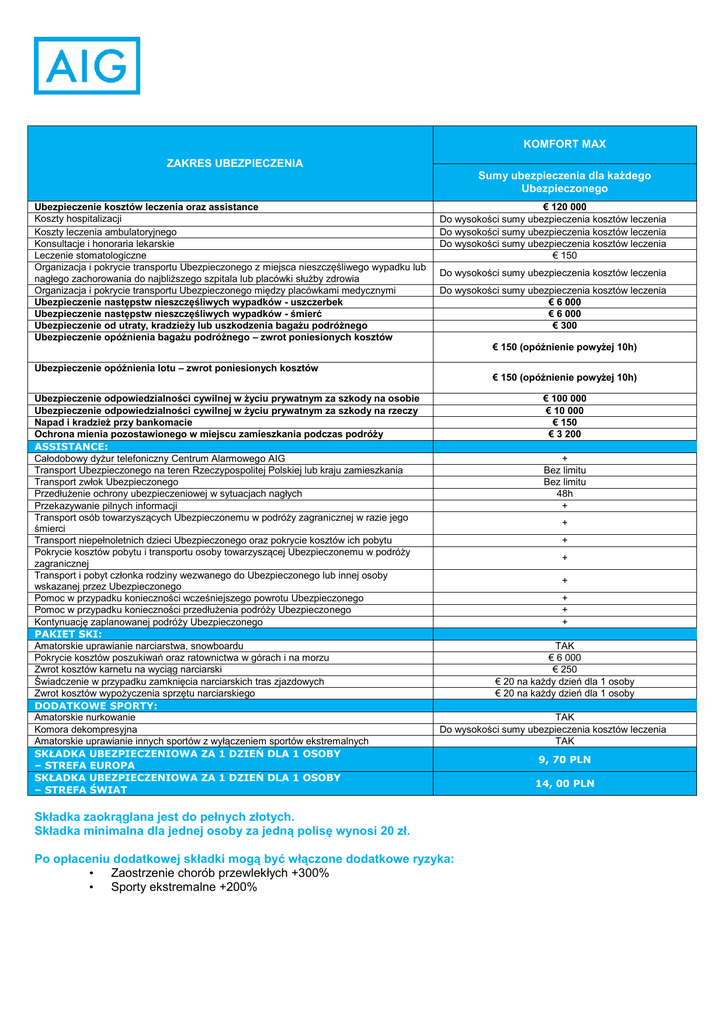 KOMFORT MAX ZAKRES UBEZPIECZENIA Sumy ubezpieczenia dla każdego Ubezpieczonego Ubezpieczenie kosztów leczenia oraz assistance Koszty hospitalizacji Koszty leczenia ambulatoryjnego Konsultacje i honoraria lekarskie Leczenie stomatologiczne Organizacja i pokrycie transportu Ubezpieczonego z miejsca nieszczęśliwego wypadku lub nagłego zachorowania do najbliższego szpitala lub placówki służby zdrowia Organizacja i pokrycie transportu Ubezpieczonego między placówkami medycznymi Ubezpieczenie następstw nieszczęśliwych wypadków - uszczerbek Ubezpieczenie następstw nieszczęśliwych wypadków - śmierć Ubezpieczenie od utraty, kradzieży lub uszkodzenia bagażu podróżnego Ubezpieczenie opóźnienia bagażu podróżnego – zwrot poniesionych kosztów € 120 000 Do wysokości sumy ubezpieczenia kosztów leczenia Do wysokości sumy ubezpieczenia kosztów leczenia Do wysokości sumy ubezpieczenia kosztów leczenia € 150 Do wysokości sumy ubezpieczenia kosztów leczenia Do wysokości sumy ubezpieczenia kosztów leczenia € 6 000 € 6 000 € 300 € 150 (opóźnienie powyżej 10h) Ubezpieczenie opóźnienia lotu – zwrot poniesionych kosztów Ubezpieczenie odpowiedzialności cywilnej w życiu prywatnym za szkody na osobie Ubezpieczenie odpowiedzialności cywilnej w życiu prywatnym za szkody na rzeczy Napad i kradzież przy bankomacie Ochrona mienia pozostawionego w miejscu zamieszkania podczas podróży ASSISTANCE: Całodobowy dyżur telefoniczny Centrum Alarmowego AIG Transport Ubezpieczonego na teren Rzeczypospolitej Polskiej lub kraju zamieszkania Transport zwłok Ubezpieczonego Przedłużenie ochrony ubezpieczeniowej w sytuacjach nagłych Przekazywanie pilnych informacji Transport osób towarzyszących Ubezpieczonemu w podróży zagranicznej w razie jego śmierci Transport niepełnoletnich dzieci Ubezpieczonego oraz pokrycie kosztów ich pobytu Pokrycie kosztów pobytu i transportu osoby towarzyszącej Ubezpieczonemu w podróży zagranicznej Transport i pobyt członka rodziny wezwanego do Ubezpieczonego lub innej osoby wskazanej przez Ubezpieczonego Pomoc w przypadku konieczności wcześniejszego powrotu Ubezpieczonego Pomoc w przypadku konieczności przedłużenia podróży Ubezpieczonego Kontynuację zaplanowanej podróży Ubezpieczonego PAKIET SKI: Amatorskie uprawianie narciarstwa, snowboardu Pokrycie kosztów poszukiwań oraz ratownictwa w górach i na morzu Zwrot kosztów karnetu na wyciąg narciarski Świadczenie w przypadku zamknięcia narciarskich tras zjazdowych Zwrot kosztów wypożyczenia sprzętu narciarskiego DODATKOWE SPORTY: Amatorskie nurkowanie Komora dekompresyjna Amatorskie uprawianie innych sportów z wyłączeniem sportów ekstremalnych SKŁADKA UBEZPIECZENIOWA ZA 1 DZIEŃ DLA 1 OSOBY – STREFA EUROPA SKŁADKA UBEZPIECZENIOWA ZA 1 DZIEŃ DLA 1 OSOBY – STREFA ŚWIAT € 150 (opóźnienie powyżej 10h) € 100 000 € 10 000 € 150 € 3 200 + Bez limitu Bez limitu 48h + + + + + + + + TAK € 6 000 € 250 € 20 na każdy dzień dla 1 osoby € 20 na każdy dzień dla 1 osoby TAK Do wysokości sumy ubezpieczenia kosztów leczenia TAK Składka zaokrąglana jest do pełnych złotych. Składka minimalna dla jednej osoby za jedną polisę wynosi 20 zł. Po opłaceniu dodatkowej składki mogą być włączone dodatkowe ryzyka: • Zaostrzenie chorób przewlekłych +300% • Sporty ekstremalne +200% 9, 70 PLN 14, 00 PLN Główne Plusy Produktu 1. Bardzo wysokie sumy ubezpieczenia dające gwarancję pełnego pokrycia kosztów leczenia za granicą. 2. Gwarancja przetransportowania osoby do Polski - transport medyczny oraz transport zwłok do Polski "bez limitu" tzn. nie pomniejszają sumy ubezpieczenia kosztów leczenia. 3. Koszty leczenia - brak udziału własnego, pokrycie kosztów już od 1 zł. 4. Obsługa bezgotówkowa – Klient będąc za granicą ma organizowaną pomoc np. wizytę lekarską i koszty pokrywane są bezpośrednio przez Centrum Alarmowe AIG. 5. Ubezpieczenie kosztów rezygnacji z biletu lotniczego, imprezy, nie jest uzależnione od ich ceny imprezy, przez co ubezpieczenie jest tańsze dla Klientów. 6. Przedłużenie ochrony ubezpieczeniowej w sytuacjach nagłych o 48h – Jeżeli Klient z przyczyn od siebie niezależnych nie może wrócić do Polski (np. odwołany lot z powodu złych warunków atmosferycznych) wówczas przedłużana jest ochrona ubezpieczeniowa o 48 h. Klient otrzymuje 2 dni gratis ochrony. 7. Amatorskie uprawnie narciarstwa, snowboardu bez zwyżki składki za to ryzyko. 8. Amatorskie uprawnie nurkowania bez zwyżki składki za to ryzyko. 9. Wszystkie sporty uprawiane amatorsko w standardzie ubezpieczenia bez opłacania dodatkowej składki. 10. Wykonywanie pracy umysłowej (wyjazdy biznesowe) w standardzie ubezpieczenia, we wszystkich wariantach 11. OC nie tylko dla osób uprawiających sporty – ubezpieczenie OC włączone jest w każdym wariancie. 13. Chronimy mienie ruchome Ubezpieczonego pozostawione w miejscu zamieszkania na czas wyjazdu. 14. Chronimy gotówkę wypłaconą z bankomatu i utraconą przez Ubezpieczonego w wyniku kradzieży lub rabunku podczas podróży zagranicznej - ubezpieczenie obejmuje gotówkę wypłaconą z bankomatów na całym Świecie z wyłączeniem bankomatów znajdujących się na terytorium Rzeczypospolitej Polskiej i w kraju stałego zamieszkania Ubezpieczonego.
