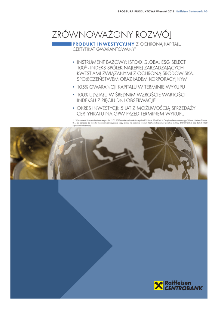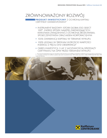 BROSZURA PRODUKTOWA Wrzesień 2015 Raiffeisen Centrobank AG ZRÓWNOWAŻONY ROZWÓJ PRODUKT INWEST YCYJNY Z OCHRONĄ KAPITAŁU CERTYFIKAT GWARANTOWANY1 ▪▪ INSTRUMENT BAZOWY: ISTOXX GLOBAL ESG SELECT 100® - INDEKS SPÓLEK NAJLEPIEJ ZARZADZAJĄCYCH KWESTIAMI ZWIĄZANYMI Z OCHRONĄ ŚRODOWISKA, SPOŁECZEŃSTWEM ORAZ ŁADEM KORPORACYJNYM ▪▪ 105% GWARANCJI KAPITAŁU W TERMINIE WYKUPU ▪▪ 100% UDZIAŁU W ŚREDNIM WZROŚCIE WARTOŚCI INDEKSU Z PIĘCIU DNI OBSERWACJI2 ▪▪ OKRES INWESTYCJI: 5 LAT Z MOŻLIWOŚCIĄ SPRZEDAŻY CERTYFIKATU NA GPW PRZED TERMINEM WYKUPU 1 … W rozumieniu Prospektu Podstawowego z dn. 12.05.2015 oraz Warunków Końcowych nr 8298 z dn. 25.08.2015r. Certyfikat Gwarantowany typu Winner z Limitem Górnym. 2 … Co oznacza, że Inwestor ma możliwość uzyskania stopy zwrotu na poziomie równym 100% średniej stopy zwrotu z indeksu iSTOXX Global ESG Select 100® z pięciu dni obserwacji. Raiffeisen Centrobank AG Zrównoważony Rozwój WZROSTOWY POTENCJAŁ SPÓŁEK Z INDEKSU ISTOXX GLOBAL ESG SELECT 100® Inwestycja w certyfikat strukturyzowany RCB – Zrównoważony Rozwój, daje Inwestorowi możliwość uzyskania stopy zwrotu na poziomie 100% średniej stopy zwrotu indeksu iSTOXX Global ESG Select 100® z pięciu dni obserwacji. W przypadku, gdy średnia stopa zwrotu indeksu jest ujemna lub równa 0% Inwestor w dniu wykupu otrzymuje zwrot w wysokości 105% zainwestowanego kapitału (wyłączając opłatę subskrypcyjną). NAJWAŻNIEJSZE INFORMACJE Emitent Raiffeisen Centrobank AG Gwarant* Raiffeisen Centrobank AG ISIN AT0000A1FWN4 Wartość nominalna 1000 zł Cena emisyjna 1000 zł Opłata subskrypcyjna maks. 10 zł Min. wielkość zapisu 5 certyfikatów Subskrypcja1 01.09 - 29.09.2015 Dzień pierwszej wyceny 30.09.2015 Dzień ostatecznej wyceny 29.09.2020 Dzień wykupu 01.10.2020 Ochrona kapitału 105% w dniu wykupu Wartość gwarantowana 1050 zł w dniu wykupu Obserwacja roczna Dni obserwacji29.09.2016, 29.09.2017, 01.10.2018, 30.09.2019, 29.09.2020 Współczynnik partycypacji 100% Kwota wykupu Inwestor otrzymuje sumę wartości gwarantowanej 1050 zł oraz iloczynu ceny emisyjnej, współczynnika udziału i średniej stopy zwrotu indeksu z pięciu dni obserwacji (ponad 100% stanu początkowego indeksu) lub, w przypadku gdy stopa zwrotu indeksu wyniesie poniżej 100% stanu początkowego, wypłatę wartości gwarantowanej równej 1050 zł za każdy Certyfikat (wykup przez Raiffeisen Centrobank AG* w terminie zapadalności). Notowania GPW2 Aktualna cena www.rcb.at * Raiffeisen Centrobank AG należy w 100 % do Raiffeisen Bank International AG – rating RBI: www.rbinternational.com/ir/ratings 1. Raiffeisen Centrobank AG zastrzega sobie przedwczesne zakończenie lub przedłużenie okresu subskrypcji. 2. Intencją Emitenta jest ubieganie się o dopuszczenie Certyfikatów do obrotu na GPW. Indeks iSTOXX Global ESG Select 100® odzwierciedla wycenę spółek z Ameryki Północnej, Europy, Azji i Australii najlepiej ocenianych pod względem zarządzania kwestiami związanymi z ochroną środowiska, społeczeństwem i ładem korporacyjnym, które wpływają na potencjalny wzrost wartości przedsiębiorstwa, a tym samym atrakcyjność inwestycyjną. Przedsiębiorstwa stosujące koncepcję zrównoważonego rozwoju kładą nacisk na tworzenie innowacyjnych strategii realizujących efektywne i skuteczne zarządzanie oraz odpowiedzialne inwestycje, kierując się dewizą maksymalizacji użyteczności społeczno - środowiskowej przy jednoczesnej maksymalizacji rentowności. Zrównoważony Rozwój to produkt dla Inwestorów, którzy oczekują dalszego wzrostu wartości spółek wchodzących w skład indeksu, ale obawiają się możliwych korekt cen ich akcji w okresie najbliższych pięciu lat. iSTOXX Global ESG Select 100® ▫▫ Indeks obliczany jest od września 2004 r. przez STOXX Limited jako indeks cenowy ▫▫ Indeks łączy zalety z trzech strategii: niska zmienność, wysoka dywidenda i zrównoważony rozwój ▫▫ Indeks składa się z akcji 100 spółek z Europy (44,3%), Ameryki Północnej (40,2%) i Australii (13,8%) ▫▫ Maksymalna waga udziału w indeksie to 10% dla jednej spółki. Aktualizacja indeksu odbywa się raz w roku, we wrześniu. Zasady funkcjonowania Potencjalny zysk dla Inwestora zależny jest od średniego wzrostu indeksu z pięciu dni obserwacji (odpowiednio 29.09.2016, 29.09.2017, 01.10.2018, 30.09.2019 oraz 29.09.2020). W dniu pierwszej wyceny (30.09.2015) określony zostaje kurs początkowy indeksu iSTOXX Global ESG Select 100® (kurs zamknięcia). Raz w roku – w wyznaczonych dniach obserwacji – weryfikowany jest kurs zamknięcia indeksu, który następnie jest porównywany z jego kursem początkowym w celu wyliczenia procentowej stopy zwrotu. W terminie wykupu wyliczana jest średnia stopa zwrotu indeksu iSTOXX Global ESG Select 100® z pięciu dni obserwacji. W ten sposób dokonuje się wyliczenia stopy zwrotu dla posiadacza Certyfikatu. Uśrednienie stóp zwrotu daje Inwestorowi szansę na pozytywną stopę zwrotu, nawet gdy w więcej niż jednym z pięciu dni obserwacji kurs indeksu zanotuje spadek (w porównaniu z kursem początkowym). Jeśli tak obliczona zmiana ma wartość dodatnią, wówczas wypłatę stanowi suma wartości gwarantowanej 1050 zł oraz iloczynu ceny emisyjnej, współczynnika udziału i średniej stopy zwrotu indeksu z pięciu dni obserwacji. W przypadku uzyskania zerowej lub ujemnej średniej stopy zwrotu, kapitał Inwestora chroniony jest w 105% ceny emisyjnej Certyfikatu, czyli Inwestor otrzyma 1050 zł za każdy Certyfikat. www.rcb.at ISTOXX GLOBAL ESG SELECT 100® Wagi sektorów w indeksie Energetyka Surowce Użyteczność 2,2% 1,5% publiczna 3,5% Kapitał jest chroniony wyłącznie w dniu wykupu w wysokości 105% ceny emisyjnej Certyfikatu. Przed terminem wykupu może dojść do wahań wartości rynkowej Certyfikatu poniżej wartości nominalnej, lecz w dniu wykupu Inwestor otrzyma minimalnie 105% ceny 