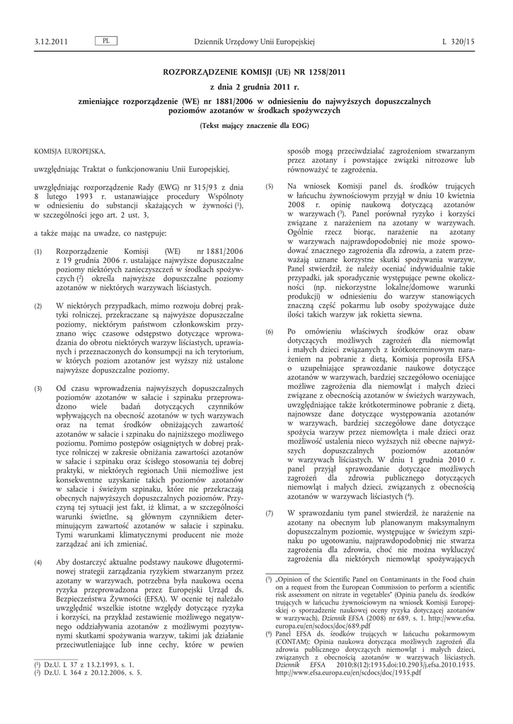 3.12.2011 PL Dziennik Urzędowy Unii Europejskiej L 320/15 ROZPORZĄDZENIE KOMISJI (UE) NR 1258/2011 z dnia 2 grudnia 2011 r. zmieniające rozporządzenie (WE) nr 1881/2006 w odniesieniu do najwyższych dopuszczalnych poziomów azotanów w środkach spożywczych (Tekst mający znaczenie dla EOG) sposób mogą przeciwdziałać zagrożeniom stwarzanym przez azotany i powstające związki nitrozowe lub równoważyć te zagrożenia. KOMISJA EUROPEJSKA, uwzględniając Traktat o funkcjonowaniu Unii Europejskiej, uwzględniając rozporządzenie Rady (EWG) nr 315/93 z dnia 8 lutego 1993 r. ustanawiające procedury Wspólnoty w odniesieniu do substancji skażających w żywności (1), w szczególności jego art. 2 ust. 3, (5) Na wniosek Komisji panel ds. środków trujących w łańcuchu żywnościowym przyjął w dniu 10 kwietnia 2008 r. opinię naukową dotyczącą azotanów w warzywach (3). Panel porównał ryzyko i korzyści związane z narażeniem na azotany w warzywach. Ogólnie rzecz biorąc, narażenie na azotany w warzywach najprawdopodobniej nie może spowo dować znacznego zagrożenia dla zdrowia, a zatem prze ważają uznane korzystne skutki spożywania warzyw. Panel stwierdził, że należy oceniać indywidualnie takie przypadki, jak sporadycznie występujące pewne okolicz ności (np. niekorzystne lokalne/domowe warunki produkcji) w odniesieniu do warzyw stanowiących znaczną część pokarmu lub osoby spożywające duże ilości takich warzyw jak rokietta siewna. (6) Po omówieniu właściwych środków oraz obaw dotyczących możliwych zagrożeń dla niemowląt i małych dzieci związanych z krótkoterminowym nara żeniem na pobranie z dietą, Komisja poprosiła EFSA o uzupełniające sprawozdanie naukowe dotyczące azotanów w warzywach, bardziej szczegółowo oceniające możliwe zagrożenia dla niemowląt i małych dzieci związane z obecnością azotanów w świeżych warzywach, uwzględniające także krótkoterminowe pobranie z dietą, najnowsze dane dotyczące występowania azotanów w warzywach, bardziej szczegółowe dane dotyczące spożycia warzyw przez niemowlęta i małe dzieci oraz możliwość ustalenia nieco wyższych niż obecne najwyż szych dopuszczalnych poziomów azotanów w warzywach liściastych. W dniu 1 grudnia 2010 r. panel przyjął sprawozdanie dotyczące możliwych zagrożeń dla zdrowia publicznego dotyczących niemowląt i małych dzieci, związanych z obecnością azotanów w warzywach liściastych (4). (7) W sprawozdaniu tym panel stwierdził, że narażenie na azotany na obecnym lub planowanym maksymalnym dopuszczalnym poziomie, występujące w świeżym szpi naku po ugotowaniu, najprawdopodobniej nie stwarza zagrożenia dla zdrowia, choć nie można wykluczyć zagrożenia dla niektórych niemowląt spożywających a także mając na uwadze, co następuje: (1) Rozporządzenie Komisji (WE) nr 1881/2006 z 19 grudnia 2006 r. ustalające najwyższe dopuszczalne poziomy niektórych zanieczyszczeń w środkach spożyw czych (2) określa najwyższe dopuszczalne poziomy azotanów w niektórych warzywach liściastych. (2) W niektórych przypadkach, mimo rozwoju dobrej prak tyki rolniczej, przekraczane są najwyższe dopuszczalne poziomy, niektórym państwom członkowskim przy znano więc czasowe odstępstwo dotyczące wprowa dzania do obrotu niektórych warzyw liściastych, uprawia nych i przeznaczonych do konsumpcji na ich terytorium, w których poziom azotanów jest wyższy niż ustalone najwyższe dopuszczalne poziomy. (3) (4) Od czasu wprowadzenia najwyższych dopuszczalnych poziomów azotanów w sałacie i szpinaku przeprowa dzono wiele badań dotyczących czynników wpływających na obecność azotanów w tych warzywach oraz na temat środków obniżających zawartość azotanów w sałacie i szpinaku do najniższego możliwego poziomu. Pomimo postępów osiągniętych w dobrej prak tyce rolniczej w zakresie obniżania zawartości azotanów w sałacie i szpinaku oraz ścisłego stosowania tej dobrej praktyki, w niektórych regionach Unii niemożliwe jest konsekwentne uzyskanie takich poziomów azotanów w sałacie i świeżym szpinaku, które nie przekraczają obecnych najwyższych dopuszczalnych poziomów. Przy czyną tej sytuacji jest fakt, iż klimat, a w szczególności warunki świetlne, są głównym czynnikiem deter minującym zawartość azotanów w sałacie i szpinaku. Tymi warunkami klimatycznymi producent nie może zarządzać ani ich zmieniać. Aby dostarczyć aktualne podstawy naukowe długotermi nowej strategii zarządzania ryzykiem stwarzanym przez azotany w warzywach, potrzebna była naukowa ocena ryzyka przeprowadzona przez Europejski Urząd ds. Bezpieczeństwa Żywności (EFSA). W ocenie tej należało uwzględnić wszelkie istotne względy dotyczące ryzyka i korzyści, na przykład zestawienie możliwego negatyw nego oddziaływania azotanów z możliwymi pozytyw nymi skutkami spożywania warzyw, takimi jak działanie przeciwutleniające lub inne cechy, które w pewien (1) Dz.U. L 37 z 13.2.1993, s. 1. (2) Dz.U. L 364 z 20.12.2006, s. 5. (3) „Opinion of the Scientific Panel on Contaminants in the Food chain on a request from the European Commission to perform a scientific risk assessment on nitrate in vegetables” (Opinia panelu ds. środków trujących w łańcuchu żywnościowym na wniosek Komisji Europej skiej o sporzadzenie naukowej oceny ryzyka dotyczącej azotanów w warzywach), Dziennik EFSA (2008) nr 689, s. 1. http://www.efsa. europa.eu/en/scdocs/doc/689.pdf (4) Panel EFSA ds. środków trujących w łańcuchu pokarmowym (CONTAM); Opinia naukowa dotycząca możliwych zagrożeń dla zdrowia publicznego dotyczących niemowląt i małych dzieci, związanych z obecnością azotanów w warzywach liściastych. Dziennik EFSA 2010;8(12):1935.doi:10.2903/j.efsa.2010.1935. http://www.efsa.europa.eu/en/scdocs/doc/1935.pdf L 320/16 PL Dziennik Urzędowy Unii Europejskiej szpinak więcej niż raz dziennie. EFSA zauważył, że n
