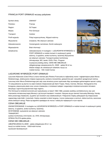 FRANCJA PORT GRIMAUD wczasy pobytowe Symbol oferty: 239/6437 Państwo: Francja Region: St.Tropez Miasto: Port Grimaud Transport: Autokar Profil wyjazdu: Pobyt wypoczynkowy, Wyjazd rodzinny Wyżywienie: śniadanie, We własnym zakresie Zakwaterowanie: Camping/pole namiotowe, Domki wakacyjne Wyposażenie: Brak informacji świadczenia: Zakwaterowanie: 9 noclegów LAZUROWYM WYBRZEŻU w PORT GRIMAUD w mobile-homach 4-osobowych (pokój dzienny, 2 sypialnie, aneks kuchenny, łazienka),Wyżywienie: we własnym zakresie; Transport:autokar komfortowy (klimatyzacja, WC, barek, DVD); Pilot,: Program turystyczny:według oferty, CENA NIE OBEJMUJE: - obligatoryjnego ubezpieczenia KL, NNW - opłata 50 zł/ os, biletów wstępu do zwiedzanych obiektów; kaucji za mobile-homes - 100/mobil-homes LAZUROWE WYBRZEŻE PORT GRIMAUD Lazurowe Wybrzeże (Cote D'Azur) znane również jako Riwiera Francuska to najbardziej znane i najpiękniejsze plaże Morza Śródziemnego, ekskluzywne miejsce wypoczynku zarówno monarchów, gwiazd kina jak i wszystkich spragnionych słońca. Lazurowy kolor Morza Śródziemnego jest cały czas strzeżony przez szpiczaste Alpy wyrastające gdzieniegdzie wprost z plaży. To tutaj położone są słynne na całym świecie miejscowości jak Saint Tropez, Nicea, Cannes, Monaco. Nieregularna linia brzegowa, piaszczyste plaże oraz urocze miasteczka z mnóstwem kafejek i wspaniałym śródziemnomorskim klimatem decydują o ogromnej popularności tego regionu. Port Grimaud to śródziemnomorski port wybudowany w latach 1963-1966, posiada osobliwy architektoniczny styl, jest mianowicie miniaturową kopią Wenecji z jej licznymi kanałami i mostami. Nazywa się go również francuską Wenecją. Kanały, które przecinają miasteczko, są pełne ryb morskich oraz słodkowodnych. Połączenie między półwyspami tej miejscowości zapewniają małe łódki i motorówki. Każdy czwartek to dzień targowy. Liczne restauracje w centrum, dobra kuchnia, sezonowa oferta świeżych ostryg. Plaże są łagodnie opadające do morza i należą do najlepszych w tym rejonie. CENA OBEJMUJE ZAKWATEROWANIE: 9 noclegów na LAZUROWYM WYBRZEŻU w PORT GRIMAUD w mobile-homach 4-osobowych (pokój dzienny, 2 sypialnie, aneks kuchenny, łazienka), WYŻYWIENIE: wyżywienie we własnym zakresie; TRANSPORT: autokar komfortowy (mini-barek, wc, DVD, klimatyzacja); OPIEKA PILOTA opieka pilota; CENA NIE OBEJMUJE : UBEZPIECZENIA KL,NNW - opłata obligatoryjna 50 zł / os kaucji za mobile-homes - 100€/mobil-homes wycieczek fakultatywnych 1/3 INFORMACJE DODATKOWE Trasa przejazdu: Czechy, Austria, Włochy, Francja Cena obowiązuje przy 40 osobach pełnopłatnych; Szczegółowy program zwiedzania ustala pilot. Pilot nie oprowadza wewnątrz obiektów i po muzeach Wycieczki fakultatywne: Monaco, Monte Carlo, Cannes - wycieczka całodniowa ze zwiedzaniem wytwórni perfum w Eze - ok. 35 Euro; Saint Tropez - wycieczka kilkugodzinna - ok. 15 Euro; Wielki Kanion du Verdon -ok. 30 Euro (+koszt wynajęcia łódek);Arles, Avignon oraz pont du Gard - ok 36 euro. Należy zabrać własną bieliznę pościelową i ręczniki oraz środki higieny i czystości (opcjonalnie za dopłatą 8€ bielizna pościelowa, 4€ ręczniki - tylko za wcześniejszym zgłoszeniem w biurze) Każdy Uczestnik jest zobowiązany do posiadania dowodu tożsamości (paszport, dowód osobisty lub tymczasowy) ważnego minimum pół roku od daty powrotu z imprezy. Doba hotelowa rozpoczyna się o godz. 16.00, a kończy o godz. 09.00. Podczas oczekiwania na zakwaterowanie uczestnicy składają bagaże we wskazanym przez pilota miejscu. TERMINY: od: 2017-09-04 do: 2017-09-15 (12 dni), miejsca: sprawdź miejsca cena od: 1390 PLN CENNIK: Długość pobytu: 12 dni Grupa cenowa: A Transport (obligatoryjny) (*) autokar (-) Miasto wyjazdowe (do wyboru) (*) Opole Parking na rogu ul. 1-maja i Duboisa (parking za Biedronką) (01:15) Gliwice Stacja Benzynowa SHElL ul. Rynicka 159 (02:30) Piotrków Trybunalski STACJA STATOIL NA TRASIE KATOWICKIEJ (01:15) Łódź parking przy Dworcu Łódż Kaliska (00:15) (-) 50 80 90 Katowice dworzec PKS UL.P.SKARGI (03:15) 60 Legnica 90 Częstochowa ALEJA WOJSKA PLSKIEGO 265, STACJA BP MC DONALDS W STRONĘ KATOWIC (03:15) 70 Warszawa PKiN - PArking k. Muzeum Techniki (00:15) 100 Wrocław SKWER JOANITÓW I DAWIDA UWAGA WYJAZD ZIEN WCZĘSNIEJ NIŻ DATA ROZPOCZĘCIA IMPREZY (23:45*) (-) Bielsko-Biała STACJA BENZYNOWA PRZY TESCO UL. WARSZAWSKA 180 (04:15) (-) Poznań ul. Dworcowa (parking przy Dworcu Letnim) UWAGA WYJAZD DZIEN WCZĘSNIEJ NIZ DATA ROZPOCZĘCIA IMPREZY (21:00*) 90 Kraków Stacja Benzynowa Arge ul. Pasternik 66 w kierunku na A4 (02:00) 90 Rodzaj osoby (do wyboru) (*) osoba w mobil-homie 1390 Ubezpieczenie (do wyboru) UBZP. KL, NNW 50 Waluta: PLN 2/3 Aktualne ceny z systemu S.A.R.T. (-) - cena usługi, podatku kalkulowana przy osobie lub gratis (*) - kwota wliczona w cenę standardową 3/3