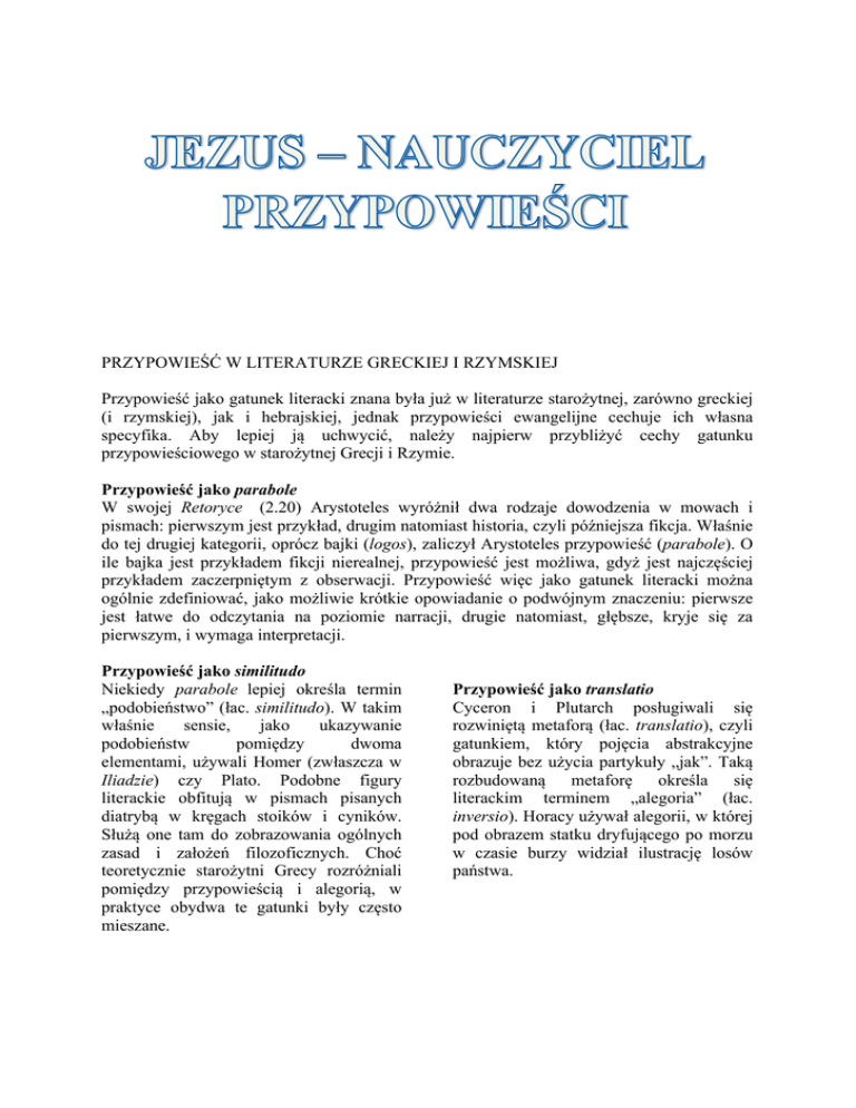 PRZYPOWIEŚĆ W LITERATURZE GRECKIEJ I RZYMSKIEJ Przypowieść jako gatunek literacki znana była już w literaturze starożytnej, zarówno greckiej (i rzymskiej), jak i hebrajskiej, jednak przypowieści ewangelijne cechuje ich własna specyfika. Aby lepiej ją uchwycić, należy najpierw przybliżyć cechy gatunku przypowieściowego w starożytnej Grecji i Rzymie. Przypowieść jako parabole W swojej Retoryce (2.20) Arystoteles wyróżnił dwa rodzaje dowodzenia w mowach i pismach: pierwszym jest przykład, drugim natomiast historia, czyli późniejsza fikcja. Właśnie do tej drugiej kategorii, oprócz bajki (logos), zaliczył Arystoteles przypowieść (parabole). O ile bajka jest przykładem fikcji nierealnej, przypowieść jest możliwa, gdyż jest najczęściej przykładem zaczerpniętym z obserwacji. Przypowieść więc jako gatunek literacki można ogólnie zdefiniować, jako możliwie krótkie opowiadanie o podwójnym znaczeniu: pierwsze jest łatwe do odczytania na poziomie narracji, drugie natomiast, głębsze, kryje się za pierwszym, i wymaga interpretacji. Przypowieść jako similitudo Niekiedy parabole lepiej określa termin „podobieństwo” (łac. similitudo). W takim właśnie sensie, jako ukazywanie podobieństw pomiędzy dwoma elementami, używali Homer (zwłaszcza w Iliadzie) czy Plato. Podobne figury literackie obfitują w pismach pisanych diatrybą w kręgach stoików i cyników. Służą one tam do zobrazowania ogólnych zasad i założeń filozoficznych. Choć teoretycznie starożytni Grecy rozróżniali pomiędzy przypowieścią i alegorią, w praktyce obydwa te gatunki były często mieszane. Przypowieść jako translatio Cyceron i Plutarch posługiwali się rozwiniętą metaforą (łac. translatio), czyli gatunkiem, który pojęcia abstrakcyjne obrazuje bez użycia partykuły „jak”. Taką rozbudowaną metaforę określa się literackim terminem „alegoria” (łac. inversio). Horacy używał alegorii, w której pod obrazem statku dryfującego po morzu w czasie burzy widział ilustrację losów państwa. MASZAL W STARYM TESTAMENCIE I LITERATURZE JUDAISTYCZNEJ Greckiemu terminowi parabole odpowiada hebrajski rzeczownik maszal. Idea maszalu nie ogranicza się koniecznie do krótkiego opowiadania, lecz zasadniczym jej elementem jest porównanie. Maszal w Starym Testamencie Krótkie przysłowie, choć nie stanowi opowiadania, może w tym wypadku nazwane być maszalem. Sam początek księgi Przysłów wskazuje na znaczenie terminu: przysłowia Salomona to hebrajskie miszle Szelomoh (Prz 1,1). Celowość zbierania przysłów podaje już we wstępie autor księgi: „by mądrość osiągnąć i karność, pojąć słowa rozumne, zdobyć staranne wychowanie: prawość, rzetelność, uczciwość” (Prz 1,2-3). Pokrewne przysłowiom są sentencje mądrościowe, do których również odnosi się hebrajski termin. Niekiedy znaczenie terminu maszal rozciąga się na większe wypowiedzi. Przykładem mogą być mowy Hioba. Maszal spotyka się także w wyroczniach prorockich. Termin ten oznacza wówczas wypowiedzi powstałe w wyniku wizji prorockich bądź szczególnych natchnień. Ezechiel nazywa maszalem zapowiedzi przyszłych wydarzeń oraz posługuje się alegoriami, do których materiał czerpie z obserwacji codziennego życia. Izajasz posługuje się maszalem celem lepszego zobrazowania przekazywanego orędzia. Maszal przepełniony elementami ironicznymi przyjmuje formę satyry. W takim znaczeniu pojawia się on u Izajasza szydzącego z króla Babilonii. Innym razem maszal odnosić się może do formy literackiej, której Nowy Testament nadaje nazwę przypowieści. Badacze historii literatury wykazują, że wraz z biegiem historii następowało stopniowe rozszerzanie się znaczenie terminu maszal: od prostych, krótkich i pisanych prozą przysłów do pieśni z jednej, i powiedzeń mądrościowych w formie poetyckiej z drugiej strony. Okazuje się więc, że nie zawsze w Starym Testamencie termin ten odnosi się do form literackich opartych na porównaniu, na co wskazywałaby etymologia rzeczownika. Maszal w literaturze rabinackiej Nieco bardziej zbliżone do przypowieści ewangelicznych są przypowieści podawane przez literaturę rabinacką, zwłaszcza przez Rabiego Akibę, Johanana ben Zakkai czy Hillela. Ten ostatni np. w przypowieści uzasadniał, że ziemia powstała szybciej niż niebo: „To jest jak z królem budującym pałac. Dopiero wtedy, gdy wybuduje parter, może rozpocząć budowę piętra”. Rabini posługiwali się maszalem zazwyczaj w objaśnieniach Prawa, nieco rzadziej w naukach eschatologicznych i apokaliptycznych. Dzięki bezpośredniemu przytoczeniu cytatu z Biblii Hebrajskiej, niektórzy rabini nazywali przypowieści nicią Ariadny, dzięki której łatwiej nie zagubić się w labiryncie ksiąg. Przypowieść pojawia się także w rabinackich komentarzach biblijnych zwanych midraszami. Maszal w literaturze apokryficznej judaizmu Maszal znalazł swe zastosowanie w tego typu pismach apokaliptycznych jak 4 Księga Ezdrasza, Henoch Etiopski czy Testament Lewiego. Apokryfy nie weszły w skład kanonu, gdyż nie zostały uznane za natchnione. Zaskakującym jest fakt, że judaizm diaspory nie przekazał żadnych przypowieści. Są one typowe dla judaizmu palestyńskiego, a ich oryginalnym językiem jest hebrajski (choć niekiedy zapisano w tekście hebrajskim krótkie, aramejskie sformułowania). Niektórzy egzegeci próbują dopatrzyć się w nich jasno określonej struktury, do której zaliczają: część przedstawiającą, formułę wprowadzającą, część narracyjną, czyli właściwą przypowieść, zastosowanie i cytat biblijny. PRZYPOWIEŚĆ W NOWYM TESTAMENCIE Rzeczownik parabole ma w Nowym Testamencie szersze znaczenie niż tylko porównanie. Służy na oznaczenie gatunków literackich, którym dzisiejsza genologia nadaje nazwy: przypowieść, alegoria, alegoreza. Warto przy tym zaznaczyć, że nauka o literaturze w polskich wydaniac