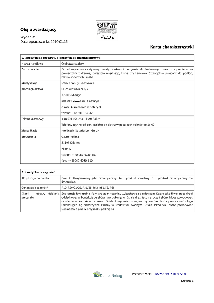Olej utwardzający Wydanie: 1 Data opracowania: 2010.01.15 Karta charakterystyki 1. Identyfikacja preparatu i identyfikacja przedsiębiorstwa Nazwa handlowa Olej utwardzający Zastosowanie Do zabezpieczenia satynową twardą powłoką intensywnie eksploatowanych wewnątrz pomieszczeń powierzchni z drewna, zwłaszcza miękkiego, korka czy kamienia. Szczególnie polecany do podłóg, blatów roboczych i mebli. Identyfikacja Dom z natury Piotr Solich przedsiębiorstwa ul. Za wiatrakiem 6/6 72-006 Mierzyn internet: www.dom-z-natury.pl e-mail: [email protected] telefon: +48 501 154 268 Telefon alarmowy +48 501 154 268 – Piotr Solich Telefony czynne od poniedziałku do piątku w godzinach od 9:00 do 18:00 Identyfikacja Kreidezeit Naturfarben GmbH producenta Cassemühle 3 31196 Sehlem Niemcy telefon: +495060-6080-650 faks: +495060-6080-680 2. Identyfikacja zagrożeń Klasyfikacja preparatu Produkt klasyfikowany jako niebezpieczny. Xn - produkt szkodliwy. N – produkt niebezpieczny dla środowiska. Oznaczenie zagrożeń R10, R20/21/22, R36/38, R43, R51/53, R65 Skutki i objawy preparatu działania Substancja łatwopalna. Pary tworzą mieszaniny wybuchowe z powietrzem. Działa szkodliwie przez drogi oddechowe, w kontakcie ze skórą i po połknięciu. Działa drażniąco na oczy i skórę. Może powodować uczulenie w kontakcie ze skórą. Działa toksycznie na organizmy wodne. Może powodować długo utrzymujące się niekorzystne zmiany w środowisku wodnym. Działa szkodliwie. Może powodować uszkodzenie płuc w przypadku połknięcia Przedstawiciel: www.dom-z-natury.pl Strona 1 3. Skład i informacja o składnikach Skład olej drzewny zagęszczony, olej rycynowy zagęszczony, kalafonia wapienna, kwas krzemowy, podwójnie rektyfikowana portugalska terpentyna balsamiczna, sykatywa bezołowiowa Niebezpieczne składniki Nazwa CAS WE terpentyna 8006-64-2 232-350-7 Stężenie % Zwroty R Klasyfikacja 10 Xn 20/21/22 N Symbol 36/38 43 51/53 65 4. Pierwsza pomoc. Po wdychaniu Wyprowadzić poszkodowanego na świeże powietrze. Jeżeli wystąpią trudności w oddychaniu, natychmiast wezwać pomoc lekarską. Po połknięciu W początkowej fazie w razie zatrucia doustnego podawać 60-120 ml oleju parafinowego i prowokować wymioty. Nie podawać mleka, tłuszczów, alkoholu. Później nie wywoływać wymiotów. Natychmiast skontaktować się z lekarzem. Po kontakcie z oczami Usunąć soczewki kontaktowe, dokładnie płukać większa ilością wody. Unikać silnego strumienia wody ze względu na możliwość uszkodzenia rogówki. Po kontakcie ze skórą Zdjąć całą zanieczyszczoną odzież i przemyć zanieczyszczoną skórę dużą ilością Ogólne informacje W przypadku jakichkolwiek wątpliwości lub gdy objawy nie ustępują należy skonsultować się z lekarzem. Lekarzowi należy pokazać niniejszą kartę charakterystyki, opakowanie lub etykietę. W żadnym przypadku osobie nieprzytomnej nie podawać niczego do ust. 5. Postępowanie w przypadku pożaru Odpowiednie środki gaśnicze Stosować środki gaśnicze właściwe dla otaczających materiałów: dwutlenek węgla (CO2), piana gaśnicza, proszek gaśniczy, piasek. Środki gaśnicze niedozwolone Nie wolno stosować wody. ze względów bezpieczeństwa Specjalne zagrożenia Niebezpieczne rozkładu Unikać wdychania produktów spalania. produkty Dwutlenek węgla, tlenek węgla. Specjalne wyposażenie Podczas pożaru, ze względu na otaczające materiały mogą powstawać substancje szkodliwe dla ochronne dla strażaków zdrowia. Nałożyć odzież ochronną gazoszczelną i aparat izolujący drogi oddechowe (aparat tlenowy skompletowany z maską). Dalsze zalecenia Woda skażona środkami gaśniczymi musi być usuwana jako odpad niebezpieczny. Zawiadomić otoczenie o pożarze. Usunąć z obszaru zagrożenia wszystkie osoby nie biorące udziału w likwidowaniu pożaru. Powiadomić Państwową Straż Pożarną, a w razie konieczności także Policję Państwową, najbliższe władze terenowe i najbliższą jednostkę Ratownictwa Chemicznego. Uwaga! Obszar zagrożony wybuchem. Pomieszczenia zamknięte intensywnie wietrzyć aż do zaniku charakterystycznego zapachu. Usunąć źródła zapłonu, ugasić otwarty ogień, ogłosić zakaz palenia i używania narzędzi iskrzących. W temperaturze > 250°C mogą tworzyć się krótkołańcuchowe kwasy tłuszczowe, polimery i akroleina. Pojemniki narażone na działanie ognia ochłodzić strumieniem wody. Oleje wysychające pod wpływem powietrza mogą w połączeniu z pyłem drewnianym, ściereczkami lub innymi chłonnymi materiałami prowadzić do samozapalenia. Nasiąknięte olejem materiały należy przechowywać w ogniotrwałym i szczelnie zamkniętym pojemniku. Przedstawiciel: www.dom-z-natury.pl Strona 2 6. Postępowanie w przypadku niezamierzonego uwolnienia do środowiska Indywidualne ostrożności środki Stosować środki ochrony indywidualnej zgodnie z punktem 8. Środki ostrożności w W razie awarii nie dopuszczać do zrzutów do środowiska. Zabezpieczyć produkt przed przedostaniem odniesieniu do środowiska się do wód bieżących i kanałów ściekowych. Uszczelnić lub zlikwidować źródło wycieku, np. przez przepompowanie zawartości uszkodzonego opakowania do pojemnika awaryjnego. W przypadku dużego wycieku obwałować miejsce gromadzenia się oleju. Próbować zebrać, jeśli tylko to możliwe, do odpowiednich pojemników celem dalszej utylizacji. Metody oczyszczania Niebezpieczne rozkładu Zasypać rozlany produkt niepalnym materiałem absorpcyjnym, np. piaskiem, ziemią, ziemią okrzemkową, materiałem wiążącym kwasy, materiałem wiążącym uniwersalnym i umieścić w pojemniku w celu dalszej utylizacji. Nie stosować wody. produkty Nieznane. Uwaga! Nie dopuścić do wyschnięcia. Nie nasączać produktem obojętnych materiałów pochłaniających (np. trociny). Oleje wysychające pod wpływem powietrza mogą w połączeniu z pyłem drewnianym, ściereczkami lub innymi chłonn