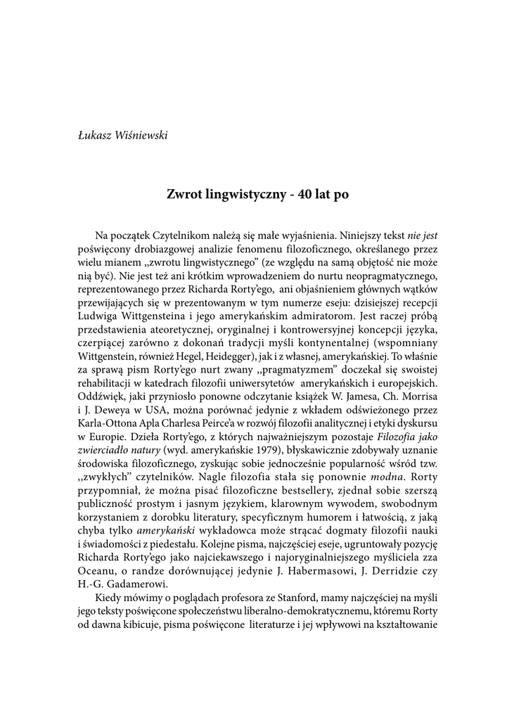 Łukasz Wiśniewski Zwrot lingwistyczny - 40 lat po Na początek Czytelnikom należą się małe wyjaśnienia. Niniejszy tekst nie jest poświęcony drobiazgowej analizie fenomenu filozoficznego, określanego przez wielu mianem ,,zwrotu lingwistycznego’’ (ze względu na samą objętość nie może nią być). Nie jest też ani krótkim wprowadzeniem do nurtu neopragmatycznego, reprezentowanego przez Richarda Rorty’ego, ani objaśnieniem głównych wątków przewijających się w prezentowanym w tym numerze eseju: dzisiejszej recepcji Ludwiga Wittgensteina i jego amerykańskim admiratorom. Jest raczej próbą przedstawienia ateoretycznej, oryginalnej i kontrowersyjnej koncepcji języka, czerpiącej zarówno z dokonań tradycji myśli kontynentalnej (wspomniany Wittgenstein, również Hegel, Heidegger), jak i z własnej, amerykańskiej. To właśnie za sprawą pism Rorty’ego nurt zwany ,,pragmatyzmem’’ doczekał się swoistej rehabilitacji w katedrach filozofii uniwersytetów amerykańskich i europejskich. Oddźwięk, jaki przyniosło ponowne odczytanie książek W. Jamesa, Ch. Morrisa i J. Deweya w USA, można porównać jedynie z wkładem odświeżonego przez Karla-Ottona Apla Charlesa Peirce’a w rozwój filozofii analitycznej i etyki dyskursu w Europie. Dzieła Rorty’ego, z których najważniejszym pozostaje Filozofia jako zwierciadło natury (wyd. amerykańskie 1979), błyskawicznie zdobywały uznanie środowiska filozoficznego, zyskując sobie jednocześnie popularność wśród tzw. ,,zwykłych’’ czytelników. Nagle filozofia stała się ponownie modna. Rorty przypomniał, że można pisać filozoficzne bestsellery, zjednał sobie szerszą publiczność prostym i jasnym językiem, klarownym wywodem, swobodnym korzystaniem z dorobku literatury, specyficznym humorem i łatwością, z jaką chyba tylko amerykański wykładowca może strącać dogmaty filozofii nauki i świadomości z piedestału. Kolejne pisma, najczęściej eseje, ugruntowały pozycję Richarda Rorty’ego jako najciekawszego i najoryginalniejszego myśliciela zza Oceanu, o randze dorównującej jedynie J. Habermasowi, J. Derridzie czy H.-G. Gadamerowi. Kiedy mówimy o poglądach profesora ze Stanford, mamy najczęściej na myśli jego teksty poświęcone społeczeństwu liberalno-demokratycznemu, któremu Rorty od dawna kibicuje, pisma poświęcone literaturze i jej wpływowi na kształtowanie 10 ŁUKASZ WIŚNIEWSKI się postaw etycznych, idei kultury zachodniej jako nieustannej konwersacji, czyli rozmowy prowadzonej na odmienne sposoby przez kolejne pokolenia. Jednak obok tekstów należących do tzw. ,,głównego nurtu’’, Rorty równolegle uznawany był za jednego z czołowych przedstawicieli zwrotu lingwistycznego, jaki dokonał się w filozofii XX wieku, decydując wraz ze zwrotem pragmatycznym i hermeneutycznym1 o jej nowym obliczu. Właśnie pod redakcją Rorty’ego (o czym wielu dziś zapomina) ukazał się w 1967 roku tom esejów zatytułowany po prostu The Linguistic turn (Zwrot lingwistyczny), z zasygnalizowaną już w podtytule myślą, iż chodzi tu przede wszystkim o nową metodę wglądu w badaniach filozoficznych. Zbiór otworzyła napisana przez Rorty’ego dwa lata wcześniej obszerna przedmowa, w której autor Konsekwencji pragmatyzmu zwrócił się przeciwko samej filozofii, rozumianej jako nauka, zadaniem której jest ,,rozwiązywać pewne szczegółowe problemy’’2. Książka zawiera teksty autorstwa, m. in. Gustava Begmanna, Petera Strawsona czy Normana Malcolma. Reedycja z 1992 roku zawiera również dwa retrospektywne posłowia Rorty’ego, napisane odpowiednio 103 i 25 lat po pierwszej publikacji zbioru. Zmiana paradygmatu w filozofii, wcześniej jedynie intuicyjnie wyczuwana w pismach Fregego, Russella i oczywiście Wittgensteina, wreszcie uzyskała swą oficjalną nazwę. Próżno jednak czytać The Linguistic turn jako manifest ,,nowej filozofii’’, sam Wstęp Rorty’ego już wyraźnie dystansuje się od analitycznej metody badania świata i języka, ton rozczarowania pobrzmiewa także w krótkich esejach powstałych z perspektywy lat mijających od przełomu, jakim zdawała się być publikacja. Zawsze życzliwy ideom Rorty’ego Jürgen Habermas podkreśla, iż The Linguistic turn był wyraźną ,,cezurą w historii myślenia analitycznego’’ 4, wyrazem rozczarowania filozofią z jej metafizycznoepistemologicznymi poszukiwaniami i aspiracjami, dlatego też niemiecki filozof traktuje zapędy swego amerykańskiego kolegi jako napędzaną przez pragmatyzm i nominalizm ,,próbę stworzenia filozofii, która miałaby zmieść samą filozofię’’5 : Zebrane w tym tomie teksty miały służyć spełnieniu podwójnego celu: wyciągając konkluzje z jej [filozofii lingwistycznej] triumfalnego rozwoju, miały zarazem zasygnalizować ich koniec6. 1 Rorty’ego uznać można za reprezentanta wszystkich trzech zwrotów. Zob. A. Przyłębski: Hermeneutyczny zwrot filozofii, Poznań 2005 2 R. Rorty: Metaphilosophical Difficulties of Linguistic Philosophy, w: R. Rorty (ed.): The Linguistic turn. Essays in Philosophical Method, University of Chicago Press, Chicago and London 1992, s. 23. 3 Z właściwą sobie ironią Rorty zatytułował ten pierwszy Ten Years After, odnoszący się do nazwy znanego zespołu rockowego lat 70. 4 J. Habermas: Wahrheit und Rechtfertigung. Zu Richard Rortys pragmatischer Wende, w: tegoż: Wahrheit und Rechtfertigung, Frankfurt a/M. 2004, s. 232. 5 Ibidem. 6 Ibidem. ZWROT LINGWISTYCZNY - 40 LAT PO 11 Autor kieruje więc Rorty’ego w stronę Hegla. The Linguistic turn miałby być rodzajem heglowskiego przekazu. Zwrot lingwistyczny, przynajmniej w postaci zaprezentowej w książce, osiągnął swą najwyższą formę, stał się ,,dojrzały’’, więc ,,dialektycznie’’ skazany jest na powolny rozkład. Dlatego rozważania R. Rorty’ego ze Wstępu Habermas określa mianem postanalitycznych7, my powiedzielibyśmy po prostu: metafilozof