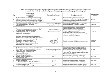 Wykaz dokumentacji projektowych, w których uczestniczyłam, jako projektant/asystent projektanta w specjalności instalacyjnej w zakresie sieci, instalacji i urządzeń cieplnych, wentylacyjnych, gazowych, wodociągowych i kanalizacyjnych Lp 1 2 3 4 5 6 7 8 Nazwa tematu Adres obiektu Inwestor Budowa budynku mieszkalnego jednorodzinnego z garażem oraz instalacjami wewnętrznymi, budowa budynku gospodarczego z garażem oraz budowa zjazdu indywidualnego na nieruchomość w Wolbromiu Fabryka montowania silników elektrycznych 32-005 Niepołomice, ul. R. Diesla Sopem Sp. z o.o. Termomodernizacja budynków Sanatorium „Staś” i „Zimowit” wraz z technologią kotłowni 38-481 Rymanów Zdrój, ul. Leśna 4 Uzdrowisko Rymanów S.A. Instalacja centralnego ogrzewania dla Szkoły Podstawowej w Horyńcu Zdroju, tj. budynku szkoły głównej, świetlicy i stołówki, małej sali gimnastycznej oraz pomiar ciepła dla dużej Sali 37-620 Horyniec Zdrój, ul. Sobieskiego 8 Szkoła Podstawowa im. Marszałka Józefa Piłsudskiego w Horyńcu Zdroju Budowa innowacyjnego systemu do współspalania biomasy oraz odpadów pochodzenia drzewnego (MDF, HDF, płyta wiórowa i pilśniowa) 38-500 Sanok, ul. Lipińskiego 109 Centurion-R Sp. z o.o. Pawilon Usługowo-Handlowy Kraków, ul. Marii Dąbrowskiej 25 Aldi Polska Sp. z o.o. Pawilony Handlowo-Usługowe Kraków, ul. Perkuna J. Metryka, os. Piastów 46/21, 31-625 Kraków A. Chawiński, ul. Okulickiego 55/9, 31-637 Kraków Schronisko Młodzieżowe Jerzmanowice-Przeginia, Łazy 37 Powierzchnia/Kubatura 220 m Rodzaj opracowania 2 Hala produkcyjna 5845,74 m 2 Kotłownia 127,78 m 2 3 Kotłownia 2880 m 3 Wymiennikownia 987,9 m Projekt budowlany instalacji centralnego ogrzewania z kotłownią, wentylacji, instalacji gazu, ciepłej wody użytkowej z systemem solarnym, wody zimnej i kanalizacji Projekt budowlany, przetargowy i wykonawczy technologii kotłowni z instalacją gazową - Koncepcja przebudowy i budowy kotłowni i wymiennikowni-część technologiczna - Projekt wykonawczy przebudowy i budowy kotłowni-część technologiczna - Projekt wykonawczy przebudowy i budowy wymiennikowni grupowej oraz budowy układów solarnych-część technologiczna Czas realizacji projektu IX 2013 I-IX 2013 I-VI 2012 2 Piwnica 205 m 2 Parter 1154 m 2 I Piętro 1154 m 2 II Piętro 504 m Projekt wykonawczy instalacji centralnego ogrzewania VIII 2010III 2011 Kotłownia i pom. techniczne 2 2401 m Projekt budowlany rozbudowy i przebudowy kotłowni, budowy dwóch silosów, elektrofiltru, komina na potrzeby przebudowy oraz zmiany sposobu użytkowania hali montażowej autobusów „AUTOSAN” na zakład produkcji drzewnej-część technologiczno-sanitarna XII 2009VII 2010 IV-V 2009 1162 m 2 Projekt budowlany- instalacja centralnego ogrzewania, wodna i kanalizacji sanitarnej 3315 m 3 Projekt budowlany- instalacja centralnego ogrzewania, wodna i kanalizacji sanitarnej III-IV 2009 2000 m 3 Projekt budowlany kotłowni gazowej i instalacji centralnego ogrzewania, wodnej i kanalizacji II-III 2009 1 Starostwo Powiatowe w Krakowie 9 10 11 12 13 14 15 16 17 18 Budynek gospodarczy Liszki, Czułów 112 Antonina Połeć Ambasada Zjednoczonego Królestwa Wielkiej Brytanii i Irlandii Północnej 00-468 Warszawa, ul. Kawalerii 12 Ambasada Zjednoczonego Królestwa Wielkiej Brytanii i Irlandii Północnej Budynki mieszkalne wielorodzinne Kraków, ul. Białoprądnicka Montegrappa Polska Sp. z o.o. Aranżacja lokalu na potrzeby Oddziału Banku BZWBK Kraków, ul. Warszawska Bank Zachodni WBK S.A. Przebudowa lokalu budynku mieszkalnego dla potrzeb Oddziału Banku BPH Olkusz, ul. Floriańska 1A Bank BPH S.A. Przebudowa lokalu w wielofunkcyjnym zespole mieszkaniowo-usługowym 31-105 Kraków, ul. Zwierzyniecka 24 Bank BPH S.A. Przebudowa lokalu w budynku mieszkalnousługowym na potrzeby I Oddziału BZ WBK S.A. 32-020 Wieliczka, ul. Limanowskiego/Szpunara Bank Zachodni WBK S.A. Przebudowa lokalu I Oddziału BZ WBK 32-050 Skawina, ul. Konopnickiej 3A Bank Zachodni WBK S.A. Zespół Zabudowy Mieszkalnej i Wielorodzinnej z Garażami i Usługami 30-397 Kraków, ul. Balicka M. Golas, os. Kolorowe 1/18, 31-938 Kraków Budynki mieszkalne jednorodzinne 30-397 Kraków, ul. Kozienicka Przedsiębiorstwo Rewaloryzacji Zabytków Kraków sanitarnej 580 m 3 26100 m 3 3 Budynek „A” 4100 m 3 Budynek „B” 4100 m 3 Budynek „C” 3800 m Projekt budowlany instalacji wewnętrznej gazu, wodnej, kanalizacji sanitarnej I 2009 Projekt budowlany instalacji centralnego ogrzewania, wentylacji, wodnej, przeciwpożarowej i kanalizacji sanitarnej VIII 2008I 2009 Projekt budowlany kotłowni gazowej i instalacji centralnego ogrzewania, wentylacji, wodnej i kanalizacji sanitarnej V-VII 2008 580 m 3 Projekt budowlany instalacji centralnego ogrzewania, wodnej i kanalizacji sanitarnej V 2008 500 m 3 Projekt budowlany instalacji centralnego ogrzewania, wodnej i kanalizacji sanitarnej IV-V 2008 Projekt budowlany instalacji centralnego ogrzewania, wodnej i kanalizacji sanitarnej IV 2008 208,2 m 284 m 2 Projekt budowlany instalacji centralnego ogrzewania, wodnej i kanalizacji sanitarnej 2 162,5 m 2 Budynek „A” 21281 m Budynek 1150 m 2 3 3 II 2008 Projekt budowlany instalacji centralnego ogrzewania, wodnej i kanalizacji sanitarnej II 2008 Projekt budowlany kotłowni gazowej oraz instalacji centralnego ogrzewania i wentylacji I-II 2008 Projekty budowlane instalacji centralnego ogrzewania, wewnętrznej gazu, wody i kanalizacji sanitarnej XII 2007I 2008 19 20 S.A. Remont i adaptacja lokalu na potrzeby BZ WBK Mielec, Al. Niepodległości 14 Bank Zachodni WBK S.A. Zabudowa miejsca obsługi podróżnych przy drodze krajowej nr 7 32-600 Klemencice, dz. bud. 137/4 L. Madejska, Maszków 106, 32-095 Iwanowice 21 Hala magazynowa opakowań z częścią administracyjno-socjalną 32-600 Oświęcim, ul. Chemików CP RE Sp. z o.o. 22 Remont pawilonu handlowego TESCO 30-870 Kraków, ul. Teligi 24 TESCO POLSKA Sp. z o.o. 23 Zakład Karny w Medyce 37-732 Medyk