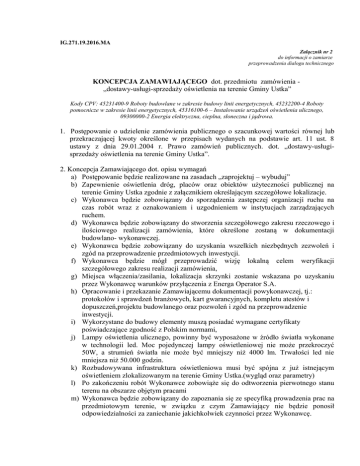 IG.271.19.2016.MA Załącznik nr 2 do informacji o zamiarze przeprowadzenia dialogu technicznego KONCEPCJA ZAMAWIAJĄCEGO dot. przedmiotu zamówienia „dostawy-usługi-sprzedaży oświetlenia na terenie Gminy Ustka” Kody CPV: 45231400-9 Roboty budowlane w zakresie budowy linii energetycznych, 45232200-4 Roboty pomocnicze w zakresie linii energetycznych, 45316100-6 – Instalowanie urządzeń oświetlenia ulicznego, 09300000-2 Energia elektryczna, cieplna, słoneczna i jądrowa. 1. Postępowanie o udzielenie zamówienia publicznego o szacunkowej wartości równej lub przekraczającej kwoty określone w przepisach wydanych na podstawie art. 11 ust. 8 ustawy z dnia 29.01.2004 r. Prawo zamówień publicznych. dot. „dostawy-usługisprzedaży oświetlenia na terenie Gminy Ustka”. 2. Koncepcja Zamawiającego dot. opisu wymagań a) Postępowanie będzie realizowane na zasadach „zaprojektuj – wybuduj” b) Zapewnienie oświetlenia dróg, placów oraz obiektów użyteczności publicznej na terenie Gminy Ustka zgodnie z załącznikiem określającym szczegółowe lokalizacje. c) Wykonawca będzie zobowiązany do sporządzenia zastępczej organizacji ruchu na czas robót wraz z oznakowaniem i uzgodnieniem w instytucjach zarządzających ruchem. d) Wykonawca będzie zobowiązany do stworzenia szczegółowego zakresu rzeczowego i ilościowego realizacji zamówienia, które określone zostaną w dokumentacji budowlano- wykonawczej. e) Wykonawca będzie zobowiązany do uzyskania wszelkich niezbędnych zezwoleń i zgód na przeprowadzenie przedmiotowych inwestycji. f) Wykonawca będzie mógł przeprowadzić wizję lokalną celem weryfikacji szczegółowego zakresu realizacji zamówienia, g) Miejsca włączenia/zasilania, lokalizacja skrzynki zostanie wskazana po uzyskaniu przez Wykonawcę warunków przyłączenia z Energa Operator S.A. h) Opracowanie i przekazanie Zamawiającemu dokumentacji powykonawczej, tj.: protokołów i sprawdzeń branżowych, kart gwarancyjnych, kompletu atestów i dopuszczeń,projektu budowlanego oraz pozwoleń i zgód na przeprowadzenie inwestycji. i) Wykorzystane do budowy elementy muszą posiadać wymagane certyfikaty poświadczające zgodność z Polskim normami, j) Lampy oświetlenia ulicznego, powinny być wyposażone w źródło światła wykonane w technologii led. Moc pojedynczej lampy oświetleniowej nie może przekroczyć 50W, a strumień światła nie może być mniejszy niż 4000 lm. Trwałości led nie mniejsza niż 50.000 godzin. k) Rozbudowywana infrastruktura oświetleniowa musi być spójna z już istnejącym oświetleniem zlokalizowanym na terenie Gminy Ustka.(wygląd oraz parametry) l) Po zakończeniu robót Wykonawce zobowiąże się do odtworzenia pierwotnego stanu terenu na obszarze objętym pracami m) Wykonawca będzie zobowiązany do zapoznania się ze specyfiką prowadzenia prac na przedmiotowym terenie, w związku z czym Zamawiający nie będzie ponosił odpowiedzialności za zaniechanie jakichkolwiek czynności przez Wykonawcę. n) Wszelkie koszty realizacji przedmiotu zamówienia konieczne do poniesienia (cła i wszelkie opłaty, koszty prac przygotowawczych i porządkowych, koszty ubezpieczenia, organizacji ruchu wraz z projektami, oznakowania zastępczego, wnioski o zajęcie pasa drogowego, koszty wykonania badań i pomiarów, obsługi geodezyjnej, opracowania i uzgodnienia dokumentacji powykonawczej, a także pozostałe koszty związane z odbiorami wykonanych robót oraz przeprowadzeniem prób i badań technicznych, itp.), w celu prawidłowego wykonania zamówienia do momentu jego bezusterkowego, protokolarnego przyjęcia przez Zamawiającego zostanie zobowiązany Wykonawca. o) Wykonawcę zobowiąże się do uzyskania zgody od właścicieli istniejącej infrastruktury oświetleniowej na podłączenie zasilania w celu ograniczenia kosztów realizacji zamówienia. p) Wykonawca po realizacji zobowiązany zostanie do odpłatnego prowadzenia całodobowego systemu obsługi oświetlenia (wyklucza się wykorzystanie do tego celu podwykonawców) q) Wykonawca będzie zobowiązany do dyspozycji Zamawiającego 24 godziny / dobę r) Zamawiający dopuszcza możliwość przejęcia w majątek oświetlenia przez Wykonawcę s) W trakcie dialogu technicznego zostaną ustalone warunki udziału w postępowaniu dla Wykonawców biorących udział w postępowaniu przetargowym. 3. Koncepcja Zamawiającego w zakresie realizacji umowy. a) Koncepcją Zamawiającego jest aby przedmiotem umowy była dostawa-usługasprzedaż oświetlenia na terenie Gminy Ustka. b) Okres rat: 10 lat. c) Raty równomierne bez oprocentowania, bez odsetek. d) Wszelkie koszty poniesione przez Wykonawcę zostaną wliczone w cenę (ratę). e) Wykonawca będzie musiał wykonać niezbędna infrastrukturę do realizacji „dostawyusługi-sprzedaży oświetlenia na terenie Gminy Ustka”. f) Zamawiający przewiduje również koncepcję w której Wykonawca wybuduje niezbędną infrastrukturę która była by przedmiotem leasingu. Natomiast odrębnie byłaby realizowana usługa oświetlenia.