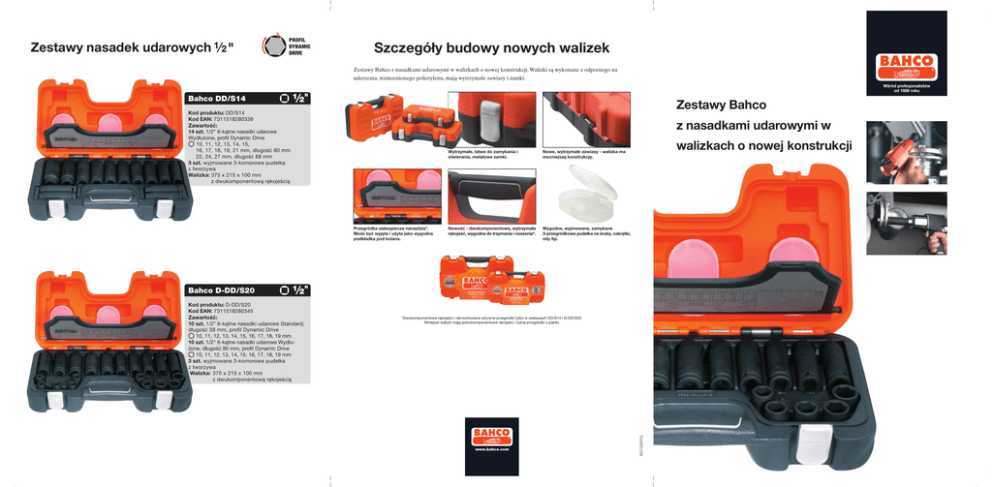 Zestawy nasadek udarowych PROFIL DYNAMIC DRIVE Szczegóły budowy nowych walizek Zestawy Bahco z nasadkami udarowymi w walizkach o nowej konstrukcji. Walizki są wykonane z odpornego na uderzenia, wzmocnionego polietylenu, mają wytrzymałe zawiasy i zamki. Wśród profesjonalistów od 1886 roku 1⁄2" Zestawy Bahco Kod produktu: DD/S14 Kod EAN: 7311518280338 Zawartość: 14 szt. 1/2" 6-kątne nasadki udarowe Wydłużone, profil Dynamic Drive 10, 11, 12, 13, 14, 15, 16, 17, 18, 19, 21 mm, długość 80 mm 22, 24, 27 mm, długość 88 mm 3 szt. wyjmowane 3-komorowe pudełka z tworzywa Walizka: 375 x 215 x 100 mm z dwukomponentową rękojeścią z nasadkami udarowymi w Przegródka zabezpiecza narzędzia*. Może być wyjęta i użyta jako wygodna podkładka pod kolana. Bahco D-DD/S20 Wytrzymałe, łatwe do zamykania i otwierania, metalowe zamki. Nowe, wytrzymałe zawiasy - walizka ma mocniejszą konstrukcję. Nowość - dwukomponentowa, wytrzymała rękojeść, wygodna do trzymania i noszenia*. Wygodne, wyjmowane, zamykane 3-przegródkowe pudełka na śruby, nakrętki, nity itp. walizkach o nowej konstrukcji 1⁄2" Kod produktu: D-DD/S20 Kod EAN: 7311518280345 Zawartość: 10 szt. 1/2" 6-kątne nasadki udarowe Standard, długość 38 mm, profil Dynamic Drive 10, 11, 12, 13, 14, 15, 16, 17, 18, 19 mm 10 szt. 1/2" 6-kątne nasadki udarowe Wydłużone, długość 80 mm, profil Dynamic Drive 10, 11, 12, 13, 14, 15, 16, 17, 18, 19 mm 3 szt. wyjmowane 3-komorowe pudełka z tworzywa Walizka: 375 x 215 x 100 mm z dwukomponentową rękojeścią *Dwukomponentowe rękojeści i demontowane sztywne przegródki tylko w zestawach DD/S14 i D-DD/S20. Mniejsze walizki mają jednokomponentowe rękojeści i luźne przegródki z pianki. www.bahco.com MS7056POL Bahco DD/S14 Wytrzymałe, dające się układać w stos, walizki o nowej, dopracowanej konstrukcji. BAHCO PRZEDSTAWIA nową generację uniwersalnych zestawów nasadek udarowych dla wymagających rzemieślników. NASADKI UDAROWE są umieszczone w lekkich, poręcznych i wytrzymałych walizkach o nowej konstrukcji. Walizki wykonane ze wzmocnionego polietylenu (HDPE) są odporne na uderzenia, zarówno w wysokich jak i niskich temperaturach. Są wyposażone w nowe, mocne, wykonane całkowicie z metalu zamki oraz zawiasy o nowej, wzmocnionej konstrukcji. WALIZKI O NOWEJ KONSTRUKCJI mają wystandaryzowane wymiary (dwie wielkości), co pozwala na układanie ich w stos. By ułatwić użytkowanie i zabezpieczyć nasadki, wewnątrz walizek są przegródki z nadrukiem ułożenia narzędzi. Inną nowością są trzyprzegródkowe plastikowe pudełka na śruby, nakrętki, nity itp. Zestawy nasadek udarowych Bahco DF/S12 Zestawy nasadek udarowych Bahco występują w ośmiu wersjach, wszystkie w wygodnie zorganizowanych, dobrze zaprojektowanych, lekkich i łatwych do noszenia walizkach. PROFIL DYNAMIC DRIVE 3⁄8" Kod produktu: DF/S12 Kod EAN: 7311518280291 Zawartość: 12 szt. 3/8" 6-kątne nasadki udarowe Standard, profil Dynamic Drive 8, 9, 10, 11, 12, 13 mm, długość 25 mm 14, 15, 16, 17, 18, 19 mm, długość 28 mm 2 szt. wyjmowane 3-komorowe pudełka z tworzywa Walizka: 280 x 160 x 70 mm Zestawy nasadek udarowych Bahco D/S10 PROFIL DYNAMIC DRIVE 1⁄2" Kod produktu: D/S10 Kod EAN: 7311518280307 Zawartość: 10 szt. 1/2" 6-kątne nasadki udarowe Standard, długość 38 mm, profil Dynamic Drive 10, 11, 12, 13, 14, 15, 16, 17, 18, 19 mm 2 szt. wyjmowane 3-komorowe pudełka z tworzywa Walizka: 280 x 160 x 70 mm NASADKI WYKONANE SĄ ZE STALI CHROMOWOWANADOWEJ, wykończone poprzez fosforanowanie na czarno. Zapewnia to wytrzymałość, precyzję wykonania i bezpieczeństwo użytkowania niezbędne przy najbardziej wymagających pracach. Nasadki mają prowadzenie 3/8" i 1/2" (ze sprężyną blokującą), występują w wersji zwykłej lub przedłużonej. Bahco DFD/S7 Kod produktu: DFD/S7 Kod EAN: 7311518280277 Zawartość: 7 szt. 3/8" 6-kątne nasadki udarowe Wydłużone, długość 63 mm, profil Dynamic Drive 8, 10, 13, 14, 16, 17, 19 mm 2 szt. wyjmowane 3-komorowe pudełka z tworzywa Walizka: 280 x 160 x 70 mm Bahco DFD/S12 Profil Dynamic Drive zapewnia wyższą wydajność i optymalny chwyt. Nasadki udarowe o wysokiej wytrzymałości. Walizki wykonane z odpornego na uderzenia, działanie oleju i wysokiej temperatury, wzmocnionego polietylenu (HDPE). Wytrzymały, metalowy zamek. 3⁄8" 3⁄8" Kod produktu: DFD/S12 Kod EAN: 7311518280284 Zawartość: 12 szt. 3/8" 6-kątne nasadki udarowe Wydłużone, długość 63 mm, profil Dynamic Drive 8, 9, 10, 11, 12, 13, 14, 15, 16, 17, 18, 19 mm 2 szt. wyjmowane 3-komorowe pudełka z tworzywa Walizka: 280 x 160 x 70 mm Bahco D/S14 1⁄2" Kod produktu: D/S14 Kod EAN: 7311518280314 Zawartość: 14 szt. 1/2" 6-kątne nasadki udarowe Standard, profil Dynamic Drive 10, 11, 12, 13, 14, 15, 16, 17, 18, 19, 21, 22 mm, długość 38 mm 24, 27 mm, długość 45 mm 2 szt. wyjmowane 3-komorowe pudełko z tworzywa Walizka: 280 x 160 x 70 mm Bahco DD/S10 1⁄2" Kod produktu: DD/S10 Kod EAN: 7311518280321 Zawartość: 10 szt. 1/2" 6-kątne nasadki udarowe Wydłużone, długość 80 mm, profil Dynamic Drive 10, 11, 12, 13, 14, 15, 16, 17, 18, 19 mm Walizka: 280 x 160 x 70 mm