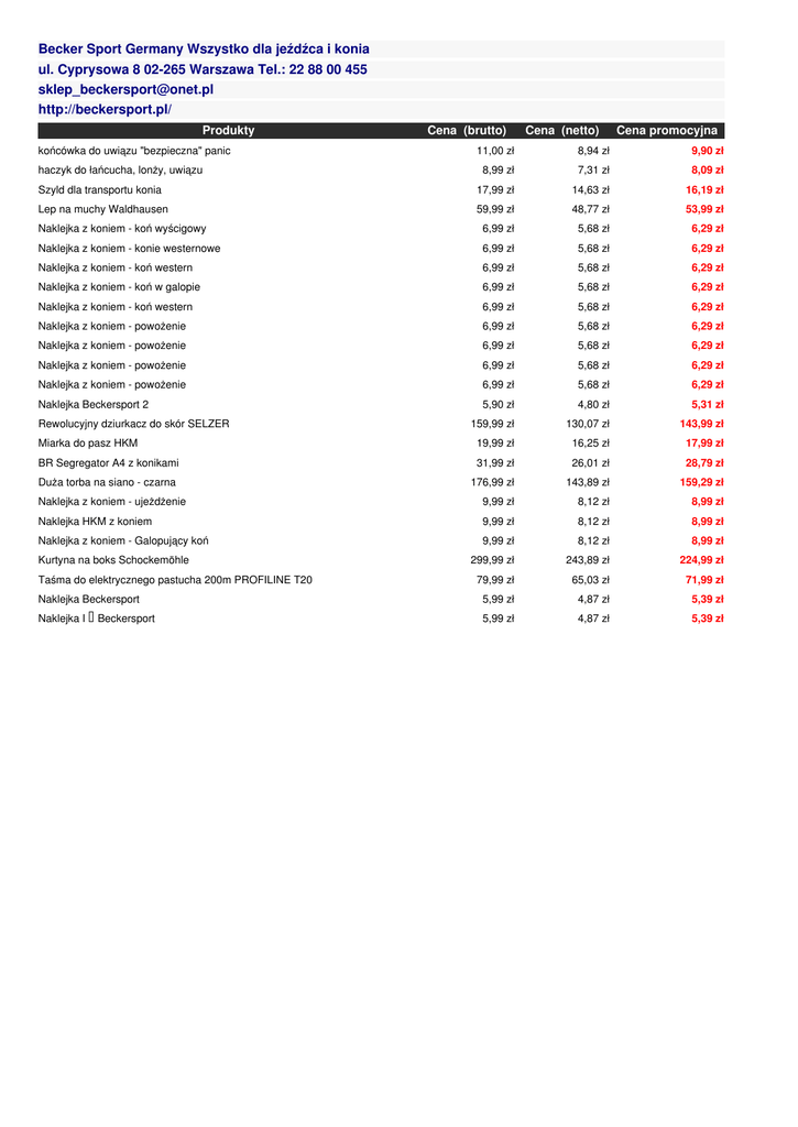Becker Sport Germany Wszystko dla jeźdźca i konia ul. Cyprysowa 8 02-265 Warszawa Tel.: 22 88 00 455 [email protected] http://beckersport.pl/ Produkty końcówka do uwiązu "bezpieczna" panic Cena (brutto) Cena (netto) Cena promocyjna 11,00 zł 8,94 zł 9,90 zł 8,99 zł 7,31 zł 8,09 zł Szyld dla transportu konia 17,99 zł 14,63 zł 16,19 zł Lep na muchy Waldhausen 59,99 zł 48,77 zł 53,99 zł Naklejka z koniem - koń wyścigowy 6,99 zł 5,68 zł 6,29 zł Naklejka z koniem - konie westernowe 6,99 zł 5,68 zł 6,29 zł Naklejka z koniem - koń western 6,99 zł 5,68 zł 6,29 zł Naklejka z koniem - koń w galopie 6,99 zł 5,68 zł 6,29 zł Naklejka z koniem - koń western 6,99 zł 5,68 zł 6,29 zł Naklejka z koniem - powożenie 6,99 zł 5,68 zł 6,29 zł Naklejka z koniem - powożenie 6,99 zł 5,68 zł 6,29 zł Naklejka z koniem - powożenie 6,99 zł 5,68 zł 6,29 zł Naklejka z koniem - powożenie 6,99 zł 5,68 zł 6,29 zł haczyk do łańcucha, lonży, uwiązu Naklejka Beckersport 2 Rewolucyjny dziurkacz do skór SELZER Miarka do pasz HKM 5,90 zł 4,80 zł 5,31 zł 159,99 zł 130,07 zł 143,99 zł 19,99 zł 16,25 zł 17,99 zł BR Segregator A4 z konikami 31,99 zł 26,01 zł 28,79 zł Duża torba na siano - czarna 176,99 zł 143,89 zł 159,29 zł Naklejka z koniem - ujeżdżenie 9,99 zł 8,12 zł 8,99 zł Naklejka HKM z koniem 9,99 zł 8,12 zł 8,99 zł Naklejka z koniem - Galopujący koń 9,99 zł 8,12 zł 8,99 zł 299,99 zł 243,89 zł 224,99 zł 79,99 zł 65,03 zł 71,99 zł Naklejka Beckersport 5,99 zł 4,87 zł 5,39 zł Naklejka I ❤ Beckersport 5,99 zł 4,87 zł 5,39 zł Kurtyna na boks Schockemöhle Taśma do elektrycznego pastucha 200m PROFILINE T20