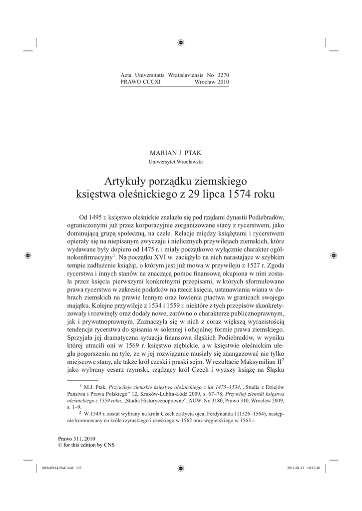 Acta Universitatis Wratislaviensis No 3270 PRAWO CCCXI Wrocław 2010 MARIAN J. PTAK Uniwersytet Wrocławski Artykuły porządku ziemskiego księstwa oleśnickiego z 29 lipca 1574 roku Od 1495 r. księstwo oleśnickie znalazło się pod rządami dynastii Podiebradów, ograniczonymi już przez korporacyjnie zorganizowane stany z rycerstwem, jako dominującą grupą społeczną, na czele. Relacje między książętami i rycerstwem opierały się na niepisanym zwyczaju i nielicznych przywilejach ziemskich, które wydawane były dopiero od 1475 r. i miały początkowo wyłącznie charakter ogólnokonfirmacyjny1. Na początku XVI w. zaciążyło na nich narastające w szybkim tempie zadłużenie książąt, o którym jest już mowa w przywileju z 1527 r. Zgoda rycerstwa i innych stanów na znaczącą pomoc finansową okupiona w nim została przez księcia pierwszymi konkretnymi przepisami, w których sformułowano prawa rycerstwa w zakresie podatków na rzecz księcia, ustanawiania wiana w dobrach ziemskich na prawie lennym oraz łowienia ptactwa w granicach swojego majątku. Kolejne przywileje z 1534 i 1559 r. niektóre z tych przepisów skonkretyzowały i rozwinęły oraz dodały nowe, zarówno o charakterze publicznoprawnym, jak i prywatnoprawnym. Zaznaczyła się w nich z coraz większą wyrazistością tendencja rycerstwa do spisania w solennej i oficjalnej formie prawa ziemskiego. Sprzyjała jej dramatyczna sytuacja finansowa śląskich Podiebradów, w wyniku której utracili oni w 1569 r. księstwo ziębickie, a w księstwie oleśnickim uległa pogorszeniu na tyle, że w jej rozwiązanie musiały się zaangażować nie tylko miejscowe stany, ale także król czeski i praski sejm. W rezultacie Maksymilian II2 jako wybrany cesarz rzymski, rządzący król Czech i wyższy książę na Śląsku 1 M.J. Ptak, Przywileje ziemskie księstwa oleśnickiego z lat 1475–1534, „Studia z Dziejów Państwa i Prawa Polskiego” 12, Kraków-Lublin-Łódź 2009, s. 67–78; Przywilej ziemski księstwa oleśnickiego z 1559 roku, „Studia Historycznoprawne”, AUW No 3180, Prawo 310, Wrocław 2009, s. 1–9. 2 W 1549 r. został wybrany na króla Czech za życia ojca, Ferdynanda I (1526–1564), następnie koronowany na króla rzymskiego i czeskiego w 1562 oraz węgierskiego w 1563 r. Prawo 311, 2010 © for this edition by CNS StHistPr14-Ptak.indd 137 2011-01-11 10:12:40 138 MARIAN J. PTAK wydał w Wiedniu 13 lutego 1574 r. dokument zezwalający ówczesnym książętom oleśnickim, Henrykowi3 i Karolowi4, na sprzedaż dóbr kameralnych położonych w księstwie oleśnickim i innych częściach Śląska, w celu spłaty zadłużenia i tym samym uratowania zaufania5. Na uwagę zasługuje fakt, że z prośbą o wyrażenie zgody na tę sprzedaż zwrócili się nie tylko książęta, ale także ziemianie i miasta księstwa oleśnickiego6. W takich okolicznościach doszło do porozumienia obu książąt z ziemianami księstwa oleśnickiego i przynależnych do niego weichbildów w sprawie polepszenia powszechnego porządku ziemskiego (Landes-Ordnung)7, które zawarto w dniu 29 lipca 1574 r. w Oleśnicy, najprawdopodobniej na sejmiku ziemskim. Zostało ono uwierzytelnione pieczęciami królewskich komisarzy, którzy uczestniczyli w pertraktacjach dotyczących książęcego zadłużenia, co dowodzi, że było traktowane jako element likwidacji problemu zadłużenia. Porozumienie zostało zredagowane w języku niemieckim w formie czternastu wyodrębnionych graficznie punktów, nazywanych artykułami. W związku z tym taka ich nazwa będzie stosowana w niniejszym opracowaniu. Henryk i Karol wspólnie z ziemianami oleśnickimi zwrócili się następnie do Maksymiliana II o konfirmację i zatwierdzenie tych artykułów, co nastąpiło na zamku praskim w dniu 14 czerwca następnego roku. Tekst artykułów został wkomponowany, zgodnie z ówczesną praktyką kancelaryjną, w dokument konfirmacyjny, uwierzytelniony królewską pieczęcią i zawierający standardowe w tym czasie formuły kancelaryjne. Na szczególną uwagę zasługuje jedna z nich, stwierdzająca, że artykuły porządku ziemskiego mają służyć podniesieniu na wyższy poziom dobrej i trwałej policji, czyli organizacji i zarządu księstwa. Artykuły, wraz z innymi przywilejami ziemskimi księstwa, wydano kilkakrotnie drukiem w XVII i XVIII w., nie były jednak do tej pory przedmiotem badań8. W związku z tym celem niniejszego opracowania jest próba zrekonstru3 Henryk III ur. 29 kwietnia 1542, zm. 10 kwietnia 1587. S. Głogowski, Genealogia Podiebradów, Gliwice 1997, s. 121–122. 4 Karol II ur. 15 kwietnia 1545, zm. 28 stycznia 1617. S. Głogowski, op. cit., s. 124–126. Obaj bracia od 1569 r. władali wspólnie księstwem oleśnickim z formalnym zachowaniem tytułu książąt ziębickich. Karol II był w latach 1608–1617 piastunem wyższego starostwa ziemskiego księstwa Górnego i Dolnego Śląska, najwyższego urzędu królewskiego na Śląsku. 5 Odpis tego dokumentu, uwierzytelniony przez burmistrza i rajców Oleśnicy 28 lutego 1695 r., znajduje się w AP we Wrocławiu, Rep. 33, sygn. I 145 g. 6 Księstwo składało się w tym czasie z czterech weichbildów: oleśnickiego, trzebnickiego, bierutowskiego i wołczyńskiego. 7 Na temat śląskich porządków (ordynacji) ziemskich por. M. Ptak, Śląskie ordynacje ziemskie, „Śląski Kwartalnik Historyczny Sobótka” 1979, z. 1, s. 17–35. 8 J. Schickfus, New vermehrte Schlesische Chronica unnd Landes Beschreibung..., Leipzig 1625, ks. III, s. 383–388; J.J. Weingarten, Fasciculi diversorum jurium. In dessen Vier Theilen, das in Herzogthum Ober- und Nieder-Schlesien... übliche Sachsen-Recht, ...abgehandelt werden..., Nürnberg 1690, ks. II, s. 215–218; Codex Ferdinandeo-Leopoldino-Josephino-Carolinus. Pro Prawo 311, 2010 © for this edition by CNS Prawo311-SH-P_Orzech.indb 138 2011-01-10 16:34:59 Artykuły porządku ziemskiego księstwa oleśnickiego 139 owania ich treści oraz ocena ic