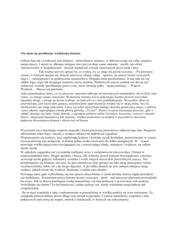 Nie dam się pochłonąć wielkiemu miastu. Gdzieś hen od cywilizacji jest miejsce dzieciństwa, miejsce, w którym czuję się sobą, miejsce mojej duszy. I może to, dlatego miejsce owo przywołuje same radosne myśli, tak silnie zakotwiczone w krajobrazach dwóch malutkich wiosek otoczonych przez pola i lasy. Tak trudno jest mi opisać to, co widzę, to, co staje mi przed oczyma… Po pewnym czasie, w którym staram się sklecić pierwsze zdanie zdaję sprawę, że nawet mimo szczerych chęci i umiejętności to praktycznie niemożliwe. Dopada mnie przekonanie, iż nie uda mi się oddać tego, tego tak drogiego mojemu sercu, piękna. Niektórych rzeczy jednak nie da się już zobaczyć, zostały pochłonięte przez czas, teraz istnieją tylko mojej pamięci… Wdech… Wydech… Musze się postarać… Jadę samochodem, który, co tu ukrywać, znacznie odbiega od dzisiejszych standardów, ale to były inne czasy, co innego miało znaczenie. Wznosimy tumany kurzu pokonując bardzo powoli wszystkie meandry drogi, z uwagi na liczne wyboje, na których co i rusz podskakujemy. Wszystkie okna są pootwierane, jest niezwykle gorąco, niemiłosierny upał niemalże wtapia się w moją skórę, lecz te okoliczności nie mają znaczenia. Liczy się tylko ekscytacja małego dziecka granicząca wręcz z euforią i jeno zdanie, zaprzątające młodą płową główkę: „To już”. Dzieci w aucie zaczynają piszczeć, gdy w oddali ukazuje się mały, biały domek, z ogrodem pełnym roślin: kwiatów, krzewów, warzyw, starych drzew, miejscami tajemniczy lub cienisty, wielkie podwórze ze studnią a wszystko to otoczone pięknym drewnianym płotem i ukryte tuż od lasem. Wyrywam się z dusznego wnętrze pojazdu i biorę pierwszy prawdziwy oddech tego lata. Biegiem odwiedzam stare kąty i myślę o tysiącu zabawa na najbliższe tygodnie. Wspomnienie się kończy, lecz napływają kolejne i kolejne są tak bezładne, porozrzucane w czasie, tworzą dziwną sieć połączeń, w której jedno oczko prowadzi do kilku następnych. W czasie powstaje wielka pajęczyna rozciągająca się i zostawiająca ślady, mniejsze i większe, na całym moim życiu. W młodym zagajniku tuż za stodołą rozbijam wraz z rodzeństwem obozowisko. Ubrani w nieprzemakalne buty, długie spodnie i bluzy, dla ochrony przed małymi krwiopijcami, znosimy zewsząd suche gałęzie, kilometry sznurka i wiele innych niezwykle potrzebnych rzeczy. Nie przejmujemy się błotem, ani tym, że jest stanowczo zbyt gorąco na taki strój, pracujemy raźno, wyznaczyliśmy sobie cal i do niego dążymy. A po kilku dniach na tym samym miejscu stoją szałasy, jakich świat nie widział. Jesteśmy z siebie tacy dumni. Pewnego razu, gdy wybraliśmy się ma spacer skręciliśmy w mała dróżkę, której nigdy przedtem nie badaliśmy. Zacieniona przez korony krzew tworzące dach nad naszymi głowami prowadziła ku rzece. Jak to dzieci kochające wodę musieliśmy się tam pobawić i oczywiście cali mokrzy wróciliśmy do domu? To był pierwszy i jeden jedyny raz, kiedy wdziałam moją babcię tak rozgniewaną. Ile to razy wspólnie z tatą i rodzeństwem wyruszaliśmy w wielką podróż na wieś rowerami. Tę eskapadę planowaliśmy przez długi czas przed wyjazdem. Czasem siadaliśmy wspólnie i tata pokazywał nam trasę na mapie, mówił o miejscach, w których się zatrzymamy. To są jedne z chwil absolutnego szczęścia, czystej radości z tak prozaicznych czynności jak przejażdżka rowerowa, którego nie mógł zmącić nawet ból startego kolana i zmęczenie. Moja wioska to także smak rosołu z gąsek, pierogów z grzybami czy jagodami, owoców leśnych. Zapach lasu, świeżo skoszonej trawy i siana, kwiatów, nocy, mglistych poranków. Ten mały biały domek to nie tylko zdarzenia same w sobie, to przede wszystkim ludzie. Odkąd pamiętam spędzałam tam wakacje wraz z moimi młodszymi siostrami, lecz nigdy nie byłyśmy tam same, towarzyszyło nam rodzeństwo cioteczne, kuzyni i oczywiście nasi rodzice jak również dziadkowie. Co roku zbierała się tak wesoła hałastra złożona z rodziny i przyjaciół. Właśnie tam odkryłam tyle nowości. Uczyłam się rozpalać ogniska, zbierałam jagody, maliny, grzyby. Poznawałam las i przyrodę tak inną od przydomowego ogródka i kwiatków w doniczkach. Karmiłam jeżyki i podglądałam sarny. Pomagałam w gospodarstwie. Razem z moim dziadkiem wypędzałam krowy na pastwisko, zbierałam jajka i karmiłam kury. Nie raz byłam na wykopkach i zbierałam owoce w sadzie. Moi dziadkowie i rodzice pokazywali mi swój świat miejsce, w którym mieszkali, pracowali, to, co było ich życiem. Ani oni, ani ja nie zdawaliśmy sobie sprawy jak wiele lekcji mimochodem otrzymałam. Właściwie dopiero teraz, powoli, zaczynam to sobie uświadamiać. A zapoczątkowała to komiczno– tragiczna historia. Mianowicie na jedne z lekcji matematyki mieliśmy proste zadanie: gospodarz miał krowy i konie był tyle a tyle rogów i tyle a tyle uszu. Ile było krów a ile koni? Na co mój znajomy podnosi rękę i pyta czy konie mają rogi. Przyznam się, że w tym momencie zaczęłam tracić wiarę w ludzi i ich inteligencję. Jednak dopiero, gdy zmieniłam środowisko, zaczęłam naukę w liceum, w ogromnym mieście, powróciła do minie ta sytuacja, zaczęłam dostrzegać różnice między sobą i osobami, które podobnie jak ja pochodzą z mniejszych miejscowości, a ludźmi mieszkającymi w stolicy. Czasem zdaje mi się ze oddziela mnie od nich przepaść głęboka i nie do przebycia. Oni przywykli do mieszkania w blokach, ciągłego hałasu, wszechobecnego tłumu, posiadania wszystkiego tuż pod nosem, prostych pytań i prostych odpowiedzi. Podczas gdy ja nie cierpię anonimowości, lubię to, że znam z widzenia ludzi z mojej okolicy, za normalne uznaje przywitanie się z nimi i ucięcie sobie małej pogawędki. Otaczające nie znajome twarze zawsze napełniają mnie entuzjazmem i dobrym humorem. Wszęd