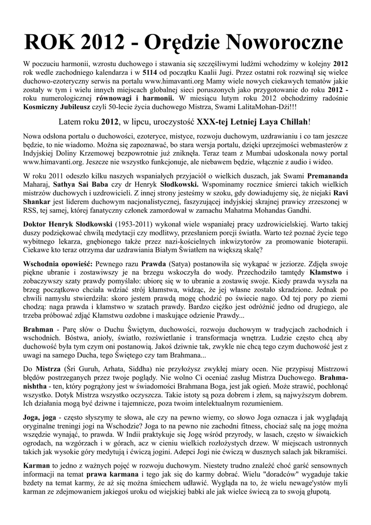 ROK 2012 - Orędzie Noworoczne W poczuciu harmonii, wzrostu duchowego i stawania się szczęśliwymi ludźmi wchodzimy w kolejny 2012 rok wedle zachodniego kalendarza i w 5114 od początku Kaalii Jugi. Przez ostatni rok rozwinął się wielce duchowo-ezoteryczny serwis na portalu www.himavanti.org Mamy wiele nowych ciekawych tematów jakie zostały w tym i wielu innych miejscach globalnej sieci poruszonych jako przygotowanie do roku 2012 roku numerologicznej równowagi i harmonii. W miesiącu lutym roku 2012 obchodzimy radośnie Kosmiczny Jubileusz czyli 50-lecie życia duchowego Mistrza, Swami LalitaMohan-Dżi!!! Latem roku 2012, w lipcu, uroczystość XXX-tej Letniej Laya Chillah! Nowa odsłona portalu o duchowości, ezoteryce, mistyce, rozwoju duchowym, uzdrawianiu i co tam jeszcze będzie, to nie wiadomo. Można się zapoznawać, bo stara wersja portalu, dzięki uprzejmości webmasterów z Indyjskiej Doliny Krzemowej bezpowrotnie już zniknęła. Teraz team z Mumbai udoskonala nowy portal www.himavanti.org. Jeszcze nie wszystko funkcjonuje, ale niebawem będzie, włącznie z audio i wideo. W roku 2011 odeszło kilku naszych wspaniałych przyjaciół o wielkich duszach, jak Swami Premananda Maharaj, Sathya Sai Baba czy dr Henryk Słodkowski. Wspominamy rocznice śmierci takich wielkich mistrzów duchowych i uzdrowicieli. Z innej strony jesteśmy w szoku, gdy dowiadujemy się, że niejaki Ravi Shankar jest liderem duchowym nacjonalistycznej, faszyzującej indyjskiej skrajnej prawicy zrzeszonej w RSS, tej samej, której fanatyczny członek zamordował w zamachu Mahatma Mohandas Gandhi. Doktor Henryk Słodkowski (1953-2011) wykonał wiele wspaniałej pracy uzdrowicielskiej. Warto takiej duszy podziękować chwilą medytacji czy modlitwy, przesłaniem porcji światła. Warto też poznać życie tego wybitnego lekarza, gnębionego także przez nazi-kościelnych inkwizytorów za promowanie bioterapii. Ciekawe kto teraz otrzyma dar uzdrawiania Białym Światłem na większą skalę? Wschodnia opowieść: Pewnego razu Prawda (Satya) postanowiła się wykąpać w jeziorze. Zdjęła swoje piękne ubranie i zostawiwszy je na brzegu wskoczyła do wody. Przechodziło tamtędy Kłamstwo i zobaczywszy szaty prawdy pomyślało: ubiorę się w to ubranie a zostawię swoje. Kiedy prawda wyszła na brzeg początkowo chciała wdziać strój kłamstwa, widząc, że jej własne zostało skradzione. Jednak po chwili namysłu stwierdziła: skoro jestem prawdą mogę chodzić po świecie nago. Od tej pory po ziemi chodzą: naga prawda i kłamstwo w szatach prawdy. Bardzo ciężko jest odróżnić jedno od drugiego, ale trzeba próbować zdjąć Kłamstwu ozdobne i maskujące odzienie Prawdy... Brahman - Parę słów o Duchu Świętym, duchowości, rozwoju duchowym w tradycjach zachodnich i wschodnich. Bóstwa, anioły, światło, rozświetlanie i transformacja wnętrza. Ludzie często chcą aby duchowość była tym czym oni postanowią. Jakoś dziwnie tak, zwykle nie chcą tego czym duchowość jest z uwagi na samego Ducha, tego Świętego czy tam Brahmana... Do Mistrza (Śri Guruh, Arhata, Siddha) nie przyłożysz zwykłej miary ocen. Nie przypisuj Mistrzowi błędów postrzeganych przez twoje poglądy. Nie wolno Ci oceniać zasług Mistrza Duchowego. Brahmanishtha - ten, który pogrążony jest w świadomości Brahmana Boga, jest jak ogień. Może strawić, pochłonąć wszystko. Dotyk Mistrza wszystko oczyszcza. Takie istoty są poza dobrem i złem, są najwyższym dobrem. Ich działania mogą być dziwne i tajemnicze, poza twoim intelektualnym rozumieniem. Joga, joga - często słyszymy te słowa, ale czy na pewno wiemy, co słowo Joga oznacza i jak wyglądają oryginalne treningi jogi na Wschodzie? Joga to na pewno nie zachodni fitness, chociaż salę na jogę można wszędzie wynająć, to prawda. W Indii praktykuje się Jogę wśród przyrody, w lasach, często w śiwaickich ogrodach, na wzgórzach i w górach, acz w cieniu wielkich rozłożystych drzew. W miejscach ustronnych takich jak wysokie góry medytują i ćwiczą jogini. Adepci Jogi nie ćwiczą w dusznych salach jak bikramiści. Karman to jedno z ważnych pojęć w rozwoju duchowym. Niestety trudno znaleźć choć garść sensownych informacji na temat prawa karmana i tego jak się do karmy dobrać. Wielu "doradców" wygaduje takie bzdety na temat karmy, że aż się można śmiechem udławić. Wygląda na to, że wielu newage'ystów myli karman ze zdejmowaniem jakiegoś uroku od wiejskiej babki ale jak wielce świecą za to swoją głupotą. Wiele osób praktykuje sobie wielkie pytanie "Kim jestem?" Ale nie wielu wie, że ta praktyka ma kilka części. Pierwsza część to "Deham Naham" - "Nie jestem tym ciałem". Dosłownie "Ciałem nie jestem!". Dopiero jak identyfikacja z ciałem osłabnie, dodajemy drugą część: "Koham Soham" lub "Koham Idam Aham". "Koham" to pytanie Kim jestem? "Soham!" to "Nim jestem". "Idam Aham" znaczy "Tym Jestem!" Koham? to pytanie "Kim Jestem?" "Soham" w kontekście będzie "Nim jestem" i odnoszone jest do Brahmana - Wszechducha... Samego "Soham" nie robimy, bo ma wtedy rzeczownikowe znaczenie "Pług", co rozbawia. Tylko w kontekście zdania, do pytania, zatem zawsze całość praktyki brzmi, na jednej połowie oddechu: "Koham?", a na drugiej "Soham!". Nie ma w tym procesie czegoś takiego, co robi się na zachodzie, że zadaje się pytanie, a odpowiedź jakaś tam sobie sama przychodzi. Ciagle dążymy w tym uświadamianiu do Brahmana, którym jest On - "Sa"... I pracujemy na drugiej połowie oddechu z "Nim jestem!" czyli z "Soham". Preferujemy formę "Idam Aham" zamiast "Soham", co znaczy "Idam Aham!" „Tym Jestem”, a Idam może tyczyć także Wszechświata, Ducha Kosmosu, Brahmana jak i osobowych postaci świętych, aniołów, bóstwa etc... Jest pewien problem z tym "Soham", zależnie czy to jest część jakiejś wypowiedzi czy osobna fraza. Jako fraza w zdaniu złożonym może być "So Aham" - Nim jes