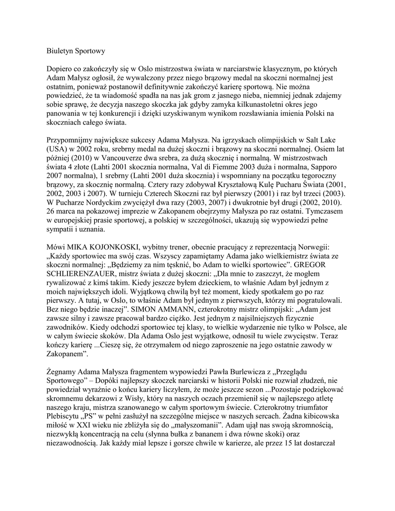 Biuletyn Sportowy Dopiero co zakończyły się w Oslo mistrzostwa świata w narciarstwie klasycznym, po których Adam Małysz ogłosił, że wywalczony przez niego brązowy medal na skoczni normalnej jest ostatnim, ponieważ postanowił definitywnie zakończyć karierę sportową. Nie można powiedzieć, że ta wiadomość spadła na nas jak grom z jasnego nieba, niemniej jednak zdajemy sobie sprawę, że decyzja naszego skoczka jak gdyby zamyka kilkunastoletni okres jego panowania w tej konkurencji i dzięki uzyskiwanym wynikom rozsławiania imienia Polski na skoczniach całego świata. Przypomnijmy największe sukcesy Adama Małysza. Na igrzyskach olimpijskich w Salt Lake (USA) w 2002 roku, srebrny medal na dużej skoczni i brązowy na skoczni normalnej. Osiem lat póżniej (2010) w Vancouverze dwa srebra, za dużą skocznię i normalną. W mistrzostwach świata 4 złote (Lahti 2001 skocznia normalna, Val di Fiemme 2003 duża i normalna, Sapporo 2007 normalna), 1 srebrny (Lahti 2001 duża skocznia) i wspomniany na początku tegoroczny brązowy, za skocznię normalną. Cztery razy zdobywał Kryształową Kulę Pucharu Świata (2001, 2002, 2003 i 2007). W turnieju Czterech Skoczni raz był pierwszy (2001) i raz był trzeci (2003). W Pucharze Nordyckim zwyciężył dwa razy (2003, 2007) i dwukrotnie był drugi (2002, 2010). 26 marca na pokazowej imprezie w Zakopanem obejrzymy Małysza po raz ostatni. Tymczasem w europejskiej prasie sportowej, a polskiej w szczególności, ukazują się wypowiedzi pełne sympatii i uznania. Mówi MIKA KOJONKOSKI, wybitny trener, obecnie pracujący z reprezentacją Norwegii: „Każdy sportowiec ma swój czas. Wszyscy zapamiętamy Adama jako wielkiemistrz świata ze skoczni normalnej: „Będziemy za nim tęsknić, bo Adam to wielki sportowiec”. GREGOR SCHLIERENZAUER, mistrz świata z dużej skoczni: „Dla mnie to zaszczyt, że mogłem rywalizować z kimś takim. Kiedy jeszcze byłem dzieckiem, to właśnie Adam był jednym z moich największych idoli. Wyjątkową chwilą był też moment, kiedy spotkałem go po raz pierwszy. A tutaj, w Oslo, to właśnie Adam był jednym z pierwszych, którzy mi pogratulowali. Bez niego będzie inaczej”. SIMON AMMANN, czterokrotny mistrz olimpijski: „Adam jest zawsze silny i zawsze pracował bardzo ciężko. Jest jednym z najsilniejszych fizycznie zawodników. Kiedy odchodzi sportowiec tej klasy, to wielkie wydarzenie nie tylko w Polsce, ale w całym świecie skoków. Dla Adama Oslo jest wyjątkowe, odnosił tu wiele zwycięstw. Teraz kończy karierę ...Cieszę się, że otrzymałem od niego zaproszenie na jego ostatnie zawody w Zakopanem”. Żegnamy Adama Małysza fragmentem wypowiedzi Pawła Burlewicza z „Przeglądu Sportowego” – Dopóki najlepszy skoczek narciarski w historii Polski nie rozwiał złudzeń, nie powiedział wyrażnie o końcu kariery liczyłem, że może jeszcze sezon ...Pozostaje podziękować skromnemu dekarzowi z Wisły, który na naszych oczach przemienił się w najlepszego atletę naszego kraju, mistrza szanowanego w całym sportowym świecie. Czterokrotny triumfator Plebiscytu „PS” w pełni zasłużył na szczególne miejsce w naszych sercach. Żadna kibicowska miłość w XXI wieku nie zbliżyła się do „małyszomanii”. Adam ujął nas swoją skromnością, niezwykłą koncentracją na celu (słynna bułka z bananem i dwa równe skoki) oraz niezawodnością. Jak każdy miał lepsze i gorsze chwile w karierze, ale przez 15 lat dostarczał nam wzruszeń z imponującą regularnością. Aż 132 razy jako reprezentant Polski wchodził na podium w międzynarodowej rywalizacji. Jak nikt inny. Dziękujemy ci, mistrzu! Jerzy Duński