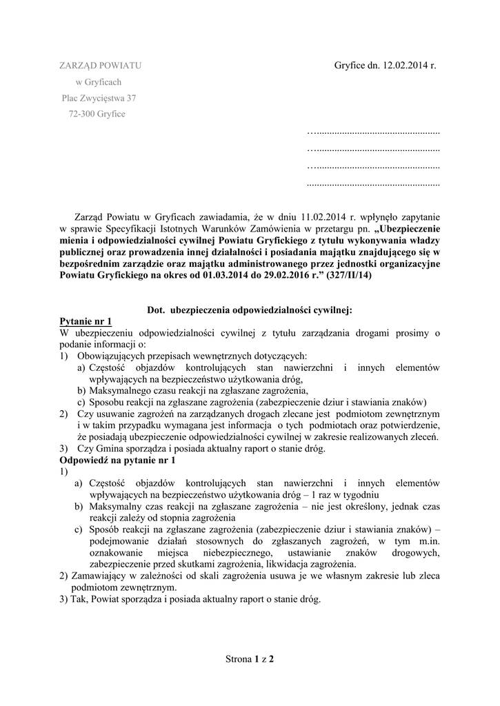 ZARZĄD POWIATU Gryfice dn. 12.02.2014 r. w Gryficach Plac Zwycięstwa 37 72-300 Gryfice …................................................. …................................................. …................................................. ..................................................... Zarząd Powiatu w Gryficach zawiadamia, że w dniu 11.02.2014 r. wpłynęło zapytanie w sprawie Specyfikacji Istotnych Warunków Zamówienia w przetargu pn. „Ubezpieczenie mienia i odpowiedzialności cywilnej Powiatu Gryfickiego z tytułu wykonywania władzy publicznej oraz prowadzenia innej działalności i posiadania majątku znajdującego się w bezpośrednim zarządzie oraz majątku administrowanego przez jednostki organizacyjne Powiatu Gryfickiego na okres od 01.03.2014 do 29.02.2016 r.” (327/II/14) Dot. ubezpieczenia odpowiedzialności cywilnej: Pytanie nr 1 W ubezpieczeniu odpowiedzialności cywilnej z tytułu zarządzania drogami prosimy o podanie informacji o: 1) Obowiązujących przepisach wewnętrznych dotyczących: a) Częstość objazdów kontrolujących stan nawierzchni i innych elementów wpływających na bezpieczeństwo użytkowania dróg, b) Maksymalnego czasu reakcji na zgłaszane zagrożenia, c) Sposobu reakcji na zgłaszane zagrożenia (zabezpieczenie dziur i stawiania znaków) 2) Czy usuwanie zagrożeń na zarządzanych drogach zlecane jest podmiotom zewnętrznym i w takim przypadku wymagana jest informacja o tych podmiotach oraz potwierdzenie, że posiadają ubezpieczenie odpowiedzialności cywilnej w zakresie realizowanych zleceń. 3) Czy Gmina sporządza i posiada aktualny raport o stanie dróg. Odpowiedź na pytanie nr 1 1) a) Częstość objazdów kontrolujących stan nawierzchni i innych elementów wpływających na bezpieczeństwo użytkowania dróg – 1 raz w tygodniu b) Maksymalny czas reakcji na zgłaszane zagrożenia – nie jest określony, jednak czas reakcji zależy od stopnia zagrożenia c) Sposób reakcji na zgłaszane zagrożenia (zabezpieczenie dziur i stawiania znaków) – podejmowanie działań stosownych do zgłaszanych zagrożeń, w tym m.in. oznakowanie miejsca niebezpiecznego, ustawianie znaków drogowych, zabezpieczenie przed skutkami zagrożenia, likwidacja zagrożenia. 2) Zamawiający w zależności od skali zagrożenia usuwa je we własnym zakresie lub zleca podmiotom zewnętrznym. 3) Tak, Powiat sporządza i posiada aktualny raport o stanie dróg. Strona 1 z 2 Dot. ubezpieczenia od ognia i innych zdarzeń losowych: Pytanie nr 2 Czy w ubezpieczanym majątku Powiatu Gryfickiego występują pustostany/nieużytki, jeśli tak proszę o ich wskazanie oraz określenie sposobu zabezpieczenia przed dostępem osób trzecich? Odpowiedź na pytanie nr 2 Zamawiający potwierdza, iż do ubezpieczenia nie zostały zgłoszone pustostany/nieużytki. Jednakże nie można wykluczyć wystąpienia pustostanów/nieużytków w trakcie trwania Umowy ubezpieczenia. Pytanie nr 3 Prosimy o informację czy na terenie Powiatu Gryfickiego którakolwiek ze zgłoszonych do ubezpieczenia lokalizacji znajduje się na terenie zagrożonym ryzykiem powodzi i podtopień wskutek opadów atmosferycznych? Czy od 1996r. ryzyka takie wystąpiły na terenie Powiatu Gryfickiego? Odpowiedź na pytanie nr 3 Zamawiający informuje, iż na terenie Powiatu Gryfickiego oraz jednostek Powiatu zgłoszonych do ubezpieczenia nie znajdują się lokalizacje zagrożone ryzykiem powodzi i podtopień wskutek opadów atmosferycznych. Jednocześnie Zamawiający wyjaśnia, iż od 1996 r. wskazane ryzyka nie wystąpiły na terenie Powiatu Gryfickiego. Strona 2 z 2