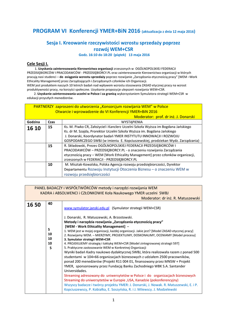 PROGRAM VI Konferencji YMER+BiN 2016 (aktualizacja z dnia 12 maja 2016) Sesja I. Kreowanie rzeczywistości wzrostu sprzedaży poprzez rozwój WEM+CSR Godz. 16:10 do 18:20 (piątek) 13 maja 2016 Cele Sesji I. 1. Uzyskania zainteresowania Kierownictwa organizacji zrzeszonych w OGÓLNOPOLSKIEJ FEDERACJI PRZEDSIĘBIORCÓW I PRACODAWCÓW - PRZEDSIĘBIORCY.PL oraz zainteresowanie Kierownictwa organizacji w których pracują nasi studenci – do osiągania wzrostu sprzedaży poprzez rozwijanie „Zarządzania etycznością pracy” [WEM –Work Ethicality Management] przez Zarządzających i Zarządzanych członków ich Organizacji. WEM jest produktem naszych 10 letnich badań nad wpływem wzrostu stosowania ZASAD etycznej pracy na wzrost produktywności pracy, na korzyści społeczne. Uzyskanie propozycje ulepszeń rozwijania WEM+CSR. 2. Uzyskanie zainteresowania uczelni w Polsce i za granicą wykorzystaniem Symulatora strategii WEM+CSR w edukacji przyszłych menedżerów. PARTNERZY zaproszeni do utworzenia „Konsorcjum rozwijania WEM” w Polsce Otwarcie i wprowadzenie do VI Konferencji YMER+BiN 2016 Moderator: prof. dr inż. J. Donarski Godzina Czas 16 10 15 15 10 WYSTĄPIENIA Ks. M. Piwko CR, Założyciel i Kanclerz Uczelni Szkoła Wyższa im Bogdana Jańskiego Ks. dr M. Szajda, Prorektor Uczelni Szkoła Wyższa im. Bogdana Jańskiego J. Donarski, Koordynator badań YMER INSTYTUTU INNOWACJI I ROZWOJU GOSPODARCZEGO SWBJ (w imieniu E. Kopciuszewskiej, prodziekan Wydz. Zarządzania) R. Składowski, Prezes OGÓLNOPOLSKIEJ FEDERACJI PRZEDSIĘBIORCÓW I PRACODAWCÓW – PRZEDSIĘBIORCY.PL - o znaczeniu rozwijania Zarządzania etycznością pracy – WEM [Work Ethicality Management] przez członków organizacji, zrzeszonych w FEDERACJI - PRZEDSIĘBIORCY.PL M. Misztak-Kowalska, Polska Agencja rozwoju przedsiębiorczości, Dyrektor Departamentu Rozwoju Instytucji Otoczenia Biznesu – o znaczeniu WEM w rozwoju przedsiębiorczości 16 PANEL BADACZY i WSPÓŁTWÓRCÓW metody i narzędzi rozwijania WEM KADRA i ABSOLWENCI i CZŁONKOWIE Koła Naukowego YMER uczelni SWBJ Moderator: dr inż. R. Matuszewski 50 40 www.symulator.janski.edu.pl (Symulator strategii WEM+CSR) 5 10 10 10 5 J. Donarski, R. Matuszewski, A. Brzostowski. Metody i narzędzia rozwijania „Zarządzania etycznością pracy” [WEM - Work Ethicality Management] – 1. WEM jest w mojej organizacji, każdej organizacji. Jakie jest? [Model ZASAD etycznej pracy] 2. Rozwijamy WEM. – MIERZYMY, PROJEKTUJMY, DOSKONALIMY, OCENIAMY [Model procesu] 3. Symulator strategii WEM+CSR 4. PROJEKUJEMY strategię i taktykę WEM+CSR [Model zintegrowanej strategii 597] 5. Praktyczne zastosowanie WEM w Konkretnej Organizacji Wyniki badań Kadry naukowo dydaktycznej SWBJ, która realizowała razem z ponad 500 studentami w 104+66 organizacjach biznesowych z udziałem 2500 pracowników, ponad 200 menedżerów (Projekt R11 004 01, finansowany przez MNSW + Projekt YMER, sponsorowany przez Fundację Banku Zachodniego WBK S.A. Santander Universidades. Streaming adresowany do uniwersytetów w Polsce i do organizacjach biznesowych Streaming do uniwersytetów w Europie ,USA, Kanadzie (pokonferencyjny) Wszyscy badacze i twórcy projektu YMER: J. Donarski, J. Nowak. R. Matuszewski, E. i P. Kopciuszewscy, P. Kobiałka, E. Soszyńska, R. i J. Milewscy. J. Modzelewski 1 10 17 30 30 17 40 10 18 20 J. Donarski, Harmonogram jest przedstawiony w materiale VI Konferencji. Projekt pilotażowego rozwijania „Zarządzania etycznością pracy” [WEM – Work Ethicality Management] przez organizacje Federacji PRZEDSIĘBIORCY.PL, jako wzorca transmisji wyników badań uczelni przez studentów i absolwentów do organizacji biznesowych i samorządowych, dla wykorzystania przez uczelnie i przedsiębiorstwa MŚP w Polsce i Europie. Dalsze badania dla doskonalenia metody i narzędzi rozwijania WEM i Społecznej Odpowiedzialności [CSR]. Propozycja przygotowania, razem z Polską Agencją Rozwoju Przedsiębiorczości, WYKŁADOWCÓW WEM z 236 ośrodków Krajowego Systemu Usług (KSU), jako Systemu Odziaływania Pro etycznego (SOPE). System jest opisany w „Projekt normy etyczności pracy EK1000”, strona 24-25 Projekt pilotażowego rozwoju WEM + CSR wnioskowany do sponsorowania przez Fundację Banku Zachodniego WBK S.A. (Santander Universidades) PYTANIA. KRÓTKIE WYPOWIEDZI uczestniczących organizacji PRZEDSIĘBIORCY.PL, Organizacji w których pracują nasi studenci, Przedstawiciel Fundacji Banku Zachodniego WBK S.A. Kadra naukowo dydaktyczna SWBJ wpisuje propozycje do „KARTY KONSULTANTA” Wręczenie DYPLOMÓW „Załoga firmy z wysoka etycznością pracy” (o ile będą zgłoszenia przez Federację PRZEDSEBIORCY.PL). Wręczenie pamiątkowych publikacji Koniec Sesji I. Sesja II. Transmisja Skype z Uniwersytetu UQAM z Montrealu (Kanada). Jak chcę kreować rzeczywistość rozwijania WEM+CSR w organizacji w której pracuję. Przygotowanie do Światowych Dni Młodzieży Godz. 18:30 do 20:00 (piątek) 13 maja 2016 Cel Sesji II. (uczestniczą głównie studenci) Popularyzować stosowanie wyższych technologii wykorzystania Internetu do prowadzenia badan w ramach sieci internetowej YMER worldwide net [Young Managers Ethicality Researchers] i stosowania do symulacji WEM+CSR jako formy wyższej jakości edukacji przyszłych menedżerów na uczelniach. Zebrać propozycje studentów zwiększenia „siły INSPIRACJI” do „studiowanie, szerzenia i stosowania” nauczania społecznego Jana Pawła II. Ta INSPIRACJA ma przypomnieć przyszłym menedżerom, uczestnikom Światowych Dni Młodzieży, to czego nauczał Jan Paweł II. Wyłonić najlepsze propozycje studentów: „Jak chcę kreować rzeczywistość rozwijania WEM + CSR+ SRD w organizacji w której pracuję”. TRANSMISJA SKYPE z University du Québeck a Montreal – UQAM Moderatorzy: prof. dr inż. J. Donarski, dr inż. R Matuszewski 18 30 30 Profesor tego uniwersytetu prof. Michele RIOUX odpowie na cztery pytania (1 do 4) o lepszym wy
