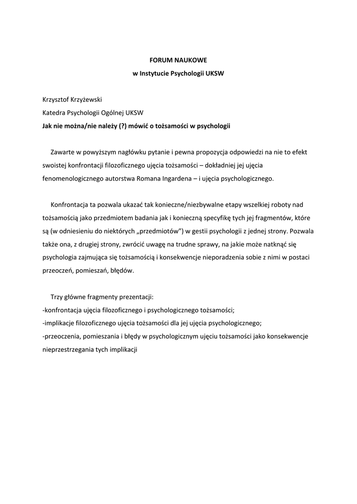FORUM NAUKOWE w Instytucie Psychologii UKSW Krzysztof Krzyżewski Katedra Psychologii Ogólnej UKSW Jak nie można/nie należy (?) mówić o tożsamości w psychologii Zawarte w powyższym nagłówku pytanie i pewna propozycja odpowiedzi na nie to efekt swoistej konfrontacji filozoficznego ujęcia tożsamości – dokładniej jej ujęcia fenomenologicznego autorstwa Romana Ingardena – i ujęcia psychologicznego. Konfrontacja ta pozwala ukazad tak konieczne/niezbywalne etapy wszelkiej roboty nad tożsamością jako przedmiotem badania jak i konieczną specyfikę tych jej fragmentów, które są (w odniesieniu do niektórych „przedmiotów”) w gestii psychologii z jednej strony. Pozwala także ona, z drugiej strony, zwrócid uwagę na trudne sprawy, na jakie może natknąd się psychologia zajmująca się tożsamością i konsekwencje nieporadzenia sobie z nimi w postaci przeoczeo, pomieszao, błędów. Trzy główne fragmenty prezentacji: -konfrontacja ujęcia filozoficznego i psychologicznego tożsamości; -implikacje filozoficznego ujęcia tożsamości dla jej ujęcia psychologicznego; -przeoczenia, pomieszania i błędy w psychologicznym ujęciu tożsamości jako konsekwencje nieprzestrzegania tych implikacji