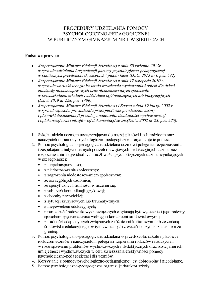 PROCEDURY UDZIELANIA POMOCY PSYCHOLOGICZNO-PEDAGOGICZNEJ W PUBLICZNYM GIMNAZJUM NR 1 W SIEDLCACH Podstawa prawna: Rozporządzenie Ministra Edukacji Narodowej z dnia 30 kwietnia 2013r. w sprawie udzielania i organizacji pomocy psychologiczno-pedagogicznej w publicznych przedszkolach, szkołach i placówkach (Dz.U. 2013 nr 0 poz. 532) Rozporządzenie Ministra Edukacji Narodowej z dnia 17 listopada 2010 r. w sprawie warunków organizowania kształcenia wychowania i opieki dla dzieci młodzieży niepełnosprawnych oraz niedostosowanych społecznie w przedszkolach, szkołach i oddziałach ogólnodostępnych lub integracyjnych (Dz.U. 2010 nr 228, poz. 1490), Rozporządzenie Ministra Edukacji Narodowej i Sportu z dnia 19 lutego 2002 r. w sprawie sposobu prowadzenia przez publiczne przedszkola, szkoły i placówki dokumentacji przebiegu nauczania, działalności wychowawczej i opiekuńczej oraz rodzajów tej dokumentacji ze zm.(Dz.U. 2002 nr 23, poz. 225). 1. Szkoła udziela uczniom uczęszczającym do naszej placówki, ich rodzicom oraz nauczycielom pomocy psychologiczno-pedagogicznej i organizuje tę pomoc. 2. Pomoc psychologiczno-pedagogiczna udzielana uczniowi polega na rozpoznawaniu i zaspokajaniu indywidualnych potrzeb rozwojowych i edukacyjnych ucznia oraz rozpoznawaniu indywidualnych możliwości psychofizycznych ucznia, wynikających w szczególności: z niepełnosprawności; z niedostosowania społecznego; z zagrożenia niedostosowaniem społecznym; ze szczególnych uzdolnień; ze specyficznych trudności w uczeniu się; z zaburzeń komunikacji językowej; z choroby przewlekłej; z sytuacji kryzysowych lub traumatycznych; z niepowodzeń edukacyjnych; z zaniedbań środowiskowych związanych z sytuacją bytową ucznia i jego rodziny, sposobem spędzania czasu wolnego i kontaktami środowiskowymi; z trudności adaptacyjnych związanych z różnicami kulturowymi lub ze zmianą środowiska edukacyjnego, w tym związanych z wcześniejszym kształceniem za granicą. 3. Pomoc psychologiczno-pedagogiczna udzielana w przedszkolu, szkole i placówce rodzicom uczniów i nauczycielom polega na wspieraniu rodziców i nauczycieli w rozwiązywaniu problemów wychowawczych i dydaktycznych oraz rozwijaniu ich umiejętności wychowawczych w celu zwiększania efektywności pomocy psychologiczno-pedagogicznej dla uczniów. 4. Korzystanie z pomocy psychologiczno-pedagogicznej jest dobrowolne i nieodpłatne. 5. Pomoc psychologiczno-pedagogiczną organizuje dyrektor szkoły. 6. Pomocy psychologiczno-pedagogicznej w przedszkolu, szkole i placówce udzielają uczniom nauczyciele, wychowawcy oraz specjaliści wykonujący w szkole zadania z zakresu pomocy psychologiczno-pedagogicznej. 7. Pomoc psychologiczno-pedagogiczna jest organizowana i udzielana we współpracy z: rodzicami uczniów, poradniami psychologiczno-pedagogicznymi, placówkami doskonalenia nauczycieli, innymi szkołami i placówkami, organizacjami pozarządowymi oraz innymi instytucjami działającymi na rzecz rodziny, dzieci i młodzieży. 8. Pomoc psychologiczno-pedagogiczna w przedszkolu, szkole i placówce jest udzielana z inicjatywy: ucznia, rodziców ucznia, dyrektora szkoły, pedagoga szkolnego, nauczyciela, wychowawcy klasy lub specjalisty, prowadzących zajęcia z uczniem, pielęgniarki szkolnej, poradni, asystenta edukacji romskiej, pracownika socjalnego, asystenta rodziny, kuratora sądowego. 9. W szkole pomoc psychologiczno-pedagogiczna jest udzielana w trakcie bieżącej pracy z uczniem oraz w formie zajęć rozwijających uzdolnienia, zajęć dydaktycznowyrównawczych, zajęć związanych z wyborem kierunku kształcenia i zawodu oraz planowaniem kształcenia i kariery zawodowej, warsztatów oraz indywidualnych porad i konsultacji. 10. W szkole pomoc psychologiczno-pedagogiczna jest udzielana rodzicom uczniów i nauczycielom w formie porad, konsultacji, warsztatów i szkoleń. 11. W przypadku stwierdzenia, że uczeń ze względu na potrzeby rozwojowe lub edukacyjne oraz możliwości psychofizyczne wymaga objęcia pomocą psychologiczno-pedagogiczną, odpowiednio nauczyciel, wychowawca lub specjalista niezwłocznie udzielają uczniowi tej pomocy w trakcie bieżącej pracy z uczniem i informują o tym wychowawcę klasy oraz dyrektora szkoły. 12. Wychowawca klasy lub dyrektor szkoły informuje innych nauczycieli lub specjalistów pracujących z uczniem o potrzebie objęcia ucznia pomocą psychologicznopedagogiczną. 13. W przypadku stwierdzenia, że konieczne jest objęcie ucznia pomocą psychologicznopedagogiczną wychowawca klasy planuje i koordynuje udzielanie uczniowi pomocy psychologiczno-pedagogicznej, w tym ustala formy udzielania tej pomocy, okres ich udzielania oraz wymiar godzin, w którym poszczególne formy będą realizowane i umieszcza je w Karcie Informacyjnej danego ucznia. 14. Wychowawca klasy, planując udzielanie uczniowi pomocy psychologicznopedagogicznej, współpracuje z rodzicami ucznia lub pełnoletnim uczniem oraz – w zależności od potrzeb – z innymi nauczycielami i specjalistami, prowadzącymi zajęcia z uczniem, poradnią lub innymi osobami zajmującymi się udzielaniem pomocy psychologiczno-pedagogicznej. 15. W przypadku gdy uczeń był objęty pomocą psychologiczno-pedagogiczną na poprzednim poziomie edukacyjnym wychowawca klasy, planując udzielanie uczniowi pomocy psychologiczno-pedagogicznej, uwzględnia wnioski dotyczące dalszej pracy z uczniem, zawarte w dokumentacji prowadzonej wcześniej. 16. W przypadku gdy uczeń posiada opinię poradni lub orzeczenie o potrzebie indywidualnego nauczania, wychowawca klasy, planując udzielanie uczniowi pomocy psychologiczno-pedagogicznej, uwzględnia zalecenia zawarte w tej opinii lub orzeczeniu. 17. W przypadku ucznia posiadającego orzeczenie o potrzebie kształcenia specjalnego zespół składający się z nauczycieli i specjalistów pracujących z uczniem opracowuje indywidualny program edukacyjno-terapeutycznym (IPET), który uwzględnia zalecenia zawa