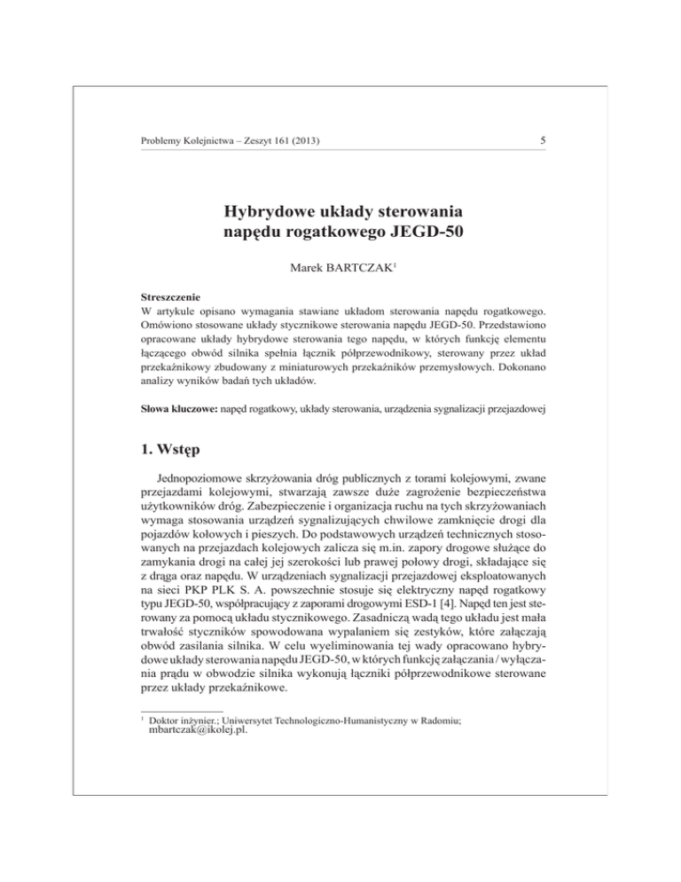 Problemy Kolejnictwa – Zeszyt 161 (2013) 5 Hybrydowe układy sterowania napędu rogatkowego JEGD-50 Marek BARTCZAK1 Streszczenie W artykule opisano wymagania stawiane układom sterowania napędu rogatkowego. Omówiono stosowane układy stycznikowe sterowania napędu JEGD-50. Przedstawiono opracowane układy hybrydowe sterowania tego napędu, w których funkcję elementu łączącego obwód silnika spełnia łącznik półprzewodnikowy, sterowany przez układ przekaźnikowy zbudowany z miniaturowych przekaźników przemysłowych. Dokonano analizy wyników badań tych układów. Słowa kluczowe: napęd rogatkowy, układy sterowania, urządzenia sygnalizacji przejazdowej 1. Wstęp Jednopoziomowe skrzyżowania dróg publicznych z torami kolejowymi, zwane przejazdami kolejowymi, stwarzają zawsze duże zagrożenie bezpieczeństwa użytkowników dróg. Zabezpieczenie i organizacja ruchu na tych skrzyżowaniach wymaga stosowania urządzeń sygnalizujących chwilowe zamknięcie drogi dla pojazdów kołowych i pieszych. Do podstawowych urządzeń technicznych stosowanych na przejazdach kolejowych zalicza się m.in. zapory drogowe służące do zamykania drogi na całej jej szerokości lub prawej połowy drogi, składające się z drąga oraz napędu. W urządzeniach sygnalizacji przejazdowej eksploatowanych na sieci PKP PLK S. A. powszechnie stosuje się elektryczny napęd rogatkowy typu JEGD-50, współpracujący z zaporami drogowymi ESD-1 [4]. Napęd ten jest sterowany za pomocą układu stycznikowego. Zasadniczą wadą tego układu jest mała trwałość styczników spowodowana wypalaniem się zestyków, które załączają obwód zasilania silnika. W celu wyeliminowania tej wady opracowano hybrydowe układy sterowania napędu JEGD-50, w których funkcję załączania / wyłączania prądu w obwodzie silnika wykonują łączniki półprzewodnikowe sterowane przez układy przekaźnikowe. 1 Doktor inżynier.; Uniwersytet Technologiczno-Humanistyczny w Radomiu; [email protected]. 6 Bartczak M. 2. Wymagania stawiane układom sterowania napędu rogatkowego Fazę projektowania nowego układu zawsze poprzedza ustalenie wymagań, jakie powinien spełniać układ. Formułuje je zazwyczaj projektant lub użytkownik. Prawidłowo zaprojektowany układ sterowania napędu rogatkowego powinien [1, 3, 6]: • umożliwiać opuszczenie / podniesienie drąga zapory drogowej, • umożliwiać zatrzymanie drąga przy opuszczaniu / podnoszeniu, • umożliwiać kontynuowanie opuszczania / podnoszenia drąga po zatrzymaniu, • umożliwiać powrotne nastawienie drąga po zatrzymaniu, • wykluczać możliwość jednoczesnego nastawienia napędu w dwóch przeciwnych położeniach, • umożliwiać automatyczne wyłączenie prądu nastawczego po osiągnięciu przez drąg położenia końcowego, • umożliwiać wprowadzenie do układu zależności urządzeń stacyjnych srk, • umożliwiać awaryjne otwarcie przejazdu, • umożliwiać rejestrację wdrożenia funkcji awaryjnego otwarcia przejazdu, • zapewniać sygnalizację na pulpicie nastawczym położenia drąga i utwierdzenia przejazdu w przebiegu, • charakteryzować się dużą niezawodnością działania i łatwością utrzymania, • być odporny na narażenia środowiskowe. Uszkodzenie układu nie może powodować samoczynnego nastawienia napędu, ani generować błędnej informacji o położeniu drąga i powinno być wykryte natychmiast lub podczas najbliższego cyklu nastawczego. 3. Stycznikowe układy sterowania napędu JEGD-50 3.1. Układ sterowania napędu prądu przemiennego Schemat połączeń stycznikowego układu sterowania napędu JEGD-50 na prąd przemienny [6] przedstawia rysunek 1. Układ ten składa się z dwóch styczników St1 i St2. W końcowych położeniach drąga zapory obwody styczników są przerwane. W stanie zasadniczym, przy górnym położeniu drąga jest zamknięty zestyk P2, natomiast zestyk P1 jest otwarty. Przy dolnym położeniu drąga jest odwrotnie. Kierunek ruchu drąga jest określony kierunkiem obrotów silnika zależnym od kierunku przepływu prądu w uzwojeniu pomocniczym. 7 Hybrydowe układy sterowania napędu rogatkowego JEGD-50 Aby zobrazować działanie obwodu sterującego, omówiono pracę układu przy opuszczaniu drąga zapory. W tym celu należy nacisnąć przycisk sterujący D, znajdujący się na pulpicie. Wtedy będzie zamknięty obwód wzbudzenia stycznika St2: • ~220V, zestyk wyłącznika bezpieczeństwa, przycisk D, zestyk bierny St1, uzwojenie stycznika St2, zestyk czynny P2, drugi zestyk wyłącznika bezpieczeństwa, ~0V. Po wzbudzeniu stycznika St2 zostaje przerwany obwód wzbudzenia stycznika St1. 0V AC St1 St2 Cp Z1 Z2 St2 St1 P1 P2 St2 Pt 220V AC St1 U2 U1 St1 G St2 St2 D St1 Rys. 1. Schemat stycznikowego układu sterowania napędu JEGD-50 AC (zestyki P1 i P2 przedstawiono w pionowym położeniu drąga) Przycisk D nie może być zwolniony, gdyż byłoby to jednoznaczne z odwzbudzeniem stycznika St2, co spowodowałoby przerwanie obwodu zasilania silnika. Wzbudzony stycznik St2 zamknie zestyki czynne i w ten sposób powstanie następujący obwód zasilania silnika napędu: • ∼220V, zestyk wyłącznika bezpieczeństwa, zabezpieczenie przeciążeniowe Pt, uzwojenie U2-U1 silnika, zestyk czynny stycznika St2, (uzwojenie Z1-Z2 silnika, kondensator CP, zestyk czynny stycznika St2), drugi zestyk wyłącznika bezpieczeństwa, ∼0V. Przy pierwszych obrotach silnika napęd przełącza zestyk P1, przygotowując układ do powrotnego nastawienia drąga. Po zakończeniu opuszczania drąga następuje przełączenie zestyku P2, który przerywa obwód stycznika St2, powodując jego odbwzbudzenie. Zestyki czynne stycznika St2 przerywają obwód zasilania silnika i prąd przestaje płynąć. W razie konieczności zatrzymania napędu w czasie jego pracy należy zwolnić przycisk D. Wskutek tego następuje przerwanie obwodu zasilania stycznika St2, stycznik St2 odwzbudza się i swoimi zestykami przerywa obwód za