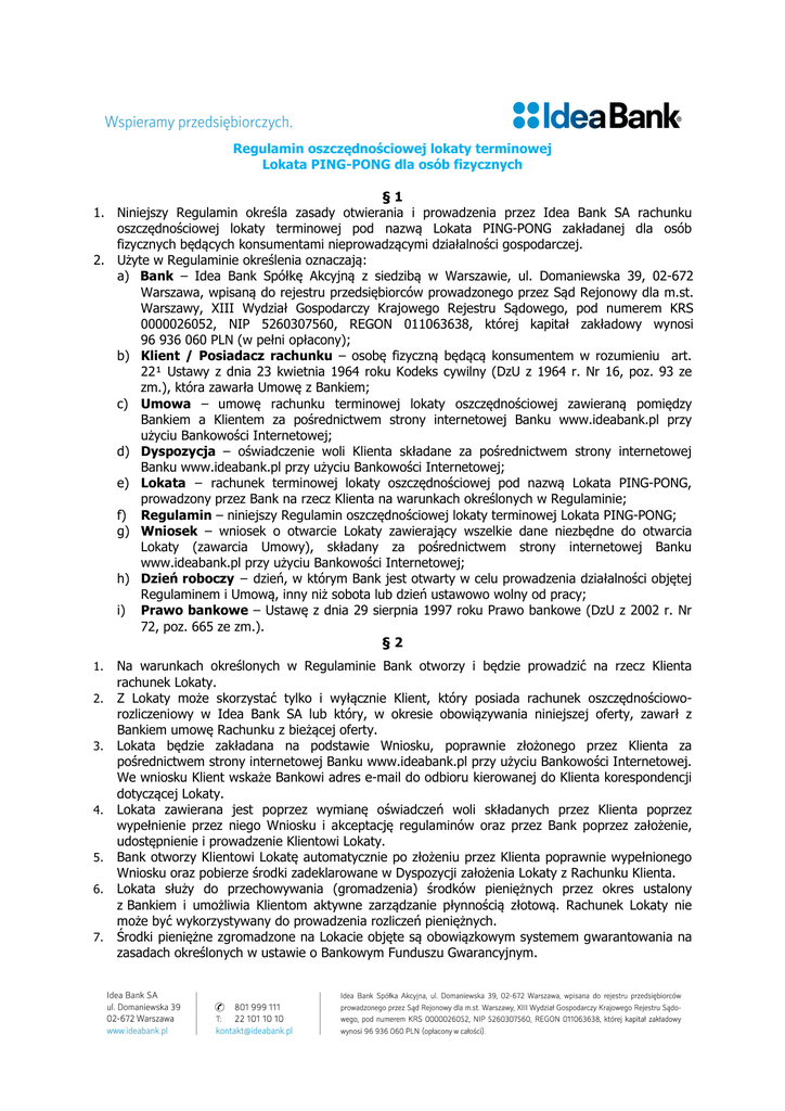 Regulamin oszczędnościowej lokaty terminowej Lokata PING-PONG dla osób fizycznych §1 1. Niniejszy Regulamin określa zasady otwierania i prowadzenia przez Idea Bank SA rachunku oszczędnościowej lokaty terminowej pod nazwą Lokata PING-PONG zakładanej dla osób fizycznych będących konsumentami nieprowadzącymi działalności gospodarczej. 2. Użyte w Regulaminie określenia oznaczają: a) Bank – Idea Bank Spółkę Akcyjną z siedzibą w Warszawie, ul. Domaniewska 39, 02-672 Warszawa, wpisaną do rejestru przedsiębiorców prowadzonego przez Sąd Rejonowy dla m.st. Warszawy, XIII Wydział Gospodarczy Krajowego Rejestru Sądowego, pod numerem KRS 0000026052, NIP 5260307560, REGON 011063638, której kapitał zakładowy wynosi 96 936 060 PLN (w pełni opłacony); b) Klient / Posiadacz rachunku – osobę fizyczną będącą konsumentem w rozumieniu art. 22¹ Ustawy z dnia 23 kwietnia 1964 roku Kodeks cywilny (DzU z 1964 r. Nr 16, poz. 93 ze zm.), która zawarła Umowę z Bankiem; c) Umowa – umowę rachunku terminowej lokaty oszczędnościowej zawieraną pomiędzy Bankiem a Klientem za pośrednictwem strony internetowej Banku www.ideabank.pl przy użyciu Bankowości Internetowej; d) Dyspozycja – oświadczenie woli Klienta składane za pośrednictwem strony internetowej Banku www.ideabank.pl przy użyciu Bankowości Internetowej; e) Lokata − rachunek terminowej lokaty oszczędnościowej pod nazwą Lokata PING-PONG, prowadzony przez Bank na rzecz Klienta na warunkach określonych w Regulaminie; f) Regulamin – niniejszy Regulamin oszczędnościowej lokaty terminowej Lokata PING-PONG; g) Wniosek – wniosek o otwarcie Lokaty zawierający wszelkie dane niezbędne do otwarcia Lokaty (zawarcia Umowy), składany za pośrednictwem strony internetowej Banku www.ideabank.pl przy użyciu Bankowości Internetowej; h) Dzień roboczy − dzień, w którym Bank jest otwarty w celu prowadzenia działalności objętej Regulaminem i Umową, inny niż sobota lub dzień ustawowo wolny od pracy; i) Prawo bankowe – Ustawę z dnia 29 sierpnia 1997 roku Prawo bankowe (DzU z 2002 r. Nr 72, poz. 665 ze zm.). §2 1. 2. 3. 4. 5. 6. 7. Na warunkach określonych w Regulaminie Bank otworzy i będzie prowadzić na rzecz Klienta rachunek Lokaty. Z Lokaty może skorzystać tylko i wyłącznie Klient, który posiada rachunek oszczędnościoworozliczeniowy w Idea Bank SA lub który, w okresie obowiązywania niniejszej oferty, zawarł z Bankiem umowę Rachunku z bieżącej oferty. Lokata będzie zakładana na podstawie Wniosku, poprawnie złożonego przez Klienta za pośrednictwem strony internetowej Banku www.ideabank.pl przy użyciu Bankowości Internetowej. We wniosku Klient wskaże Bankowi adres e-mail do odbioru kierowanej do Klienta korespondencji dotyczącej Lokaty. Lokata zawierana jest poprzez wymianę oświadczeń woli składanych przez Klienta poprzez wypełnienie przez niego Wniosku i akceptację regulaminów oraz przez Bank poprzez założenie, udostępnienie i prowadzenie Klientowi Lokaty. Bank otworzy Klientowi Lokatę automatycznie po złożeniu przez Klienta poprawnie wypełnionego Wniosku oraz pobierze środki zadeklarowane w Dyspozycji założenia Lokaty z Rachunku Klienta. Lokata służy do przechowywania (gromadzenia) środków pieniężnych przez okres ustalony z Bankiem i umożliwia Klientom aktywne zarządzanie płynnością złotową. Rachunek Lokaty nie może być wykorzystywany do prowadzenia rozliczeń pieniężnych. Środki pieniężne zgromadzone na Lokacie objęte są obowiązkowym systemem gwarantowania na zasadach określonych w ustawie o Bankowym Funduszu Gwarancyjnym. 8. 9. 1. 2. 3. 4. 5. 6. 7. 8. 9. 1. Bank zapewnia zachowanie tajemnicy o posiadaniu i stanie Lokaty na zasadach określonych w ustawie Prawo bankowe. Bank nie prowadzi Lokaty wspólnej dla dwóch lub większej liczby Klientów. §3 Lokata zakładana jest przez Bank automatycznie na podstawie poprawnie wypełnionej Dyspozycji założenia Lokaty. W wypadku złożenia przez Klienta dyspozycji założenia Lokaty w danym dniu do godziny 21.00, zostaje ona przyjęta do realizacji tego samego dnia. W wypadku gdy dyspozycja założenia Lokaty zostanie złożona w danym dniu po godzinie 21.00, zostanie ona przyjęta przez Bank do realizacji następnego dnia. Warunkiem realizacji Dyspozycji założenia Lokaty przez Bank jest zapewnienie przez Klienta na Rachunku środków w kwocie nie niższej niż kwota Lokaty podana w Dyspozycji. W innym wypadku Bank nie przyjmie Dyspozycji. Klient może posiadać jedną Lokatę. Każdorazowo po upływie okresu umownego Lokaty Klientowi przysługuje prawo ponownego założenia Lokaty. Lokata zakładana jest przez Klienta na okres 1 dnia kalendarzowego („Okres umowny”). Lokata ma charakter nieodnawialny. Minimalna kwota Lokaty wynosi 1000 PLN. Maksymalna kwota Lokaty wynosi 20 000 PLN. Środki na Lokatę przyjmowane są w złotych polskich (PLN). Środki, powiększone o należne odsetki, zwracane są automatycznie na Rachunek Klienta następnego dnia kalendarzowego po dniu realizacji przez Bank Dyspozycji założenia Lokaty, nie później niż do godziny 9.00. §4 Oprocentowanie Lokaty jest stałe i wynosi 7% w skali roku. §5 1. W Okresie umownym nie można dokonywać dopłat do Lokaty ani częściowych wypłat z Lokaty. 2. Za dzień rozpoczęcia Okresu umownego uważa się złożenie dyspozycji założenia Lokaty do godziny 21.00 oraz moment pobrania środków zadeklarowanych w Dyspozycji z Rachunku Klienta. 3. Za dzień zakończenia Lokaty (zakończenia Okresu umownego) uważa się dzień, w którym na Rachunek Klienta powrócą środki, powiększone o należne odsetki, chyba że Klient przed końcem Okresu umownego wypowie Umowę, składając Dyspozycję wypłaty całości środków zgromadzonych na Lokacie na wskazany przez Klienta rachunek bankowy („Zerwanie Lokaty”). 4. Zerwanie Lokaty przed upływem Okresu umownego skutkuje zwrotem przez Bank całości wpłaconych przez 