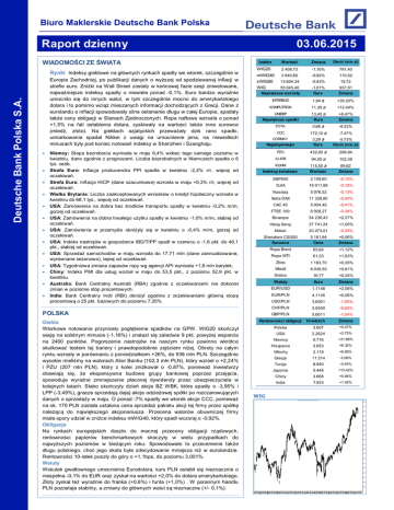 Biuro Maklerskie Deutsche Bank Polska Raport dzienny 03.06.2015 WIADOMO CI ZE WIATA Rynki Indeksy gie dowe na g ównych rynkach spad y we wtorek, szczególnie w Deutsche Bank Polska S.A. Europie Zachodniej, po publikacji danych o wy szej od spodziewanej inflacji w strefie euro. Zni ki na Wall Street zosta y w ko cowej fazie sesji zniwelowane, najwa niejsze indeksy spad y o niewiele ponad -0,1%. Euro bardzo wyra nie umocni o si do innych walut, w tym szczególnie mocno do ameryka skiego dolara i to pomimo wci mieszanych informacji dochodz cych z Grecji. Dane z eurolandu o inflacji spowodowa y silne os anienie d ugu w ca ej Europie, spada y tak e ceny obligacji w Stanach Zjednoczonych. Ropa naftowa wzros a o ponad +1,5% na fali os abienia dolara, zyskiwa y na wartosci tak e inne surowce (mied , z oto). Na gie dach azjatyckich przewa y dzi rano spadki, umiarkowanie spada Nikkei z uwagi na umocnienie jena, na niewielkich minusach by y pod koniec notowa indeksy w Shenzhen i Szanghaju. a Warto Zmiana Obrót (mln z ) 2 408,73 -1,16% 791,40 3 840,80 -0,92% 110,52 13 694,34 -0,43% 19,72 55 045,40 Najwi ksze wzrosty -1,01% Kurs 937,91 Zmiana Indeks WIG20 mWIG40 sWIG80 WIG INTERBUD 1,94 z +30.20% KOMPUTRON 11,39 z +12.44% UNIBEP 13,45 z Kurs +8.47% Zmiana FOTA 0,66 z -8.33% CCC 172,10 z -7.47% CORMAY Najaktywniejsi 3,29 z Kurs Obrót (mln z ) Najwi ksze spadki PZU 432,00 z 206,94 ALIOR 94,00 z 102,38 KGHM 115,50 z Warto 89,62 Zmiana S&P500 2 109,60 -0,10% DJIA 18 011,98 -0,16% Nasdaq 5 076,52 -0,13% Xetra DAX 11 328,80 -0,94% CAC 40 5 004,46 -0,41% FTSE 100 6 928,27 -0,36% Bovespa 54 236,43 +2,27% Hang Seng 27 741,24 +1,00% Nikkei 20 473,51 -0,30% Shenzhen CSI300 Surowce 5 161,94 Cena +0,06% Zmiana Ropa Brent 65,64 +1,12% Ropa WTI 61,33 +1,83% oto 1 193,70 +0,35% Mied 6 039,50 +0,61% Srebro 16,77 +0,24% Waluty Kurs Zmiana EUR/USD 1,1148 +2,06% EUR/PLN 4,1145 +0,06% USD/PLN 3,6901 -1,95% CHF/PLN 3,9550 -0,60% GBP/PLN 5,6611 -1,04% Rentowno ci obligacji 10-letnich Zmiana Niemcy: Stopa bezrobocia wynios a w maju 6,4% wobec tego samego poziomu w kwietniu, dane zgodnie z prognozami. Liczba bezrobotnych w Niemczech spad a o 6 tys. osób. Strefa Euro: Inflacja producencka PPI spad a w kwietniu -2,2% r/r, wi cej od oczekiwa . Strefa Euro: Inflacja HICP (dane szacunkowe) wzros a w maju +0,3% r/r, wi cej od oczekiwa . Wielka Brytania: Liczba zaakceptowanych wniosków o kredyt hipoteczny wzros a w kwietniu do 68,1 tys., wi cej od oczekiwa . USA: Zamówienia na dobra bez rodków transportu spad y w kwietniu -0,2% m/m, gorzej od oczekiwa . USA: Zamówienia na dobra trwa ego u ytku spad y w kwietniu -1,0% m/m, s abiej od oczekiwa . USA: Zamówienia w przemy le obni y si w kwietniu o -0,4% m/m, gorzej od oczekiwa . USA: Indeks nastrojów w gospodarce IBD/TIPP spad w czerwcu o -1,6 pkt. do 48,1 pkt., s abiej od oczekiwa . USA: Sprzeda samochodów w maju wzros a do 17,71 mln (dane zannualizowane, wyrównane sezonowo), lepiej od oczekiwa . USA: Tygodniowa zmiana zapasów ropy wg agencji API wynios a +1,8 mln bary ek. Chiny: Indeks PMI dla us ug wzrós w maju do 53,5 pkt., z poziomu 52,9 pkt. w kwietniu. Australia: Bank Centralny Australii (RBA) zgodnie z oczekiwaniami nie dokona zmian w poziomie stóp procentowych. Indie: Bank Centralny Indii (RBI) obni zgodnie z oczekiwaniami g ówn stop procentow o 25 pkt. bazowych do poziomu 7,25%. Indeksy wiatowe POLSKA Gie da Wtorkowe notowania przynios y pog bienie spadków na GPW. WIG20 sko czy sesj na solidnym minusie (-1,16%) i znalaz si zaledwie 9 pkt. powy ej wsparcia na 2400 punktów. Pogorszenie nastrojów na naszym rynku powinno wkrótce skutkowa testem tej bariery i prawdopodobnie zej ciem ni ej. Obroty na ca ym rynku wzros y w porównaniu z poniedzia kiem +26%, do 938 mln PLN. Szczególnie wysokie mieli my na walorach Alior Banku (102,3 mln PLN), który wzrós o +2,24% i PZU (207 mln PLN), który z kolei zni kowa o -0,87%, poniewa inwestorzy obawiaj si , e ekspansywna budowa grupy bankowej poprzez przej cia, spowoduje wyra ne zmniejszenie p aconej dywidendy przez ubezpieczyciela w kolejnych latach. S abo sko czy y dzie akcje BZ WBK, które spad y o -3,95% i LPP (-3,49%), gracze sprzedaj dajej akcje odzie owej spó ki po rozczarowuj cych danych o sprzeda y w maju. O ponad -7% spad y we wtorek akcje CCC, poniewa na ok. 170 PLN zosta a ustalona cena sprzeda pakietu akcji tej firmy przez spó nale do najwi kszego akcjonariusza. Przecena walorów obuwniczej firmy mia a spory udzia w zni ce indeksu mWIG40, który spad wczoraj o -0,92%. Obligacje Na rynkach europejskich dosz o do mocnej przeceny obligacji rz dowych, rentowno ci papierów benchmarkowych skoczy y w wielu przypadkach do najwy szych poziomów w bie cym roku. Spowodowa o to przecenienie tak e ugu polskiego, cho jego skala by a zdecydowanie mniejsza ni w eurolandzie. Rentowno ci 10-latek posz y do góry o +1,1bps, do poziomu 3,001%. Waluty Wskutek gwa townego umocnienia Eurodolara, kurs PLN os abi si nieznacznie o niespe na -0,1% do EUR oraz zyska na warto ci +2,0% do dolara ameryka skiego. oty zyska te wyra nie do franka (+0,6%) i funta (+1,0%) . W porannym handlu PLN pozostaje stabilny, a zmiany do g ównych walut s nieznaczne (+/- 0,1%). -5.73% +0.47% Polska 3.007 USA 2.2624 +3.73% Niemcy 0.716 +31.86% Hiszpania 2.053 +6.32% 2.118 +8.95% Grecja 11.314 -2.06% Turcja 8.940 -0.45% Japonia 0.448 +13.42% Chiny 3.668 +0.94% Indie 7.933 +1.42% ochy WIG WIG (57,229.22, 57,232.19, 56,833.23, 56,845.83, -400.910) 58000 57500 57000 56500 56000 55500 55000 54500 54000 53500 53000 52500 52000 51500 51000 50500 50000 49500 49000 12 19 26 2 9 June 16 23 30 7 July 14 21 28 4 11 18 August 25 1 8 15 September 22 29 6 13 October 20 27 3 10 17 Novem ber 24 1 8 15 Decem ber 22 5 12 2015 19 26 2 9 16 February 23 2 9 March 16 23 30 7 13 April 20 27 4 11 May 18 25 Deutsche Bank Polska S.A. INFORMACJE Z POLSKICH SPÓ EK KGHM– w kwietniu br. zap aci 190,6 mln z podatku od kopalin JSW– chce wypracowa w 2015 pozytywny wynik EBITDA PK