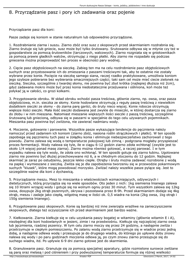 Forum dyskusyjne Nasza Szkapa - konie, jeźdźcy, jeździectwo i inne dyskusje 8. Przyrządzanie pasz i pory ich zadawania oraz pojenie Przyrządzanie pasz dla koni: Pasze zadaje się koniom w stanie naturalnym lub odpowiednio przyrządzone. 1. Rozdrabnianie ziarna i suszu. Ziarno zbóż oraz susz z okopowych przed skarmianiem rozdrabnia się. Ziarno śrutuje się lub gniecie, susz może być tylko śrutowany. Srutowanie odbywa się w młynie czy też w gospodarstwie za pomocą śrutowników (tarczowych, walcowych). Ziarno rozgniata się w gniotownikach za pomocą prawie gładkich walców, otrzymując z niego płatki. Aby ziarno nie rozpadało się podczas gniecenia można przeprowadzić ten proces w obecności pary wodnej. 2. Cięcie pasz objętościowych na sieczkę. Zabieg ten ma na celu rozdrobnienie pasz objętościowych suchych oraz przystosowanie ich do zmieszania z paszami treściwymi tak, aby te ostatnie nie zostały wybrane przez konie. Pocięcie na sieczkę samego siana, raczej rzadko praktykowane, umożliwia koniom jego szybsze pobieranie bez wybierania smaczniejszych części; taki sam cel może mieć ciecie zielonek na sieczkę. Sieczka, szczególnie z twardej słomy, nie powinna być zbyt krótka (najlepiej dłuższa niż 2cm), gdyż zadawana mokro może być przez konia niedostatecznie przeżuwana i ośliniona, koń może też połykać ją w całości, co grozi kolkami. 3. Przygotowanie obroku. W skład obroku wchodzi pasza treściwa, głównie ziarno, np. owsa, oraz pasza objętościowa, m.in. sieczka ze słomy. Konie hodowlane otrzymują z reguły paszę treściwą z niewielkim dodatkiem sieczki ze słomy - do ziarna parę garści, do śruty nieco więcej. Konie robocze otrzymują większe ilości sieczki. Mała ilość sieczki dodawana jest zwykle do miseczki, w której dostarcza się ziarno do żłobu i w nim mieszana. Natomiast mieszanie większych ilości sieczki z paszą treściwą, szczególnie śrutowaną lub gniecioną, odbywa się w paszarni w specjalnie do tego celu używanych pojemnikach. Mieszanka pasz powinna być zwilżona, nie zawierać nadmiaru wody. 4. Moczenie, gotowanie i parowanie. Wszystkie pasze wykazujące tendencje do pęcznienia należy namoczyć przed zadaniem ich koniom (ziarno zbóż, nasiona roślin strączkowych i płatki). W ten sposób zapobiega się pęcznieniu tych pasz w żołądku konia i eliminuje niebezpieczeństwo zachorowań z tego powodu. Ziarno zalewa się wodą o temperaturze pokojowej lub zimną - podgrzana mogłaby przyspieszać proces fermentacji. Wody nalewa się tyle, ile w ciągu 6-12 godzin ziarno zdoła wchłonąć (zwykle jest to około 1/4 więcej ponad masę ziarna). Ziarno można również gotować, a raczej parować. I w tym wypadku nalewa się tyle wody, ile zdoła ono wchłonąć. W ten sposób gotuje się ziarno łubinu. Ugotowane ziarno nie powinno być dłużej przechowywane niż 6, a w chłodnym otoczeniu do 12 godzin. Najlepiej skarmiać je zaraz po ostudzeniu, jeszcze lekko ciepłe. Otręby i śruty można zadawać rozrobione z wodą na papkę i wymieszane z sieczką. Zwilża się je dla zapobieżenia tworzeniu się w przewodzie pokarmowym suchych "klusek", które mogą powodować morzysko. Zwilżać należy wszelkie pasze pylące się. Jest to szczególnie ważne dla koni z dychawicą. 5. Przyrządzanie meszu. Mesz to mieszanka o właściwościach wzmacniających, odżywczych i dietetycznych, którą przyrządza się na wiele sposobów. Oto jeden z nich: 1kg siemienia lnianego zalewa się 10 litrami wrzącej wody i gotuje się na wolnym ogniu przez 30 minut. Tym wszystkim zalewa się 12kg owsa, dosypuje 2kg otrąb pszennych, okrywa i pozostawia przez 8-9h. Przed skarmianiem dodaje się 4kg otrąb, meszu i zadaje jako ciepłą, wilgotną masę w ilości ok. 0,5 wiadra na konia (2kg owsa, 1kg otrąb i 150g siemienia lnianego). 6. Przygotowanie pasz okopowych. Konie są bardziej niż inne zwierzęta wrażliwe na zanieczyszczenie okopowych, dlatego też oczyszczanie ich przed skarmianiem jest bardzo ważne. 7. Kiełkowanie. Ziarna kiełkuje się w celu uzyskania paszy bogatej w witaminy (głównie witamin E i A), niezbędnej dla koni hodowlanych w jesieni, zimie i na przedwiośniu. Kiełkuje się najczęściej ziarno owsa lub jęczmienia, rzadziej pszenicy. W tym celu ziarno moczy się przez 24 godziny, a następnie zwilża i przetrzymuje w ciepłym pomieszczeniu. Po zalaniu wodą ziarno przetrzymuje się w wiadrze przez jedną dobę, a następnie odlewa wodę i przesypuje je do drugiego wiadra, do którego po upływie doby znowu nalewa się wody i po paru godzinach moczenia odlewa ją, po czym znowu ziarno przesypuje się do suchego wiadra, itd. Po upływie 6-9 dni ziarno gotowe jest do skarmienia. 8. Granulowanie pasz. Granuluje się za pomocą specjalnej aparatury, gdzie rozmielone surowce zwilżane są parą oraz melasą i pod ciśnieniem i przy podwyższonej temperaturze formuje się różnej wielkości http://naszaszkapa.pl/naszaszkapa Kreator PDF Utworzono 2 March, 2017, 14:02 Forum dyskusyjne Nasza Szkapa - konie, jeźdźcy, jeździectwo i inne dyskusje granule. Pory zadawania pasz: Konie z powodu małej objętości żołądka powinny mieć paszę podawaną w małych ilościach, ale stosunkowo często. Szczególnie często powinny otrzymywać paszę konie o dużym zapotrzebowaniu energetycznym - klacze karmiące, źrebięta i konie wyścigowe. Dzienna dawka pasz treściwych powinna być w miarę możliwości rozdzielona na 4 do 5 odpasów. Dorosłe konie o małych potrzebach energetycznych, nie pracujące lub wykonujące lekką pracę, żywione wyłącznie paszami objętościowymi suchymi mogą je mieć zadawane dwukrotnie w ciągu doby. Najczęściej jednak stosuje się 3 odpasy w ciągu doby z 6-7-godzinnymi odstępami czasu w ciągu dnia (np. 6:00-12:00-18:00). Przy 3-krotnych odpasach w ciągu dnia zaleca się równomierne rozdzielanie paszy treściwej (lub obroku) natomiast pasze objętościowe s