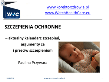 www.korektorzdrowia.pl www.WatchHealthCare.eu SZCZEPIENIA OCHRONNE – aktualny kalendarz szczepień, argumenty za i przeciw szczepieniom Paulina Przywara 2013-07-30 www.korektorzdrowia.pl 1 Cele prezentacji: • • • • • Aktualny kalendarz szczepień obowiązkowych Szczepienia zalecane Najważniejsze informacje o wybranych chorobach Ruchy antyszczepionkowe Bezpieczeństwo szczepionek 2013-07-30 www.korektorzdrowia.pl 2 Kalendarz szczepień dzieci i młodzieży na rok 2012 2013-07-30 www.korektorzdrowia.pl 3 Szczepienia obowiązkowe osób narażonych na zakażenie (I) : Szczepienia przeciw WZW typu B Osoby podlegające szczepieniu 1. 2. 3. 4. Haemophilus influanzae Streptococcus pneumoniae Dzieci do ukończenia 6 roku życia niezaszczepione w cyklu podstawowym do 7 tygodnia życia 1. 2. 3. 2013-07-30 Uczniowie i studenci uczelni medycznych lub kształcący się na kierunkach medycznych, którzy nie byli szczepieni na WZW typu B. Osoby narażone na zakażenie w wyniku styczności z osobą zarażoną WZW typu B, które nie były szczepione przeciw WZW typu B. Osoby zakażone WZW typu C. Osoby wykonujące zawód medyczny narażone na zakażenie, które nie były szczepione przeciw WZW typu B. Dzieci od 2 mies. do 5 roku życia (po urazie lub z wadą ośrodkowego układu nerwowego, zakażone HIV, po przeszczepieniu szpiku, przed lub po przeszczepieniu narządu lub wszczepieniu implantu ślimakowego) Dzieci od 2 mies. do 5 roku życia chorujące na przewlekłe choroby serca, schorzenia immunologiczno-hematologiczne, przewlekłą niewydolność nerek, pierwotne zaburzenia odporności, choroby metaboliczne w tym cukrzycę oraz przewlekłe choroby płuc w tym astmę. Dzieci od 2 do 12 miesiąca życia urodzone przed ukończeniem 37 tygodnia ciąży lub urodzone z masą urodzeniową poniżej 2500 g. www.korektorzdrowia.pl 4 Szczepienia obowiązkowe osób narażonych na zakażenie (II) : Szczepienia przeciw Osoby podlegające szczepieniu Błonica 1. 2. 3. Ze wskazań indywidualnych Osoby ze styczności z chorymi na błonicę. W zależności od sytuacji epidemiologicznej. Ospa wietrzna 1. Dzieci do ukończenia 12 roku życia z upośledzeniem odporności o wysokim ryzyku ciężkiego przebiegu choroby, z ostrą białaczką limfoblastyczną w okresie remisji, zakażone HIV, przed chemioterapią lub leczeniem immunosupresyjnym Dzieci do ukończenia 12 roku życia z otoczenia dzieci wymienionych w poprzednim punkcie. Dzieci do ukończenia 12 roku życia narażone ze względów środowiskowych na zakażenie (domy opieki długoterminowej, domy dziecka, żłobki i inne instytucje opiekuńcze). 2. 3. Wścieklizna 1. 2. Ze wskazań indywidualnych Osoby mające styczność ze zwierzęciem chorym lub podejrzanym o zakażeniem wirusem wścieklizny. Tężec 1. 2. 3. Ze wskazań indywidualnych Osoby zranione, narażone na zakażenie tężcem. W zależności od sytuacji epidemiologicznej. 2013-07-30 www.korektorzdrowia.pl 5 Szczepienia zalecane płatne(I) : Szczepienia przeciw WZW typu A Osoby podlegające szczepieniu 1. 2. 3. WZW typu B 1. 2. 3. 4. 5. Osoby wyjeżdżające do krajów o wysokiej lub pośredniej endemiczności na WZW typu A. Osoby zatrudnione przy produkcji i dystrybucji żywności, usuwaniu odpadów komunalnych i płynnych nieczystości. Dzieci w wieku przedszkolnym, szkolnym i młodzieży, które nie chorowały na WZW typu A. Osoby, które z racji trybu życia lub wykonywane zajęcia mogą być narażone na zakażenie poprzez uszkodzenie ciągłości tkanek lub kontakt fizyczny. Osoby przewlekle chore o wysokim ryzyku zakażenia nie szczepione w ramach szczepień obowiązkowych. Osoby przygotowujące się do zabiegów operacyjnych. Dzieci i młodzież nie objęte do tej pory szczepieniami obowiązkowymi. Osoby dorosłe, zwłaszcza w wieku starszym. Odra, Świnka, Różyczka 1. 2. Osoby nieszczepione w ramach szczepień obowiązkowych (2 dawki w odstępach 4 tyg.) Młode kobiety, zwłaszcza pracujące w środowisku dziecięcym (przedszkole, szkoła, szpital, przychodnia), celem zapobiegania różyczce wrodzonej szczególnie nieszczepionym w 13 roku życia lub jeśli od niego minęło więcej niż 10 lat. Ospa wietrzna 1. Osoby, które nie chorowały na ospę wietrzną i nie były zaszczepione w ramach szczepień obowiązkowych lub zalecanych. Kobiety planujące zajść w ciążę, które nie chorowały wcześniej na ospę wietrzną. 2. 2013-07-30 www.korektorzdrowia.pl 6 Szczepienia zalecane płatne(II) : Szczepienia przeciw Grypa Osoby podlegające szczepieniu 1. 2. Biegunka (rotawirusy) Streptococcus pneumoniae Ze wskazań klinicznych i indywidualnych (osoby przewlekle chore na astmę, cukrzycę, niewydolność układu krążenia, oddychania lub nerek, osoby w stanach obniżonej odporności lub osoby powyżej 55 roku życia) Ze wskazań epidemiologicznych (pracownicy ochrony zdrowia, szkół, handlu, transportu lub inne narażone na kontakt z dużą ilością ludzi oraz dzieci zdrowie od 6 mies. do 18 roku życia) Dzieci od 6 tygodnia do 24 tygodnia życia 1. 2. Osoby powyżej 65 roku życia, dzieci powyżej 2 roku życia oraz dorośli z grup ryzyka (osoby chore na przewlekłe choroby serca i płuc, cukrzycę, chorobę alkoholową, nabyte zaburzenia odporności, po splenektomii) Dzieci od 2 mies. do 5 roku życia, zwłaszcza te uczęszczające do żłobka, przedszkola Kleszczowe zapalenie mózgu Osoby zatrudnione przy eksploatacji lasu, wojskowi, funkcjonariusze straży pożarnej i granicznej, turyści i uczestnicy obozów i kolonii. Wścieklizna Osoby wyjeżdżające do rejonów ze zwiększonym występ. zachorowań na wściekliznę. Żółta gorączka 2013-07-30 Osoby wyjeżdżające za granice wg wymogów kraju docelowego (szczególnie kraje Afryki i Ameryki Południowej) www.korektorzdrowia.pl 7 Szczepienia ochronne w Polsce u dzieci w 2 roku życia na przykładzie szczepień na błonicę i tężec http://www.pzh.gov.pl/oldpage/epimeld/2010/Sz_2010.pdf 2013-07-30 www.korektorzdrowia.pl