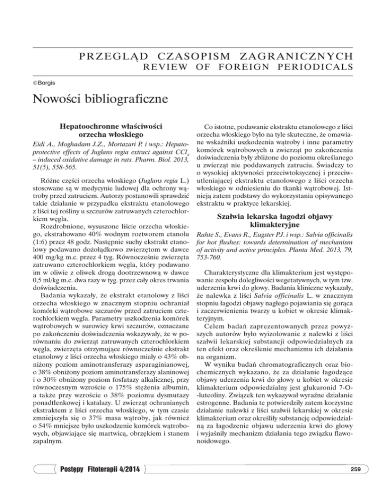 p rzegląd cz a so p i sm z a g r a n i c z n y c h r e v i e w o f fo re ig n pe rio dic als Borgis Nowości bibliograficzne Hepatoochronne właściwości orzecha włoskiego Eidi A., Moghadam J.Z., Mortazari P. i wsp.: Hepatoprotective effects of Juglans regia extract against CCl4 – induced oxidative damage in rats. Pharm. Biol. 2013, 51(5), 558-565. Różne części orzecha włoskiego (Juglans regia L.) stosowane są w medycynie ludowej dla ochrony wątroby przed zatruciem. Autorzy postanowili sprawdzić takie działanie w przypadku ekstraktu etanolowego z liści tej rośliny u szczurów zatruwanych czterochlorkiem węgla. Rozdrobnione, wysuszone liście orzecha włoskiego, ekstrahowano 40% wodnym roztworem etanolu (1:6) przez 48 godz. Następnie suchy ekstrakt etanolowy podawano dożołądkowo zwierzętom w dawce 400 mg/kg m.c. przez 4 tyg. Równocześnie zwierzęta zatruwano czterochlorkiem węgla, który podawano im w oliwie z oliwek drogą dootrzewnową w dawce 0,5 ml/kg m.c. dwa razy w tyg. przez cały okres trwania doświadczenia. Badania wykazały, że ekstrakt etanolowy z liści orzecha włoskiego w znacznym stopniu ochraniał komórki wątrobowe szczurów przed zatruciem czterochlorkiem węgla. Parametry uszkodzenia komórek wątrobowych w surowicy krwi szczurów, oznaczane po zakończeniu doświadczenia wskazywały, że w porównaniu do zwierząt zatruwanych czterochlorkiem węgla, zwierzęta otrzymujące równocześnie ekstrakt etanolowy z liści orzecha włoskiego miały o 43% obniżony poziom aminotransferazy asparaginianowej, o 38% obniżony poziom aminotransferazy alaninowej i o 30% obniżony poziom fosfatazy alkalicznej, przy równoczesnym wzroście o 175% stężenia albumin, a także przy wzroście o 38% poziomu dysmutazy ponadtlenkowej i katalazy. U zwierząt ochranianych ekstraktem z liści orzecha włoskiego, w tym czasie zmniejszyła się o 37% masa wątroby, jak również o 54% mniejsze było uszkodzenie komórek wątrobowych, objawiające się martwicą, obrzękiem i stanem zapalnym. Postępy Fitoterapii 4/2014 Co istotne, podawanie ekstraktu etanolowego z liści orzecha włoskiego było na tyle skuteczne, że omawiane wskaźniki uszkodzenia wątroby i inne parametry komórek wątrobowych u zwierząt po zakończeniu doświadczenia były zbliżone do poziomu określanego u zwierząt nie poddawanych zatruciu. Świadczy to o wysokiej aktywności przeciwtoksycznej i przeciwutleniającej ekstraktu etanolowego z liści orzecha włoskiego w odniesieniu do tkanki wątrobowej. Istnieją zatem podstawy do wykorzystania opisywanego ekstraktu w praktyce lekarskiej. Szałwia lekarska łagodzi objawy klimakteryjne Rahte S., Evans R., Eugster P.J. i wsp.: Salvia officinalis for hot flushes: towards determination of mechanism of activity and active principles. Planta Med. 2013, 79, 753-760. Charakterystyczne dla klimakterium jest występowanie zespołu dolegliwości wegetatywnych, w tym tzw. uderzenia krwi do głowy. Badania kliniczne wykazały, że nalewka z liści Salvia officinalis L. w znacznym stopniu łagodzi objawy nagłego pojawiania się gorąca i zaczerwienienia twarzy u kobiet w okresie klimakteryjnym. Celem badań zaprezentowanych przez powyższych autorów było wyizolowanie z nalewki z liści szałwii lekarskiej substancji odpowiedzialnych za ten efekt oraz określenie mechanizmu ich działania na organizm. W wyniku badań chromatograficznych oraz biochemicznych wykazano, że za działanie łagodzące objawy uderzenia krwi do głowy u kobiet w okresie klimakterium odpowiedzialny jest glukuronid 7-O-luteoliny. Związek ten wykazywał wyraźne działanie estrogenne. Badania te potwierdziły zatem korzystne działanie nalewki z liści szałwii lekarskiej w okresie klimakterium oraz określiły substancję odpowiedzialną za łagodzenie objawu uderzenia krwi do głowy i wyjaśniły mechanizm działania tego związku flawonoidowego. 259 Bogdan Kędzia Przeciwmiażdżycowe działanie herbaty Yerba Mate Gao H., Liu Z., Wan W i wsp.: Aqueous extract of Yerba Mate tea lowers atherosclerotic risk factors in a rat hyperlipidemia model. Phytother. Res. 2013, 27, 1225-1231. Uważa się, że herbata Yerba Mate, będąca wysuszonymi liśćmi południowoamerykańskiego drzewa Ilex paraguariensis St. Hil var. paraguariensis, jest źródłem naturalnych substancji kardioochronnych, obniżających poziom lipidów, a także substancji przeciwutleniających. Badania przeprowadzone przez powyższych autorów miały na celu określenie wpływu wodnego ekstraktu z tego surowca na poziom substancji lipidowych i przeciwutleniających w organizmie szczurów będących na diecie wysokotłuszczowej. Szczury grupy kontrolnej karmione były przez 4 tyg. paszą zawierającą w swym składzie: smalec wieprzowy (10%), sproszkowane jaja kurze (10%), cholesterol (1%) i sole żółciowe (0,2%). Grupa badana zwierząt, poza paszą wysokotłuszczową, otrzymywała dodatkowo suchy ekstrakt wodny z Yerba Mate rozpuszczony w stężeniu 4% w wodzie do picia, przez cały okres trwania doświadczenia. Oznaczenia wykonane po zakończeniu badań wykazały, że masa szczurów, otrzymujących ekstrakt wodny z Yerba Mate, była o 8% niższa w porównaniu do zwierząt nie otrzymujących tego ekstraktu. Poza tym w ich surowicy krwi stwierdzono o 25% mniej cholesterolu całkowitego, o 19% mniej triglicerydów oraz o 21% mniej cholesterolu o niskiej gęstości (LDL) i o 25% więcej cholesterolu o wysokiej gęstości (HDL) w porównaniu do zwierząt będących tylko na diecie wysokotłuszczowej. W surowicy krwi szczurów otrzymujących ekstrakt wodny z Yerba Mate stwierdzono ponadto o 21% wyższy poziom dysmutazy ponadtlenkowej i o 49% wyższy poziom peroksydazy glutationowej oraz o 36% niższy poziom dialdehydu malonowego w porównaniu do zwierząt nie otrzymujących tego ekstraktu. Świadczy to o wyraźnym działaniu przeciwutleniającym ekstraktu wodnego z Yerba Mate na organizm szczurów zagrożonych hiperlipidem