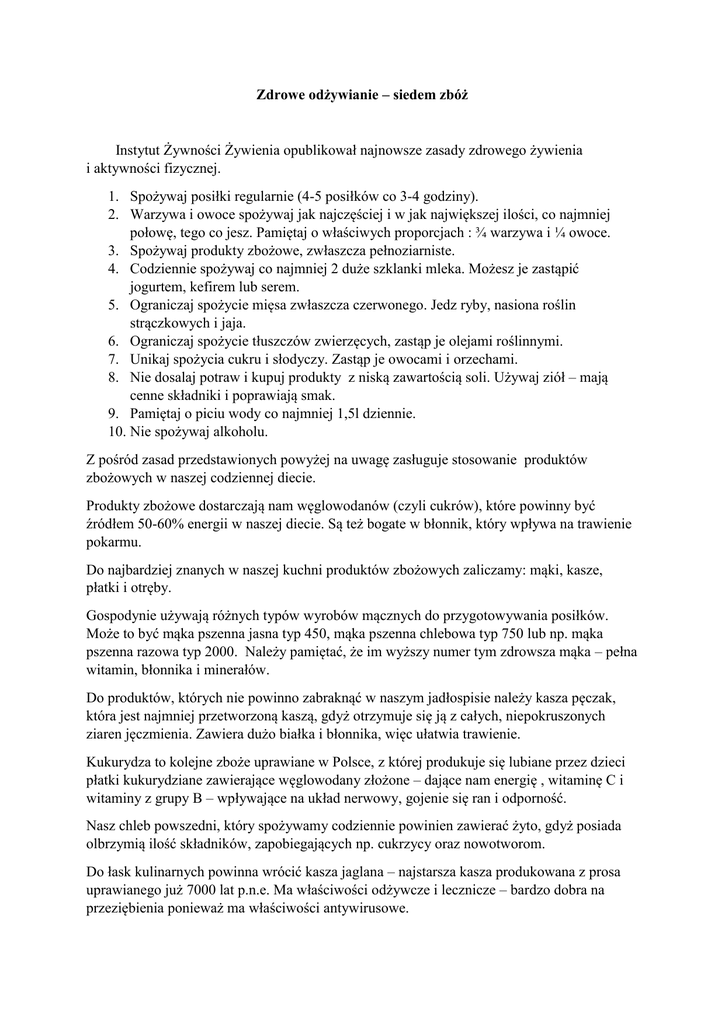 Zdrowe odżywianie – siedem zbóż Instytut Żywności Żywienia opublikował najnowsze zasady zdrowego żywienia i aktywności fizycznej. 1. Spożywaj posiłki regularnie (4-5 posiłków co 3-4 godziny). 2. Warzywa i owoce spożywaj jak najczęściej i w jak największej ilości, co najmniej połowę, tego co jesz. Pamiętaj o właściwych proporcjach : ¾ warzywa i ¼ owoce. 3. Spożywaj produkty zbożowe, zwłaszcza pełnoziarniste. 4. Codziennie spożywaj co najmniej 2 duże szklanki mleka. Możesz je zastąpić jogurtem, kefirem lub serem. 5. Ograniczaj spożycie mięsa zwłaszcza czerwonego. Jedz ryby, nasiona roślin strączkowych i jaja. 6. Ograniczaj spożycie tłuszczów zwierzęcych, zastąp je olejami roślinnymi. 7. Unikaj spożycia cukru i słodyczy. Zastąp je owocami i orzechami. 8. Nie dosalaj potraw i kupuj produkty z niską zawartością soli. Używaj ziół – mają cenne składniki i poprawiają smak. 9. Pamiętaj o piciu wody co najmniej 1,5l dziennie. 10. Nie spożywaj alkoholu. Z pośród zasad przedstawionych powyżej na uwagę zasługuje stosowanie produktów zbożowych w naszej codziennej diecie. Produkty zbożowe dostarczają nam węglowodanów (czyli cukrów), które powinny być źródłem 50-60% energii w naszej diecie. Są też bogate w błonnik, który wpływa na trawienie pokarmu. Do najbardziej znanych w naszej kuchni produktów zbożowych zaliczamy: mąki, kasze, płatki i otręby. Gospodynie używają różnych typów wyrobów mącznych do przygotowywania posiłków. Może to być mąka pszenna jasna typ 450, mąka pszenna chlebowa typ 750 lub np. mąka pszenna razowa typ 2000. Należy pamiętać, że im wyższy numer tym zdrowsza mąka – pełna witamin, błonnika i minerałów. Do produktów, których nie powinno zabraknąć w naszym jadłospisie należy kasza pęczak, która jest najmniej przetworzoną kaszą, gdyż otrzymuje się ją z całych, niepokruszonych ziaren jęczmienia. Zawiera dużo białka i błonnika, więc ułatwia trawienie. Kukurydza to kolejne zboże uprawiane w Polsce, z której produkuje się lubiane przez dzieci płatki kukurydziane zawierające węglowodany złożone – dające nam energię , witaminę C i witaminy z grupy B – wpływające na układ nerwowy, gojenie się ran i odporność. Nasz chleb powszedni, który spożywamy codziennie powinien zawierać żyto, gdyż posiada olbrzymią ilość składników, zapobiegających np. cukrzycy oraz nowotworom. Do łask kulinarnych powinna wrócić kasza jaglana – najstarsza kasza produkowana z prosa uprawianego już 7000 lat p.n.e. Ma właściwości odżywcze i lecznicze – bardzo dobra na przeziębienia ponieważ ma właściwości antywirusowe. Bardzo częstym elementem naszej diety powinny być płatki owsiane, których składniki wpływają korzystnie na nasze serce, nerwy, krew. Zapobiegają astmie, pomagają zasypiać, a nawet stymulują kondycję fizyczną – to dlatego konie sportowe i pociągowe jedzą owies. Prawie połowa ludzi na Ziemi żywi się ryżem, który jest zdrowym i lekkostrawnym zbożem. Dostarcza dużej ilości energii, poprawia odporność i wpływa na proces uczenia i koncentrację uwagi. Jedz zboża – będziesz wielki - takie motto winno nam towarzyszyć przy dobieraniu odpowiednich składników naszej diety. Mirosław Szewczyk