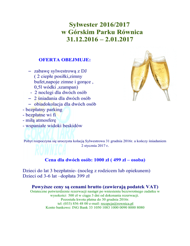Sylwester 2016/2017 w Górskim Parku Równica 31.12.2016 – 2.01.2017 OFERTA OBEJMUJE: – zabawę sylwestrową z DJ ( 2 ciepłe posiłki,zimny bufet,napoje zimne i gorące , 0,5l wódki ,szampan) - 2 noclegi dla dwóch osób – 2 śniadania dla dwóch osób – obiadokolacja dla dwóch osób - bezpłatny parking - bezpłatne wi fi - miłą atmosferę - wspaniałe widoki beskidów Pobyt rozpoczyna się uroczysta kolacją Sylwestrowa 31 grudnia 2016r. a kończy śniadaniem 2 stycznia 2017 r. Cena dla dwóch osób: 1000 zł ( 499 zł – osoba) Dzieci do lat 3 bezpłatnie- (nocleg z rodzicem lub opiekunem) Dzieci od 3-6 lat –dopłata 399 zł Powyższe ceny są cenami brutto (zawierają podatek VAT) Ostateczne potwierdzenie rezerwacji nastąpi po wniesieniu bezzwrotnego zadatku w wysokości 500 zł w ciągu 3 dni od dokonania rezerwacji. Pozostała kwota płatna do 30 grudnia 2016r. tel: (033) 856 48 00 e-mail: [email protected] Konto bankowe: ING Bank 33 1050 1083 1000 0090 8000 8080