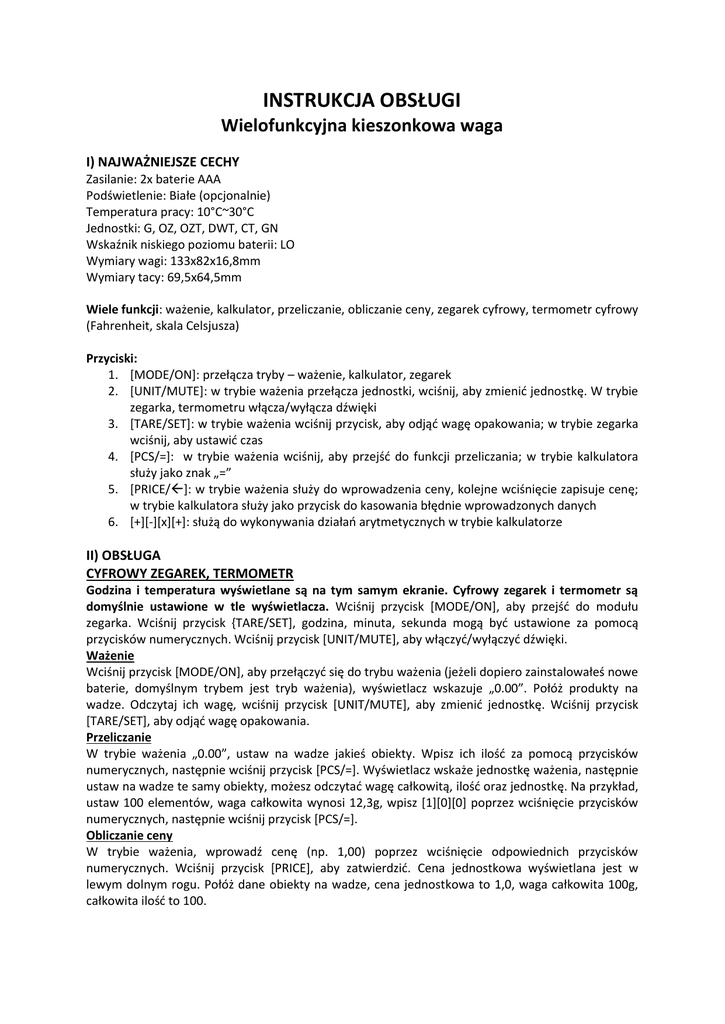 INSTRUKCJA OBSŁUGI Wielofunkcyjna kieszonkowa waga