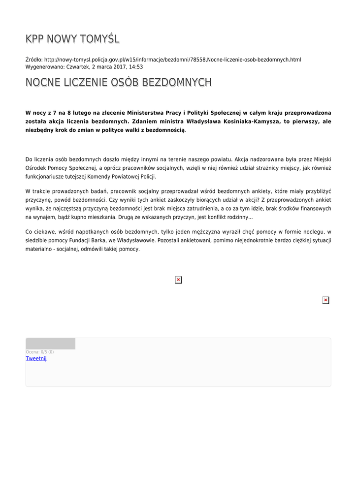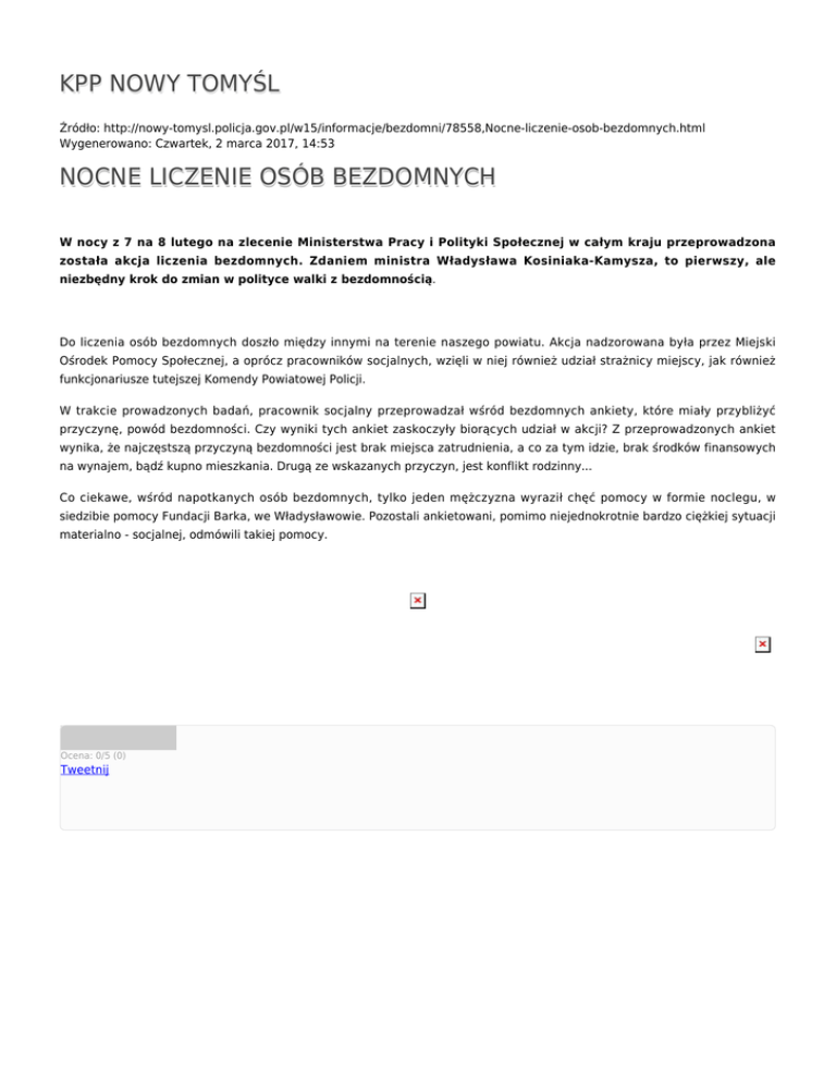 KPP NOWY TOMYŚL Źródło: http://nowy-tomysl.policja.gov.pl/w15/informacje/bezdomni/78558,Nocne-liczenie-osob-bezdomnych.html Wygenerowano: Czwartek, 2 marca 2017, 14:53 NOCNE LICZENIE OSÓB BEZDOMNYCH W nocy z 7 na 8 lutego na zlecenie Ministerstwa Pracy i Polityki Społecznej w całym kraju przeprowadzona została akcja liczenia bezdomnych. Zdaniem ministra Władysława Kosiniaka-Kamysza, to pierwszy, ale niezbędny krok do zmian w polityce walki z bezdomnością. Do liczenia osób bezdomnych doszło między innymi na terenie naszego powiatu. Akcja nadzorowana była przez Miejski Ośrodek Pomocy Społecznej, a oprócz pracowników socjalnych, wzięli w niej również udział strażnicy miejscy, jak również funkcjonariusze tutejszej Komendy Powiatowej Policji. W trakcie prowadzonych badań, pracownik socjalny przeprowadzał wśród bezdomnych ankiety, które miały przybliżyć przyczynę, powód bezdomności. Czy wyniki tych ankiet zaskoczyły biorących udział w akcji? Z przeprowadzonych ankiet wynika, że najczęstszą przyczyną bezdomności jest brak miejsca zatrudnienia, a co za tym idzie, brak środków finansowych na wynajem, bądź kupno mieszkania. Drugą ze wskazanych przyczyn, jest konflikt rodzinny... Co ciekawe, wśród napotkanych osób bezdomnych, tylko jeden mężczyzna wyraził chęć pomocy w formie noclegu, w siedzibie pomocy Fundacji Barka, we Władysławowie. Pozostali ankietowani, pomimo niejednokrotnie bardzo ciężkiej sytuacji materialno - socjalnej, odmówili takiej pomocy. Ocena: 0/5 (0) Tweetnij