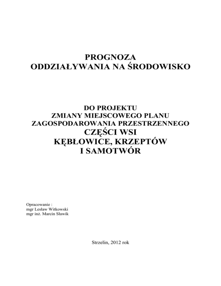 PROGNOZA ODDZIAŁYWANIA NA ŚRODOWISKO DO PROJEKTU ZMIANY MIEJSCOWEGO PLANU ZAGOSPODAROWANIA PRZESTRZENNEGO CZĘŚCI WSI KĘBŁOWICE, KRZEPTÓW I SAMOTWÓR Opracowanie : mgr Lesław Witkowski mgr inż. Marcin Sławik Strzelin, 2012 rok SPIS TREŚCI : 1. PRZEDMIOT I CEL OPRACOWANIA. 2. DOKUMENTY WYKORZYSTANE W PROGNOZIE. 3. POWIĄZANIA Z INNYMI DOKUMENTAMI 4. OCENA STANU I FUNKCJONOWANIA ŚRODOWISKA. 4.1 Położenie, morfologia 4.2 Hydrografia 4.3 Budowa geologiczna 4.4 warunki wodne 4.5 Warunki glebowe 4.6 Szata roślinna 4.7 Warunki klimatyczne. 4.8 Degradacja środowiska 4.9 Stan ochrony prawnej zasobów przyrodniczych. 4.10 Stan ochrony prawnej zasobów kultury 4.11 Stan ochrony prawnej wynikający z innych przepisów szczególnych 4.12 Dotychczasowy sposób użytkowania i zagospodarowania terenu 5. USTALENIA PROJEKTU PLANU. 6. SKUTKI DLA ŚRODOWISKA W WYNIKU REALIZACJI PLANU. 6.1 Wpływ na stan atmosfery 6.2 Wpływ na rzeźbę terenu 6.3 Wpływ na gleby 6.4 Wpływ na kopaliny 6.5 Wpływ na klimat lokalny 6.6 Wpływ na warunki gruntowo-wodne 6.7 Wpływ na zwierzęta i rośliny 6.8 Wpływ na ekosystem 6.9 Wpływ na krajobraz 7. CELE OCHRONY ŚRODOWISKA USTALONE NA SZCZEBLU MIEDZYNARODOWYM, WSPÓLNOTOWYM LUB KRAJOWYM. 8. IDENTYFIKACJA ZAGROŻEŃ DLA ŚRODOWISKA PRZYRODNICZEGO W WYNIKU REALIZACJI USTALEŃ PLANU 9. OCENA USTALEŃ PLANU W KONTEKŚCIE UWARUNKOWAŃ PRZYRODNICZYCH I ZAGOSPODAROWANIA PRZESTRZENNEGO 10. ROZWIĄZANIA MAJĄCE NA CELU ZAPOBIEGANIE, OGRANICZANIE LUB KOMPENSACJE PRZYRODNICZĄ NEGATYWNYCH ODDZIAŁYWAN NA 11. TRANSGRANICZNE ODDZIAŁYWANIE NA ŚRODOWISKO. 12. PROPOZYCJE ROZWIĄZAŃ ALTERNATYWNYCH DO ROZWIAZAŃ USTALONYCH W PROJEKCIE PLANU MIEJSCOWEGO. 13. METODY ANALIZY SKUTKÓW REALIZACJI ZMIANY MPZP 14. STRESZCZENIE. 1 1. PRZEDMIOT I CEL OPRACOWANIA. Niniejsza prognoza została wykonana w związku z wymogami art. 51 ust. 1 ustawy z dnia 3 października 2008 r. o udostępnianiu informacji o środowisku i jego ochronie, udziale społeczeństwa w ochronie środowiska oraz o ocenach oddziaływania na środowisko (Dz. U. Nr 199 z 2008 r., poz. 1227) miejscowych planów zagospodarowania przestrzennego (Dz. U. Nr 197 z 2002 r., poz. 1667). Prognoza ma na celu przedstawienie wyników analiz i ocen do proponowanych ustaleń miejscowego planu zagospodarowania przestrzennego w aspekcie ochrony środowiska oraz skutków jakie mogą one spowodować w okresie realizacji ustaleń planu. Projektem planu objęty jest obszar położony w obrębie geodezyjnym wsi Kębłowice, Krzeptów i Samotwór. Ustalenia rysunkowe projektu planu przedstawione zostały na załączniku graficznym nr 1 w skali 1 : 2000. Zgodnie z art. 46 pkt 1 i 53 ustawy z dnia 3 października 2008 r. o udostępnianiu informacji o środowisku i jego ochronie, udziale społeczeństwa w ochronie środowiska oraz o ocenach oddziaływania na środowisko (Dz. U. z 2008 r. Nr 199, poz. 1227) zakres i stopień szczegółowości informacji wymaganych w prognozie oddziaływania na środowisko do projektu zmiany miejscowego planu zagospodarowania przestrzennego części wsi Kębłowice, Krzeptów i Samotwór został uzgodniony z Państwowym Powiatowym Inspektorem Sanitarnym we Wrocławiu – postanowieniem nr ZNS-625-23/DS./09 z dnia 11.02.2009 r. 2. DOKUMENTY WYKORZYSTANE W PROGNOZIE. Podstawami prawnymi niniejszej prognozy są obowiązujące ustawy i rozporządzenia, przede wszystkim: 1) Ustawa z dnia 27 marca 2003 r. o planowaniu i zagospodarowaniu przestrzennym (tekst jednolity Dz. U. z 12 czerwca 2012 r., poz. 647). 2) Ustawa z dnia 3 października 2008 r. o udostępnianiu informacji o środowisku i jego ochronie, udziale społeczeństwa w ochronie środowiska oraz o ocenach oddziaływania na środowisko (Dz. U. Nr 199 z 2008 r., poz. 1227). 3) Ustawa z dnia 27 kwietnia 2001 r. Prawo ochrony środowiska (Dz. U. Nr 62 z 2001 r. poz. 627, ze zmianami). 4) Ustawa z dnia 27 lipca 2001 r. o wprowadzeniu ustawy - Prawo ochrony środowiska, ustawy o odpadach oraz zmianie niektórych ustaw (Dz. U. Nr 100 z 2001 r., poz. 1085). 5) Ustawa z dnia 27 kwietnia 2001 r. o odpadach (tekst jednolity Dz. U. Nr 185 z 2010 r., poz. 1243, z późniejszymi zmianami). 6) Ustawa z dnia 18 lipca 2001 r. Prawo wodne (tekst jednolity Dz. U. z 2012 r., poz. 145). 7) Ustawa z dnia 3 lutego 1995 r. o ochronie gruntów rolnych i leśnych (tekst jednolity Dz. U. Nr 121 z 2004 r., poz. 1266 r., z późniejszymi zmianami). 8) Ustawa z dnia 16 kwietnia 2004 r. o ochronie przyrody (tekst jednolity Dz. U. Nr 151 z 2009 r., poz. 1220, z późniejszymi zmianami). 9) Ustawa z dnia 23 lipca 2003 o ochronie zabytków i opiece nad zabytkami (Dz. U. Nr 162 z 2003 r., poz. 1568, z późniejszymi zmianami). 10) Ustawa z dn. 21 marca 1985 r. o drogach publicznych (tekst jednolity Dz. U. Nr 19 z 2007 r., poz. 115, z późniejszymi zmianami). 11) Rozporządzenia Rady Ministrów z dnia 9 listopada 2010 r. w sprawie przedsięwzięć mogących znacząco oddziaływać na środowisko (Dz. U. Nr 213 z 2010 r., poz. 1397). 12) Rozporządzenie Ministra Środowiska z dnia 14 czerwca 2007 r. w sprawie dopuszczalnych poziomów hałasu w środowisku (Dz. U. Nr 120 z 2007 r., poz. 826, z późniejszymi zmianami). Prognozę oddziaływania na środowisko do projektu zmianę miejscowego planu zagospodarowania przestrzennego części wsi Kębłowice, Krzeptów i Samotwór opracowano na podstawie : 2 1. Analizy ustaleń projektu zmiany miejscowego planu zagospodarowania przestrzennego części wsi Kębłowice, Krzeptów i Samotwór oraz przyjętych w nim założeń ochrony środowiska przyrodniczego, 2. Analizy ustaleń obowiązującej zmiany w miejscowych planach zagospodarowania przestrzennego wsi Kębłowice, Krzeptów, Skałka uchwalonego przez Radę Miejską w Kątach Wrocławskich uchwałą nr VIII/89/03 z dnia 29 kwietnia 2003 r. 3. Opracowania ekofizjograficznego dla Gminy Kąty Wrocławskie, opracowanie Wielobranżowe Przedsiębiorstwo Usługowo-Produkcyjne „Urgens” sp. z o.