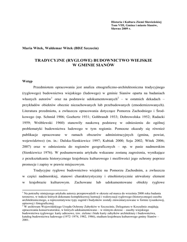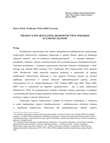 Historia i Kultura Ziemi Sławieńskiej Tom VIII, Gmina i miasto Sianów, Sławno 2009 r. Maria Witek, Waldemar Witek (BDZ Szczecin) TRADYCYJNE (RYGLOWE) BUDOWNICTWO WIEJSKIE W GMINIE SIANÓW Wstęp Przedmiotem opracowania jest analiza etnograficzno-architektoniczna tradycyjnego (ryglowego) budownictwa wiejskiego (ludowego) w gminie Sianów oparta na badaniach własnych autorów1 oraz na podstawie udokumentowanych2 – w ostatnich dekadach – przykładów obiektów obecnie niezachowanych lub przebudowanych (zmodernizowanych). Literatura przedmiotu, a zwłaszcza opracowania dotyczące Pomorza Zachodniego i Środkowego (np. Schmid 1906; Goehertz 1931; Gohbrandt 1933; Dobrowolska 1952; Radacki 1959; Wróblewski 1960) stanowiły naukową podstawę w odniesieniu do ogólnej problematyki budownictwa ludowego w tym regionie. Pomocne okazały się również publikacje opracowane w ramach obszarów administracyjnych (gmina, powiat, województwo) (m. in.: Dalska-Sienkiewicz 1997; Kubiak 2000; Soja 2002; Witek 2006; 2007) oraz w odniesieniu do regionów geograficznych – np. w pasie nadmorskim (Sienkiewicz 1976). W podsumowaniu artykułu wskazane zostaną zagrożenia, wynikające z przekształcania historycznego krajobrazu kulturowego i możliwości jego ochrony poprzez promocje i zapisy w prawie miejscowym. Tradycyjne ryglowe budownictwo wiejskie na Pomorzu Zachodnim, a zwłaszcza w części nadmorskiej, stanowi charakterystyczny i etnohistorycznie utrwalony element w 1 krajobrazie kulturowym. Zachowane lub udokumentowane obiekty ryglowe Na potrzeby niniejszego artykułu autorzy przeprowadzili w okresie od marca do września 2008 roku badania terenowe, w trakcie których dokonano kompleksowej lustracji i waloryzacji ryglowego (historycznego) zasobu architektonicznego, a reprezentatywne typy zagród i budynków zostały zinwentaryzowane w formie rysunkowej, opisowej i fotograficznej. 2 W archiwum Wojewódzkiego Urzędu Ochrony Zabytków w Szczecinie, Delegatura w Koszalinie znajdują opracowania konserwatorskie, w których udokumentowano – w różnym okresie – zasoby wiejskiego budownictwa ryglowego: karty adresowe, tzw. zielone i białe karty zabytków architektury i budownictwa, katalog budownictwa ludowego (1972–1974, 1982, 1986), studium krajobrazu kulturowego gminy Sianów – 2001. 2 odzwierciedlają lokalną tradycję, a także są swoistym „zapisem” dziejów kolejnych pokoleń. Znaczne nasycenie tego typu konstrukcją budowlaną stanowi jeden z głównych wyznaczników obszaru architektonicznego (Pokropek 1976: 21). I. Tłoczek (1958) wydzielił w Polsce 24 regiony architektoniczne (w tym zachodniopomorski), gdzie w ramach sześciu podstawowych regionów geograficznych (w układzie równoleżnikowym) przyporządkował (w układzie południkowym) regiony historyczno-etnograficzne. Współcześnie północny obszar Pomorza Środkowego nazywany jest, tak w opracowaniach planistycznych, jak i materiałach promujących walory turystycznych jako „Kraina w Kratę” (np. Szalewska 2002)3. Architektura ludowa w ramach zachodniopomorskiego regionu architektonicznego charakteryzuje się bogactwem form i typów zabudowy będących wynikiem różnorodności krajobrazu, typu gospodarki, kultury oraz burzliwych dziejów historyczno-politycznych. Określone warunki naturalne, gospodarcze, a przede wszystkim normy budowlane4 działały modyfikująco na charakter budownictwa oraz wykształcenie się form lokalnych będących sumą wzajemnych zapożyczeń określonych wzorów budowlanych (Sienkiewicz 1976: 49). Genezę budownictwa ryglowego na całym Pomorzu wiązać można z uwarunkowaniami ekonomicznymi (głównie ze wzrostem wartości drewna) oraz zarządzeniami administracyjnymi, które określały – zwłaszcza od połowy XVIII wieku – zasady budowania, sposoby pozyskiwania budulca, rygory przeciwpożarowe. Jednocześnie konstrukcja ryglowa, w stosunku do budownictwa drewnianego, miała wiele zalet: pozwalała na umieszczanie |w ścianach większej liczby otworów (bez osłabienia ustroju budowlanego), bieżące naprawy zniszczonych części ścian (bez konieczności burzenia całej budowli) oraz zapewniała odpowiednie warunki termiczne i suche wnętrze (Knypa 1987: 144). Natura konstrukcji ścian ryglowych nie stawiała ograniczeń co do długości obiektu, z kolei szerokość warunkowała konstrukcja i kąt nachylenia dachu, zaś wysokość budynku ograniczona była wytrzymałością drewna i zastosowanych połączeń ciesielskich (Kubiak 2000: 393). 1. Konstrukcja ryglowa – systematyka nazw 3 Termin ten został użyty w 1994 roku, podczas wystawy poświęconej budownictwu wiejskiemu, zorganizowanej przez Słupski Oddział Towarzystwa Opieki nad Zabytkami. 4 Np. w 1718 roku ustalono zasady budowlane oraz lokalizacje budynków mogących stwarzać zagrożenia pożarowe; w 1752 roku wprowadzono zakaz wznoszenia domów saskich oraz stosowania palenisk otwartych; w 1770 roku powołano urzędy budowlane. 3 W literaturze przedmiotu konstrukcja ryglowa jest przemiennie nazywana: szkieletową (w ujęciu inżynieryjno-budowlanym), słupowo-ramową, słupowo-ryglową, ramową, ryglową, szachulcową, „murem pruskim”. Podstawę konstrukcyjną ścian stanowił drewniany szkielet złożony z rytmicznie rozmieszczonych słupów osadzonych dołem w podwalinie, górą spiętych oczepem, połączonych jednym lub dwoma poziomami rygli (na jednej kondygnacji), z przynarożnymi (ukośnymi) zastrzałami. Pierwotnie elementy drewniane wykonane były z dębiny, następnie ograniczano – z uwagi na cenę – ten budulec tylko do podwalin i słupów, zaś najmłodsze budynki lub obiekty w mniej zamożnych zagrodach budowane były z drewna iglastego. Ściany ustawiano na fundamencie, pierwotnie z luźno ułożonych kamieni polnych pod narożnikami budynku (sporadycznie pod całą podwaliną), następnie w formie podmurówki z kamienia łamanego lub kamienia i warstwy cegieł. Obecnie są one częstokro