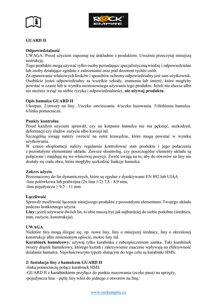 GUARD II Odpowiedzialność UWAGA: Przed użyciem zapoznaj się dokładnie z produktem. Uważnie przeczytaj niniejszą instrukcję. Tego produktu mogą używać tylko osoby posiadające specjalistyczną wiedzę i odpowiedzialne lub osoby działające zgodnie z zaleceniami oraz pod dozorem tychże osób. Za opanowanie właściwych kroków i sposobów ochrony odpowiedzialny jest sam użytkownik. Osobiście jesteś odpowiedzialny za wszelkie szkody, zranienia lub śmierć, które mogłyby powstać w czasie lub w wyniku niestosownego używania tego produktu. Jeżeli nie chcesz albo nie możesz wziąć na siebie ryzyka i odpowiedzialności, nie używaj produktu. Opis hamulca GUARD II 1/korpus. 2/otwory na liny. 3/oczko zawieszania. 4/oczko luzowania. 5/żłobienia hamulca. 6/linka pomocnicza. Punkty kontrolne Przed każdym użyciem sprawdź, czy na korpusie hamulca nie ma pęknięć, uszkodzeń, deformacji czy śladów zużycia albo korozji itd. Szczególną uwagę należy zwrócić na ostre krawędzie, które mogą powstać w wyniku użytkowania. W czasie eksploatacji należy regularnie kontrolować stan produktu i jego połączenia z pozostałymi elementami układu. Zawsze skontroluj, czy poszczególne elementy układu są połączone i znajdują się we właściwej pozycji. Zwróć uwagę na to, aby do otworów na liny nie dostały się ciała obce, które mogłyby uszkodzić funkcje hamulca. Zakres użycia Przeznaczony do lin dynamicznych, które są zgodne z dyrektywami EN 892 lub UIAA -lina połówkowa lub podwójna (2x lina 1/2) 7,8 - 8,9 mm, -lina pojedyncza ≥ 9,5 - 11 mm Łączliwość Sprawdź możliwość łączenia niniejszego produktu z pozostałymi elementami Twojego układu podczas konkretnego użycia. Liny: jeżeli używacie dwóch lin, to obie muszą być jak najbardziej do siebie podobne (średnica, stan, zużycie, konstrukcja). UWAGA Niektóre liny mogą ślizgać się, np. nowe liny, liny o mniejszej średnicy, liny o określonej konstrukcji albo zmienionym oplocie, mokre liny itd. Karabinek hamulcowy: używaj tylko karabinka z zabezpieczeniem zamka. Taki karabinek tworzy drążek hamulcowy, którego kształt i zakrzywienie znacznie wpływają na efektywność działania hamulca. Najwłaściwszym typem służącym do tego celu są karabinki HMS. 2/ Instalacja liny z hamulcem GUARD II -linką pomocniczą połącz karabinek HMS -GUARD II z karabinkiem przyłącz do punktu mocowania (oczko pasa) na uprzęży, -pojedyncza lina – pętlę liny włóż do jednego z otworów na linę, www.rockempire.cz -połówkowe i podwójne liny – jedną pętlę liny włóż do jednego i drugą do drugiego otworu na linę. -petlę (pętle) załóż na karabinek i następnie zabezpiecz zamkiem zabezpieczającym. Ostrzeżenia przed użyciem i podczas użycia Zabezpieczający i używany do spuszczania się na linie hamulec GUARD II sam nie sprawi, że lina przestanie się ślizgać. W celu uchwycenia podczas odpadnięcia, osoba zabezpieczająca musi linę w sposób czynny wyhamować. Zawsze trzymaj wolny koniec liny bezpiecznie ściśnięty w ręce. -zalecamy używać rękawic, -przed użyciem hamulca zabezpieczającego GUARD II warto zapoznać się z jego właściwościami, abyś miał wyobrażenie o jego sile hamowania. UWAGA! -linka pomocnicza ma zerową wytrzymałość przy pociągnięciu, -nigdy nie używaj linki pomocniczej do samozabezpieczania na stanowisku. 3/ Zabezpieczanie pierwszego wspinacza Poluzowanie liny: rękę, w której trzymasz wolny koniec liny, przybliż do hamulca zabezpieczającego w taki sposób, aby powstała pętla. Drugą ręką chwyć linę po stronie pierwszego wspinacza i przeciągnij wolną pętlę przez hamulec zabezpieczający. Pobieranie liny: ręką, w której trzymasz linę po stronie pierwszego wspinacza, pobieraj płynnym ruchem wolną linę. Na wolnym końcu drugą ręką przeciągnij linę przez hamulec zabezpieczający. Uchwycenie przy odpadnięciu: za koniec liny mocno pociągnij w dół. 4/ Zabezpieczanie jednego z pozostałych wspinaczy za pomocą samoblokującej funkcji hamulca. Samoblokująca funkcja pomaga zabezpieczającemu chwytać przy odpadnięciu. Połącz karabinek za pomocą oczka zawieszania na hamulcu GUARD II i punktu kotwiącego. Włóż pętlę liny (pętle lin) do otworu (-ów) przeznaczonego na liny. Lina dla drugiego wspinacza znajduje się nad wolnym końcem liny. Za pomocą jednej lub kilku pętli i linki pomocniczej połącz karabinek HMS i następnie zabezpiecz zamkiem zabezpieczającym. Dwiema rękami płynnym ruchem przeciągnij linę przez hamulec. W przypadku odpadnięcia drugiego wspinacza system samoblokujący zatrzyma odpadnięcie. Oba źródła liny (po stronie w kierunku wspinacza i w kierunku wolnego końca) muszą bezustannie przechodzić przez żłobienia hamulca i muszą być ciągnięte w dół. UWAGA! -karabinka tworzącego drążek nie może nic ograniczać w jego swobodnym ruchu. 5/Jednoczesne zabezpieczanie dwóch pozostałych wspinaczy: Zawsze używaj dwóch podobnych lin (średnica, stan, konstrukcja) o średnicy minimalnie 7,8 mm. Załóż linę według instrukcji na obrazku. UWAGA! -karabinek HMS (drążek hamujący) musi być we właściwej pozycji, nic nie może go ograniczać w swobodnym ruchu. www.rockempire.cz -zanim zaczniesz luzować linę jednemu z pozostałych wspinaczy, drugiego zawsze zabezpiecz węzłem. UWAGA ! -jeśli jeden z dwóch pozostałych wspinaczy wisi na swoim końcu liny, samoblokująca funkcja hamulca GUARD II nie musi za każdym razem działać niezawodnie na drugim końcu. Blokowanie liny polega na ściśnięciu ręką wolnego końca liny. Wolne końce obu lin trzymaj zawsze mocno w ręce. Pobieraj regularnie oba końce, aby konsekwencje ewentualnego odpadnięcia były jak najmniejsze. 6/Uruchomienie hamulca zabezpieczającego Wolny koniec liny zawsze trzymaj w ręce. Włóż do oczka luzującego karabinka, które w ten sposób służy jako uchwyt. Podczas gdy mocno trzymasz w
