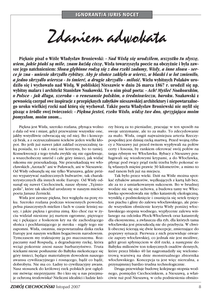 Pi´knie pisa∏ o WiÊle W∏adys∏aw Broniewski: - Nad Wis∏à si´ urodzi∏em, wszystko tu s∏ysz´, wiem, jakie ptaki sà mi∏e, znam ka˝dà cisz´, Wis∏a towarzyszy∏a poecie na obczyênie i by∏a zawsze jego natchnieniem: S∏owa g∏´binne rodzà si´ z dna rzeki zadumy, Wis∏y, a inne s∏owa - serce je zna - uniesie skrzyd∏o rybitwy. Aby je s∏oƒce zakl´∏o w wiersz, w blaski i w lot zmieni∏o, a jedno skrzyd∏o wiersza - to Êmierç, a drugie skrzyd∏o - mi∏oÊç. Wielu wybitnych Polaków urodzi∏o si´ i wychowa∏o nad Wis∏à. W pobliskiej Nieszawie w dniu 26 marca 1867 r. urodzi∏ si´ np. wybitny malarz i architekt Stanis∏aw Noakowski. To o nim pisa∏ poeta: - Ach! MyÊleç Noakowskim, o Polsce - jak d∏uga, szeroka - o renesansie polskim, o Êredniowieczu, baroku. Noakowski z pewnoÊcià czerpa∏ swe inspiracje z przepi´knych zabytków nieszawskiej architektury i niepowtarzalnego uroku wielkiej rzeki nad którà si´ wychowa∏. Tak˝e poeta W∏adys∏aw Broniewski nie myli∏ si´ piszàc o êródle swej twórczoÊci: - Pi´kna jesteÊ, rzeko Wis∏o, widz´ twe dno, sprzyjajàca moim pomys∏om, moim snom... Pi´kna jest Wis∏a, szeroko rozlana, p∏ynàca wolno z dala od wsi i miast, gdy˝ przewa˝nie wszystkie one, jakby wstydliwie odwracajà si´ od niej. Bo i koncepcji brak, a z oczyszczalniami Êcieków jeden wielki k∏opot. Bo jeÊli ju˝ nawet jakiÊ zak∏ad oczyszczalni´ takà posiada, to i tak z niej nie korzysta, bo to taniej. Konsekwencji z tego tytu∏u zwykle si´ nie egzekwuje, a wszechobecny smród i ca∏e góry Êmieci, jak widaç nikomu nie przeszkadzajà. Nie przeszkadzajà we w∏oc∏awskich „Azotach” ani w Pu∏awach, ani w Nieszawie. Od Wis∏y odsun´∏a si´ nie tylko Warszawa, gdzie pró˝no wypatrywaç nadrzecznych bulwarów, tak charakterystycznych dla innych stolic Europy. Od Wis∏y odsunà∏ si´ nawet Ciechocinek, nasze s∏ynne „T´˝niopolis”, które tak ukocha∏ urodzony w naszym mieÊcie poeta Janusz ˚ernicki. Wis∏a jest zawsze pi´kna, bez wzgl´du na por´ roku. Szeroko rozlana podczas wiosennych powodzi, pe∏na piaszczystych mielizn i ∏ach w czasie letniej suszy, i jak˝e pi´kna i groêna zimà. Kto choç raz w ˝yciu widzia∏ niesione jej nurtem ogromne, pi´trzàce si´ i p´kajàce z ∏oskotem kry na tle zachodzàcego s∏oƒca i poch∏aniajàcego je mroku - nigdy tego nie zapomni. Wis∏a, ostatnia, niepowtarzalna dzika rzeka Europy jest naszym wielkim bogactwem narodowym. Tymczasem my traktujemy jà po macoszemu. Rozpaczamy nad Rospudà, a degradujemy rzek´, która wcià˝ pokornie znosi nasze barbarzyƒstwo. Truta Êciekami niesie pos∏usznie do Ba∏tyku niekoƒczàce si´ góry Êmieci, b´dàce materialnym dowodem naszego awansu cywilizacyjnego i rosnàcego, bàdê co bàdê, dobrobytu. Nie ma co. ¸adny to cywilizacyjny awans. Nasz stosunek do królowej rzek polskich jest ogl´dnie mówiàc nieprzyjazny. Bo i kto si´ u nas przejmuje ochronà Êrodowiska? Nieliczni idealiÊci i ludzie któ- ZDRÓJ CIECHOCI¡SKI listopad 2007 rzy biorà za to pieniadze, pracujàc w ten sposób na swoje utrzymanie, ale to za ma∏o. To zdecydowanie za ma∏o. Wis∏a, ongiÊ najwa˝niejsza arteria Rzeczypospolitej jest dzisiaj rzekà martwà. Przed wojnà rybacy z Nieszawy ju˝ przed Êwitem wyp∏ywali na po∏ów certy i ∏ososia, by rankiem oferowaç swój po∏ów na targu rybnym we W∏oc∏awku. Rybacy z Nieszawy pos∏ugiwali si´ wios∏owymi krypami, a do W∏oc∏awka, p∏ynàc pod rwàcy pràd rzeki trzeba by∏o pokonaç si∏à w∏asnych mi´Êni prawie 30 kilometrów, a mimo to nad ranem byli ju˝ na miejscu. Tak by∏o przez wieki. DziÊ na WiÊle mo˝na spotkaç rybaków amatorów, w´dkujàcych z kartà lub bez, ale za to z umiarkowanym sukcesem. Bo w brudnej wodzie nic si´ nie uchowa, a budowa tamy we W∏oc∏awku spowodowa∏a nie tylko katastrof´ ekologicznà, wynik∏à z podmokni´cie i osuni´cia si´ setek tysi´cy ton piachu i gliny do zalewu w∏oc∏awskiego, ale przede wszystkim obni˝enie koryta Wis∏y poni˝ej w∏oc∏awskiego stopnia wodnego, wyp∏ycenie zalewu wiÊlanego na odcinku P∏ock-W∏oc∏awek oraz katastrof´ dla ekosystemu, a zw∏aszcza dla ryb, dla których tama w∏oc∏awska jest przeszkodà nie do przebycia. W chwili obecnej Êcierajà si´ dwie koncepcje, zmierzajàce do poprawy sytuacji. Pierwsza z nich przewiduje otwarcie zapory w∏oc∏awskiej, co jednak nie jest mo˝liwe, gdy˝ grozi sp∏yni´ciem w dó∏ rzeki, a nast´pnie do Ba∏tyku milionów ton toksycznych osadów dennych, które przez blisko 40 lat nagromadzi∏y si´ wielometrowà warstwà na dnie monstrualnego zbiornika w∏oc∏awskiego. Koncepcja ta jest wi´c nierealna, a przynajmniej bardzo trudna technologicznie. Druga przewiduje budow´ kolejnego stopnia wodnego, pomi´dzy Ciechocinkiem, a Nieszawà, a w∏aÊciwie tu˝ pod Nieszawà, w celu podniesienia obni˝o- 8 nego od W∏oc∏awka w dó∏ koryta Wis∏y. Koncepcja ta nie zyska∏a poparcia ekologów, a doÊwiadczenia ZSRR wskazujà, ˝e budowanie kolejnych zbiorników na podobnej zasadzie, to droga wprost do piek∏a, a konkretnie do niewyobra˝alnej katastrofy ekologicznej. Wystarczy tu przytoczyç przyk∏ad Jeziora Aralskiego, zwanego niegdyÊ morzem, które nagle wysch∏o. Nie inaczej sta∏o si´ z Wo∏gà, która wskutek wybudowania na niej kaskady tam - utraci∏a tyle wody, ˝e Morze Kaspijskie zacz´∏o wysychaç, a kropla wody z Wo∏gi od êróde∏ do jej ujÊcia - zamiast p∏ynàç jak przedtem - 3 miesiàce - p∏ynie obecnie 3 lata. Ma∏o tego: Budowa tam i ogromnych zbiorników wodnych o pozbawionym izolacji dnie - spowodowa∏a masowà ucieczk´ wody, podtapianie nawet od∏eg∏ych od rzeki gruntów oraz ogromne ich zasolenie. Jest to wynikiem przemieszczania si´ si´ podziemnymi ciekami, poza naturalnym korytem rzeki spi´trzonej sztucznie wody na odleg∏oÊç dziesià