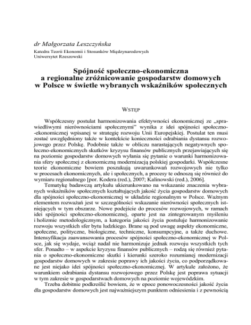 134 MAŁGORZATA LESZCZYŃSKA dr Małgorzata Leszczyńska Katedra Teorii Ekonomii i Stosunków Międzynarodowych Uniwersytet Rzeszowski Spójność społeczno-ekonomiczna a regionalne zróżnicowanie gospodarstw domowych w Polsce w świetle wybranych wskaźników społecznych WSTĘP Współczesny postulat harmonizowania efektywności ekonomicznej ze „sprawiedliwymi nierównościami społecznymi” wynika z idei spójności społeczno-ekonomicznej wpisanej w strategię rozwoju Unii Europejskiej. Postulat ten musi zostać uwzględniony także w kontekście konieczności odrabiania dystansu rozwojowego przez Polskę. Podobnie także w obliczu narastających negatywnych społeczno-ekonomicznych skutków kryzysu finansów publicznych przejawiających się na poziomie gospodarstw domowych wyłania się pytanie o warunki harmonizowania sfery społecznej z ekonomiczną modernizacją polskiej gospodarki. Współczesne teorie ekonomiczne bowiem poszukują uwarunkowań rozwojowych nie tylko w procesach ekonomicznych, ale i społecznych, a procesy te odnoszą się również do wymiaru regionalnego [por. Kodera (red.), 2007; Kalinowski (red.), 2006]. Tematykę badawczą artykułu ukierunkowano na wskazanie znaczenia wybranych wskaźników społecznych kształtujących jakość życia gospodarstw domowych dla spójności społeczno-ekonomicznej w układzie regionalnym w Polsce. Ważnym elementem rozważań jest w szczególności wskazanie nierówności społecznych istniejących w tym obszarze. Nowe podejście do procesów rozwojowych, w ramach idei spójności społeczno-ekonomicznej, oparte jest na zintegrowanym myśleniu i holizmie metodologicznym, a kategoria jakości życia postuluje harmonizowanie rozwoju wszystkich sfer bytu ludzkiego. Brane są pod uwagę aspekty ekonomiczne, społeczne, polityczne, biologiczne, techniczne, konsumpcyjne, a także duchowe. Intensyfikacja zaawansowania procesów spójności społeczno-ekonomicznej w Polsce, jak się wydaje, wciąż nadal nie harmonizuje jednak rozwoju wszystkich tych sfer. Ponadto – w aspekcie kryzysu finansów publicznych – rodzą się również pytania o społeczno-ekonomiczne skutki i kierunki szeroko rozumianej modernizacji gospodarstw domowych w zakresie poprawy ich jakości życia, co podporządkowane jest niejako idei spójności społeczno-ekonomicznej. W artykule założono, że warunkiem odrabiania dystansu rozwojowego przez Polskę jest poprawa sytuacji w tym zakresie w gospodarstwach domowych na poziomie wojewódzkim. Trzeba dobitnie podkreślić bowiem, że w epoce ponowoczesności jakość życia dla gospodarstw domowych jest najważniejszym punktem odniesienia i z pewnością Spójność społeczno-ekonomiczna a regionalne zróżnicowanie gospodarstw... 135 bez jej poprawy nie można liczyć na urzeczywistnienie idei spójności społeczno-ekonomicznej, w kierunku której zmierza polityka realizowana przez Unię Europejską. Pojęcie spójności można odnosić do wielu elementów funkcjonowania społeczeństwa. W artykule skupiono się jednak na dwóch jego wymiarach, mających charakter sprzężenia zwrotnego: gospodarczym i ekonomiczno-społecznym. Ich ocena wskaże, czy następują procesy konwergencji, które sprowadzają się w efekcie do procesu powstawania podobnych struktur w wymiarze terytorialnym (wojewódzkim). W artykule przyjęto hipotezę, że miernik braku spójności gospodarczej, przejawiający się w silnym zróżnicowaniu wytwarzania PKB w ujęciu województw, przekłada się na sytuację w zakresie najważniejszych wymiarów branych pod uwagę przy ocenie spójności społeczno-ekonomicznej: dochodów, konsumpcji i ubóstwa, czemu odpowiadają niskie oceny warunków, poziomu i jakości życia. Należy podkreślić, że spójność społeczno-ekonomiczna stanowi złożoną kategorię i można ją scharakteryzować za pomocą wielu mierników [por. np.: Zysnarska, 2003; Kot, Malawski, Węgrzecki, 2004; Słaby, 2007a; Słaby, 2007b]. W artykule do oceny typu: „przyczynek” wykorzystano jednak tylko kilka mierników, które można wykorzystać do porównań między województwami. Powszechnie znaną, choć pośrednią i ogólną miarą spójności gospodarczej (o charakterze makroekonomicznym) jest PKB per capita. Okazuje się jednak, że miernik ten w szerokim ujęciu wpływa też na wymiar społeczny. Z kolei do oceny stopnia spójności w wymiarze społeczno-ekonomicznym w skali mikroekonomicznej wykorzystano mierniki z zakresu pomiaru: terytorialnego ubóstwa, dochodów, wydatków oraz warunków, poziomu i jakości życia gospodarstw domowych (jako spinające wiele wymiarów, określających zaawansowanie procesów spójności społeczno-ekonomicznej) i ich zróżnicowań między województwami. Za podstawowe wyznaczniki w tym zakresie przyjęto: wskaźnik zagrożenia ubóstwem, udział wydatków w dochodach, syntetyczny wskaźnik warunków życia i ogólny wskaźnik jakości życia. W świetle tych kategorii dokonano oceny sytuacji gospodarstw domowych w latach 2009–2011. Z uwagi na powyższe przesłanki, poznawczy cel artykułu stanowi analiza regionalnego zróżnicowania i zaawansowania procesów spójności społeczno-ekonomicznej w wyżej wymienionym zakresie. Niniejszą analizę oraz wnioski dotyczące oceny wybranych wskaźników i ich wpływu na kształtowanie się procesów spójności na poziomie gospodarstw domowych oparto na danych uzyskanych z Diagnozy społecznej, sporządzanej przez Radę Monitoringu Społecznego oraz badań GUS w ramach budżetów gospodarstw domowych, rachunków narodowych i EU-SILC. WOJEWÓDZKIE ZRÓŻNICOWANIE GOSPODARSTW DOMOWYCH W ŚWIETLE WYBRANYCH WSKAŹNIKÓW SPOŁECZNYCH Jak wcześniej wskazano, miernikiem zróżnicowania ładu gospodarczego o syntetycznym charakterze, wpływającym w szerokim ujęciu na ład społeczny i w efekcie na spójność społeczną, w wymiarze przestrzennym jest poziom PKB na mieszkańca. Tabela 1 zawiera rozkład tego miernika w uj