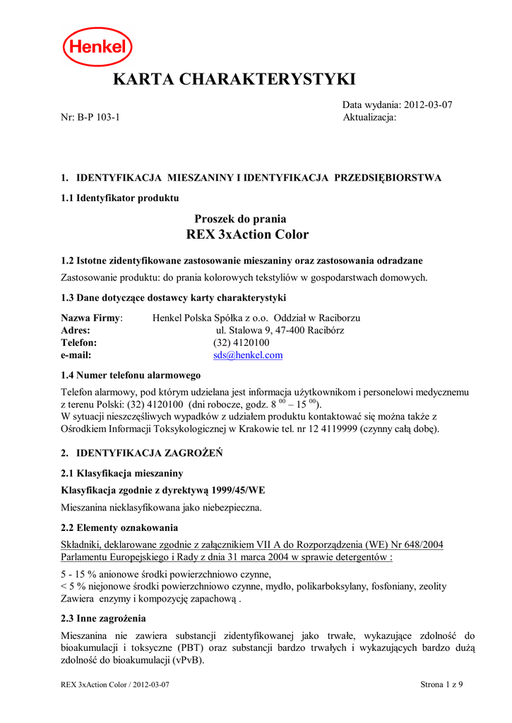 KARTA CHARAKTERYSTYKI Data wydania: 2012-03-07 Aktualizacja: Nr: B-P 103-1 1. IDENTYFIKACJA MIESZANINY I IDENTYFIKACJA PRZEDSI BIORSTWA 1.1 Identyfikator produktu Proszek do prania REX 3xAction Color 1.2 Istotne zidentyfikowane zastosowanie mieszaniny oraz zastosowania odradzane Zastosowanie produktu: do prania kolorowych tekstyliów w gospodarstwach domowych. 1.3 Dane dotycz ce dostawcy karty charakterystyki Nazwa Firmy: Adres: Telefon: e-mail: Henkel Polska Spó ka z o.o. Oddzia w Raciborzu ul. Stalowa 9, 47-400 Racibórz (32) 4120100 [email protected] 1.4 Numer telefonu alarmowego Telefon alarmowy, pod którym udzielana jest informacja u ytkownikom i personelowi medycznemu z terenu Polski: (32) 4120100 (dni robocze, godz. 8 00 – 15 00). W sytuacji nieszcz liwych wypadków z udzia em produktu kontaktowa si mo na tak e z rodkiem Informacji Toksykologicznej w Krakowie tel. nr 12 4119999 (czynny ca dob ). 2. IDENTYFIKACJA ZAGRO 2.1 Klasyfikacja mieszaniny Klasyfikacja zgodnie z dyrektyw 1999/45/WE Mieszanina nieklasyfikowana jako niebezpieczna. 2.2 Elementy oznakowania Sk adniki, deklarowane zgodnie z za cznikiem VII A do Rozporz dzenia (WE) Nr 648/2004 Parlamentu Europejskiego i Rady z dnia 31 marca 2004 w sprawie detergentów : 5 - 15 % anionowe rodki powierzchniowo czynne, < 5 % niejonowe rodki powierzchniowo czynne, myd o, polikarboksylany, fosfoniany, zeolity Zawiera enzymy i kompozycj zapachow . 2.3 Inne zagro enia Mieszanina nie zawiera substancji zidentyfikowanej jako trwa e, wykazuj ce zdolno do bioakumulacji i toksyczne (PBT) oraz substancji bardzo trwa ych i wykazuj cych bardzo du zdolno do bioakumulacji (vPvB). REX 3xAction Color / 2012-03-07 Strona 1 z 9 3. SK AD /INFORMACJA O SK ADNIKACH MIESZANINY Niebezpieczne substancje (klasyfikacja wg dyrektywy 67/548/EWG implementowanej do prawa polskiego w Rozporz dzeniu Ministra Zdrowia z dnia 2.09.2003 r. w sprawie kryteriów i sposobu klasyfikacji substancji i preparatów chemicznych): Zawarto % >=5,0 -<6,5 >=1,0 -<2,5 >=20,0 -<23,0 >=1,0 -<7,0 >=1,0 -<3,0 >=0,1-<1,0 Substancja Symbol Zwroty R CAS WE Nr rej. REACH Sole sodowe pochodnych C10-C13 alkilowych kwasu benzenosulfonowego Oksyetylowane (>5-10 EO) alkohole C 12-13 W glan sodu Kwas krzemowy, sól sodowa, MR> 1,6 <= 2,6 Kwas cytrynowy monohydrat (1-hydroksyetylidieno) bisfosfonian tetrasodowy Xn, Xi 22, 38, 41 68411-30-3 270-115-0 01-2119489428-22 Xn, Xi 22, 41 Xi Xi 36 38,41 160901-19- 931-954-4 9 497-19-8 207-838-8 1344-09-8 215-687-4 Xi 36 5949-29-1 201-069-1 Nie dotyczy – polimer. 01-2119485498-19 01-211944872531-0017 01-2119457026-42 Xn 22 3794-83-0 223-267-7 Klasyfikacja w/w substancji zgodnie z rozporz dzeniem (WE) nr 1272/2008 (CLP): Sole sodowe pochodnych C10-C13 alkilowych kwasu benzenosulfonowego*/: Acute Tox 4, [Toksyczno ostra, Kategoria4] H302; Skin Irrit 2 [Dzia anie dra ni ce na skór , Kategoria2] , H315; Eye Dam1 [Powa ne uszkodzenie oczu, Kategoria 1], H318 Oksyetylowane (>5-10 EO) alkohole C12-13: Acute Tox.4, [Toksyczno ostra, Kategoria4], H302; Eye Dam.1[Powa ne uszkodzenie oczu, Kategoria 1], H318 glan disodu: Eye Irrit.2 [Dzia anie dra ni ce na oczy, Kategoria 2], H319*/ Sól sodowa kwasu krzemowego, MP>1,6 <=2,6: Skin Irrit.2 [Dzia anie dra ni ce na skór , Kategoria2], H315; Eye Dam. 1 [Powa ne uszkodzenie oczu, Kategoria 1], H318; Kwas cytrynowy: Eye Irrit.2 [Dzia anie dra ni ce na oczy, Kategoria 2], H319; (1-hydroksyetylidieno)bisfosfonian tetrasodowy */: Acute Tox 4 [Toksyczno ostra, Kategoria4], H302 Brzmienie zwrotów: R i H – patrz sekcja 16 */ klasyfikacja podana na podstawie tabeli 1.1 za cznika VII do rozporz dzenia (WE) nr 1272/2008. 4. RODKI PIERWSZEJ POMOCY 4.1 Opis rodków pierwszej pomocy Ogólna informacja: przy wyst pieniu dolegliwo ci skonsultowa si z lekarzem. Po zanieczyszczeniu oczu: wyp uka oczy pod bie okulisty. wod . Je li to konieczne, zasi gn Po kontakcie ze skór : zanieczyszczone powierzchnie skóry sp uka pod bie zanieczyszczon odzie . porady wod . Zdj Po wdychaniu: wyprowadzi na wie e powietrze Po po kni ciu: wyp uka usta i gard o, wypi 1 – 2 szklanki wody. Zasi gn porady lekarza. 4.2 Najwa niejsze ostre i opó nione objawy oraz skutki nara enia Brak danych. 4.3 Wskazania dotycz ce wszelkiej natychmiastowej pomocy lekarskiej i szczególnego post powania z poszkodowanym. Brak danych. REX 3xAction Color / 2012-03-07 Strona 2 z 9 5. POST POWANIE W PRZYPADKU PO ARU 5.1 rodki ga nicze: wszystkie powszechnie stosowane Przy gaszeniu po aru nale y wzi pod uwag dodatkowo zalecenia dotycz ce rodków ga niczych odpowiednich do materia ów sk adowanych w pobli u. 5.2 Szczególne zagro enia zwi zane z mieszanin : brak danych 5.3 Informacje dla stra y po arnej: brak specyficznych zalece 6. POST POWANIE W PRZYPADKU NIEZAMIERZONEGO UWOLNIENIA DO RODOWISKA 6.1 Indywidualne rodki ostro no ci, wyposa enie ochronne i procedury w sytuacjach awaryjnych Unika po li ni cia na rozsypanym i mokrym produkcie. Unika kontaktu z oczami i ze skór . 6.2. rodki ostro no ci w zakresie ochrony rodowiska Uniemo liwi przedostanie si do wód powierzchniowych /wód gruntowych. 6.3 Metody i materia y zapobiegaj ce rozprzestrzenianiu si ska enia i s ska enia ce do usuwania Zebra mechanicznie jak najwi ksz ilo ilo ci wody. mieszaniny, a pozosta sp uka du 6.4 Odniesienia do innych sekcji Patrz: sekcja 8 7. POST POWANIE Z MIESZANINAMI ORAZ ICH MAGAZYNOWANIE 7.1 rodki ostro no ci dotycz ce bezpiecznego post powania Przy prawid owym obchodzeniu si z mieszanin 7.2 Warunki bezpiecznego magazynowania, wzajemnych niezgodno ci adne szczególne rodki nie s wymagane. cznie z informacjami dotycz cymi wszelkich Magazynowa zgodnie z klas zagro enia wód i klas magazynowania (je eli istniej odpowiednie regulacje w tym zakresie). Magazynowa w suchym miejscu w temp. poni ej 40°C. 7.3 Szczególne zastosowani(-a) ko cowe Do prania kolorowych tekstyliów we wszystkich typach pralek oraz r cznie. 8. KONTROLA NARA ENIA/ RODKI OCHRONY INDYWIDUALNEJ 8.1 Parametry dotycz ce kon