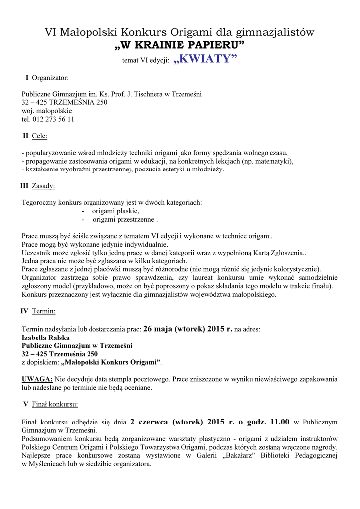 VI Małopolski Konkurs Origami dla gimnazjalistów „W KRAINIE PAPIERU” temat VI edycji: „KWIATY” I Organizator: Publiczne Gimnazjum im. Ks. Prof. J. Tischnera w Trzemeśni 32 – 425 TRZEMEŚNIA 250 woj. małopolskie tel. 012 273 56 11 II Cele: - popularyzowanie wśród młodzieży techniki origami jako formy spędzania wolnego czasu, - propagowanie zastosowania origami w edukacji, na konkretnych lekcjach (np. matematyki), - kształcenie wyobraźni przestrzennej, poczucia estetyki u młodzieży. III Zasady: Tegoroczny konkurs organizowany jest w dwóch kategoriach: - origami płaskie, - origami przestrzenne . Prace muszą być ściśle związane z tematem VI edycji i wykonane w technice origami. Prace mogą być wykonane jedynie indywidualnie. Uczestnik może zgłosić tylko jedną pracę w danej kategorii wraz z wypełnioną Kartą Zgłoszenia.. Jedna praca nie może być zgłaszana w kilku kategoriach. Prace zgłaszane z jednej placówki muszą być różnorodne (nie mogą różnić się jedynie kolorystycznie). Organizator zastrzega sobie prawo sprawdzenia, czy laureat konkursu umie wykonać samodzielnie zgłoszony model (przykładowo, może on być poproszony o pokaz składania tego modelu w trakcie finału). Konkurs przeznaczony jest wyłącznie dla gimnazjalistów województwa małopolskiego. IV Termin: Termin nadsyłania lub dostarczania prac: 26 maja (wtorek) 2015 r. na adres: Izabella Ralska Publiczne Gimnazjum w Trzemeśni 32 – 425 Trzemeśnia 250 z dopiskiem: „Małopolski Konkurs Origami”. UWAGA: Nie decyduje data stempla pocztowego. Prace zniszczone w wyniku niewłaściwego zapakowania lub nadesłane po terminie nie będą oceniane. V Finał konkursu: Finał konkursu odbędzie się dnia 2 czerwca (wtorek) 2015 r. o godz. 11.00 w Publicznym Gimnazjum w Trzemeśni. Podsumowaniem konkursu będą zorganizowane warsztaty plastyczno - origami z udziałem instruktorów Polskiego Centrum Origami i Polskiego Towarzystwa Origami, podczas których zostaną wręczone nagrody. Najlepsze prace konkursowe zostaną wystawione w Galerii „Bakałarz” Biblioteki Pedagogicznej w Myślenicach lub w siedzibie organizatora. VI Nagrody: Laureaci konkursu otrzymają nagrody rzeczowe i dyplomy. Lista nagrodzonych uczestników zamieszczona będzie na stronie internetowej http://www.oritrzeme.art.pl/konkurs/ VII Uwagi: Nadesłane prace przechodzą na własność organizatora. Administrowanie danych osobowych uczestników konkursu przez organizatora odbywać się będzie wyłącznie w celach związanych z konkursem. Organizatorzy zastrzegają sobie prawo do publikowania danych osobowych uczestników biorących udział w konkursie (zawartych w Karcie Zgłoszenia). VIII Inne: Informacje o konkursie, uaktualnienia będą zamieszczane systematycznie na stronie internetowej konkursu: http://www.oritrzeme.art.pl/konkurs/ Wszelkie pytania należy kierować na adres e-mail: [email protected] Organizatorzy
