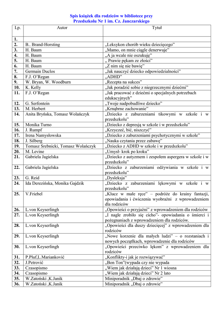 Spis książek dla rodziców w bibliotece przy Przedszkolu Nr 1 im. Cz. Janczarskiego Autor Tytuł Lp. 1. 2. 3. 4. 5. 6. 7. 8. 9. 10. 11. B.. Brand-Horsting H. Baum H. Baum H. Baum H. Baum Germain Duclos F.J. O’Regan W. Bryan, W. Woodburn K. Kelly F.J. O’Regan 12. 13. 14. G. Serfontein M. Herbert Anita Bryńska, Tomasz Wolańczyk 15. 16. 17. 18. 19. 20. 21. Monika Turno J. Rumpf Irena Namysłowska J. Silberg Tomasz Srebnicki, Tomasz Wolańczyk M. Levine Gabriela Jagielska 22. Gabriela Jagielska 23. 24. G. Reid Ida Derezińska, Monika Gajdzik 25. V.Friebel 26. 27. L.von Keyserlingh L.von Keyserlingh 28. L.von Keyserlingh 29. L.von Keyserlingh 30. L.von Keyserlingh 31. 32. 33. 34. 35. 36. P.Pluf,L.Marianković J.Petrović Czasopismo Czasopismo W.Zatoński ,K.Janik W.Zatoński ,K.Janik „Leksykon chorób wieku dziecięcego” „Mamo, on mnie ciągle denerwuje” „A ja wcale nie oszukuję” „ Prawie pękam ze złości” „Z nim się nie bawię” „Jak nauczyć dziecko odpowiedzialności” „ADHD” „Recepta na sukces” „Jak poradzić sobie z niegrzecznymi dziećmi” „Jak pracować z dziećmi o specjalnych potrzebach edukacyjnych” „Twoje nadpobudliwe dziecko” „Krnąbrne zachowanie” „Dziecko z zaburzeniami tikowymi w szkole i w przedszkolu” „Dziecko z depresją w szkole i w przedszkolu” „Krzyczeć, bić, niszczyć” „Dziecko z zaburzeniami psychotycznymi w szkole” „Nauka czytania przez zabawę” „Dziecko z ADHD w szkole i w przedszkolu” „Umysł- krok po kroku” „Dziecko z autyzmem i zespołem aspergera w szkole i w przedszkolu” „Dziecko z zaburzeniami odżywiania w szkole i w przedszkolu” „Dysleksja” „Dziecko z zaburzeniami lękowymi w szkole i w przedszkolu” „Klucz w małe ręce” – podróże do krainy fantazji, opowiadania i ćwiczenia wyobraźni z wprowadzeniem dla rodziców „Opowieści o przyjaźni” z wprowadzeniem dla rodziców „I nagle zrobiło się cicho”- opowiadania o śmierci i pożegnaniach z wprowadzeniem dla rodziców. „Opowieści dla duszy dziecięcej” z wprowadzeniem dla rodziców „Nowe korzenie dla małych ludzi” – o rozstaniach i nowych początlkach, wprowadzenie dla rodziców „Opowieści przeciwko lękom” z wprowadzeniem dla rodziców „Konflikty-i jak je rozwiązywać” „Bon Ton”(wypada czy nie wypada „Wiem jak działają dzieci” Nr 1 wiosna „Wiem jak działają dzieci” Nr 2 lato Miniporadnik „Dbaj o zdrowie” Miniporadnik „Dbaj o zdrowie”