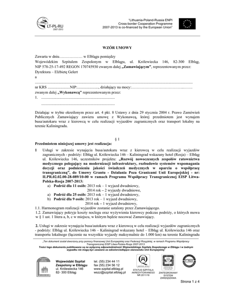 “Lithuania-Poland-Russia ENPI Cross-border Cooperation Programme 2007-2013 is co-financed by the European Union” WZÓR UMOWY Zawarta w dniu……………… w Elblągu pomiędzy Wojewódzkim Szpitalem Zespolonym w Elblągu, ul. Królewiecka 146, 82-300 Elbląg, NIP 578-25-17-492 REGON 170745930 zwanym dalej „Zamawiającym”, reprezentowanym przez: Dyrektora – Elżbietę Gelert a ................................................................................................................................................................... nr KRS .......................NIP:......................, działający na mocy:…………………………………..……. zwanym dalej „Wykonawcą” reprezentowanym przez: 1. ............................................................................ ............................................................................ Działając w trybie określonym przez art. 4 pkt. 8 Ustawy z dnia 29 stycznia 2004 r. Prawo Zamówień Publicznych Zamawiający zawiera umowę z Wykonawcą, której przedmiotem jest wynajem busa/autokaru wraz z kierowcą w celu realizacji wyjazdów zagranicznych oraz transport lokalny na terenie Kaliningradu. §1 Przedmiotem niniejszej umowy jest realizacja: Usługi w zakresie wynajęcia busa/autokaru wraz z kierowcą w celu realizacji wyjazdów zagranicznych - podróży: Elbląg ul. Królewiecka 146 – Kaliningrad wskazany hotel (Rosja) – Elbląg ul. Królewiecka 146, uczestników projektu: „Rozwój nowoczesnych zespołów ratownictwa medycznego polegający na modernizacji infrastruktury, rozbudowie systemów wspomagania decyzji oraz podniesieniu jakości świadczeń medycznych w oparciu o współpracę transgraniczną”, do Umowy Grantu - Działania Poza Granicami Unii Europejskiej - nr: ILPR.02.02.00-28-089/10-00 w ramach Programu Współpracy Transgranicznej EISP LitwaPolska-Rosja 2007-2013: a) Podróż dla 11 osób: 2013 rok – 1 wyjazd dwudniowy, 2014 rok – 2 wyjazdy dwudniowe, a) Podróż dla 25 osób: 2013 rok – 1 wyjazd dwudniowy, b) Podróż dla 9 osób: 2013 rok – 1 wyjazd dwudniowy, 2014 rok – 1 wyjazd dwudniowy, 1.1. Harmonogram realizacji wyjazdów zostanie ustalony przez Zamawiającego. 1.2. Zamawiający pokryje koszty noclegu oraz wyżywienia kierowcy podczas podróży, o których mowa w § 1 ust. 1 litera a, b, c w miejscu, w którym będzie nocować Zamawiający. 1 2. Usługi w zakresie wynajęcia busa/autokaru wraz z kierowcą w celu realizacji wyjazdów zagranicznych - podróży: Elbląg ul. Królewiecka 146 – Kaliningrad wskazany hotel – Elbląg ul. Królewiecka 146 oraz transportu lokalnego (łączenie na wszystkie wyjazdy maksymalnie do 1.000 km) na terenie Kaliningradu „Ten dokument został stworzony przy pomocy finansowej Unii Europejskiej oraz Federacji Rosyjskiej, w ramach Programu Współpracy Transgranicznej EISP Litwa-Polska-Rosja 2007-2013. Treści tego dokumentu publikowane są na wyłączną odpowiedzialność Wojewódzkiego Szpitala Zespolonego w Elblągu i w żadnym wypadku nie mogą być uważane za odzwierciedlające stanowisko Unii Europejskiej” Wojewódzki Szpital Zespolony w Elblągu ul. Królewiecka 146 82- 300 Elbląg tel. (55) 234 44 11 fax (55) 234 56 12 www.szpital.elblag.pl [email protected] STATUS SZPITALA AKREDYTOWANEGO NR 2011/18 ZINTEGROWANY SYSTEM ZARZĄDZANIA Strona 1 z 4 “Lithuania-Poland-Russia ENPI Cross-border Cooperation Programme 2007-2013 is co-financed by the European Union” uczestników projektu: „Rozwój nowoczesnych zespołów wyjazdowych poprzez modernizację infrastruktury, rozszerzenie systemów wparcie decyzji i zwiększenie korzyści medycznych w oparciu o współpracę transgraniczną” do Umowy Grantu - Działania Poza Granicami Unii Europejskiej - nr:: ILPR.02.02.00-96-030/10-00 w ramach Programu Współpracy Transgranicznej EISP Litwa-Polska-Rosja 2007-2013.: a) Podróż dla 6 osób: 2013 rok – 2 wyjazdy dwudniowe, 2014 rok – 2 wyjazdy dwudniowe, b) Podróż dla 17 osób: 2013 rok – 2 wyjazdy dwudniowe, 2014 rok – 1 wyjazdy dwudniowy, 2.1. Harmonogram realizacji poszczególnych wyjazdów zostanie ustalony przez Zamawiającego. 2.2. Wykonawca pokryje koszty noclegu oraz wyżywienia kierowcy podczas podróży, o których mowa w § 1 ust. 2 litera a, b. 2.3. Zamawiający pokryje koszty transportu lokalnego na terenie Kaliningradu podczas podróży, o których mowa w § 1 ust. 2 litera a, b (łączenie na wszystkie wyjazdy maksymalnie do 1.000 km). 3. Przedmiotowa umowa będzie realizowana pojazdami, marki: 1 .…………………………………………………………….. 2 .……….……………………………………………………. §2 Termin realizacji Czas realizacji przedmiotu zamówienia niniejszej umowy nastąpi w okresie od ………… marca 2013 roku do 31 grudnia 2014 roku. 1. Trasa wyjazdu: a) Pierwszy dzień: Elblag, ul. Królewiecka 146 (parking przy Wojewódzkim Szpitalu Zespolonym w Elblągu) np. godz. 7.00 – Kaliningrad 9 – (hotel wskazany przez Zamawiającego) – nocleg, b) Drugi dzień: Kaliningrad (hotel) np. godz. 16.00 – Elbląg ul. Królewiecka 146 (parking przy Wojewódzkim Szpitalu Zespolonym w Elblągu). 2. Wykonawca zobowiązuje się świadczyć usługę przewozu osób na jednostkowe zlecenie Zamawiającego wyrażone na piśmie lub faksem w okresie obowiązywania umowy, zgodnie z wzorem zlecenia, który stanowi załącznik nr 1 do niniejszej umowy. 3. Zgłoszenie zapotrzebowania na usługę nastąpi na piśmie lub faksem na minimum 10 dni kalendarzowych przed planowanym terminem wyjazdu (na formularzu będącym załącznikiem nr 1 do umowy), przez upoważnionego przedstawiciela ze strony Zamawiającego. §3 Obowiązki Wykonawcy: 1. W przypadku stwierdzenia awarii autokaru, Wykonawca deklaruje się do usunięcia usterki na własny koszt, w najkrótszym, możliwym czasie, jeśli natomiast usterka nie będzie możliwa do usunięcia na miejscu (do dwóch g