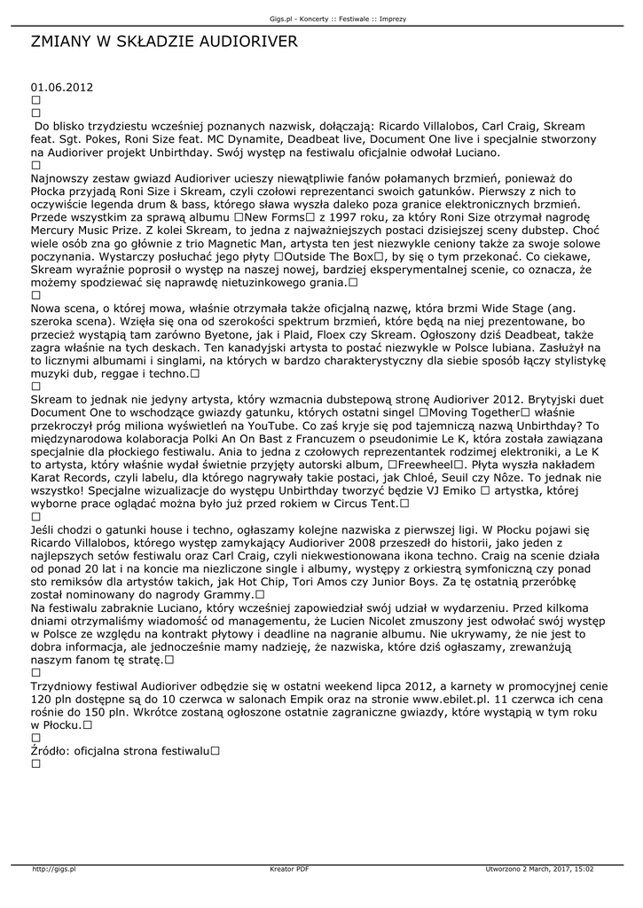 Gigs.pl - Koncerty :: Festiwale :: Imprezy ZMIANY W SKŁADZIE AUDIORIVER 01.06.2012 Do blisko trzydziestu wcześniej poznanych nazwisk, dołączają: Ricardo Villalobos, Carl Craig, Skream feat. Sgt. Pokes, Roni Size feat. MC Dynamite, Deadbeat live, Document One live i specjalnie stworzony na Audioriver projekt Unbirthday. Swój występ na festiwalu oficjalnie odwołał Luciano. Najnowszy zestaw gwiazd Audioriver ucieszy niewątpliwie fanów połamanych brzmień, ponieważ do Płocka przyjadą Roni Size i Skream, czyli czołowi reprezentanci swoich gatunków. Pierwszy z nich to oczywiście legenda drum & bass, którego sława wyszła daleko poza granice elektronicznych brzmień. Przede wszystkim za sprawą albumu New Forms z 1997 roku, za który Roni Size otrzymał nagrodę Mercury Music Prize. Z kolei Skream, to jedna z najważniejszych postaci dzisiejszej sceny dubstep. Choć wiele osób zna go głównie z trio Magnetic Man, artysta ten jest niezwykle ceniony także za swoje solowe poczynania. Wystarczy posłuchać jego płyty Outside The Box, by się o tym przekonać. Co ciekawe, Skream wyraźnie poprosił o występ na naszej nowej, bardziej eksperymentalnej scenie, co oznacza, że możemy spodziewać się naprawdę nietuzinkowego grania. Nowa scena, o której mowa, właśnie otrzymała także oficjalną nazwę, która brzmi Wide Stage (ang. szeroka scena). Wzięła się ona od szerokości spektrum brzmień, które będą na niej prezentowane, bo przecież wystąpią tam zarówno Byetone, jak i Plaid, Floex czy Skream. Ogłoszony dziś Deadbeat, także zagra właśnie na tych deskach. Ten kanadyjski artysta to postać niezwykle w Polsce lubiana. Zasłużył na to licznymi albumami i singlami, na których w bardzo charakterystyczny dla siebie sposób łączy stylistykę muzyki dub, reggae i techno. Skream to jednak nie jedyny artysta, który wzmacnia dubstepową stronę Audioriver 2012. Brytyjski duet Document One to wschodzące gwiazdy gatunku, których ostatni singel Moving Together właśnie przekroczył próg miliona wyświetleń na YouTube. Co zaś kryje się pod tajemniczą nazwą Unbirthday? To międzynarodowa kolaboracja Polki An On Bast z Francuzem o pseudonimie Le K, która została zawiązana specjalnie dla płockiego festiwalu. Ania to jedna z czołowych reprezentantek rodzimej elektroniki, a Le K to artysta, który właśnie wydał świetnie przyjęty autorski album, Freewheel. Płyta wyszła nakładem Karat Records, czyli labelu, dla którego nagrywały takie postaci, jak Chloé, Seuil czy Nôze. To jednak nie wszystko! Specjalne wizualizacje do występu Unbirthday tworzyć będzie VJ Emiko artystka, której wyborne prace oglądać można było już przed rokiem w Circus Tent. Jeśli chodzi o gatunki house i techno, ogłaszamy kolejne nazwiska z pierwszej ligi. W Płocku pojawi się Ricardo Villalobos, którego występ zamykający Audioriver 2008 przeszedł do historii, jako jeden z najlepszych setów festiwalu oraz Carl Craig, czyli niekwestionowana ikona techno. Craig na scenie działa od ponad 20 lat i na koncie ma niezliczone single i albumy, występy z orkiestrą symfoniczną czy ponad sto remiksów dla artystów takich, jak Hot Chip, Tori Amos czy Junior Boys. Za tę ostatnią przeróbkę został nominowany do nagrody Grammy. Na festiwalu zabraknie Luciano, który wcześniej zapowiedział swój udział w wydarzeniu. Przed kilkoma dniami otrzymaliśmy wiadomość od managementu, że Lucien Nicolet zmuszony jest odwołać swój występ w Polsce ze względu na kontrakt płytowy i deadline na nagranie albumu. Nie ukrywamy, że nie jest to dobra informacja, ale jednocześnie mamy nadzieję, że nazwiska, które dziś ogłaszamy, zrewanżują naszym fanom tę stratę. Trzydniowy festiwal Audioriver odbędzie się w ostatni weekend lipca 2012, a karnety w promocyjnej cenie 120 pln dostępne są do 10 czerwca w salonach Empik oraz na stronie www.ebilet.pl. 11 czerwca ich cena rośnie do 150 pln. Wkrótce zostaną ogłoszone ostatnie zagraniczne gwiazdy, które wystąpią w tym roku w Płocku. Źródło: oficjalna strona festiwalu http://gigs.pl Kreator PDF Utworzono 2 March, 2017, 15:02