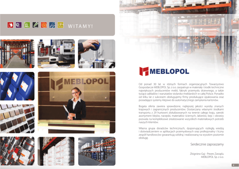 W I TA M Y ! Od ponad 30 lat w różnych formach organizacyjnych Towarzystwo Gospodarcze MEBLOPOL Sp. z o.o. zaopatruje w materiały i środki techniczne największych producentów mebli, fabryki przemysłu drzewnego, a także tysiące zakładów i warsztatów stolarsko-meblarskich w całej Polsce. Ponadto od kilku lat z sukcesem obsługujemy firmy produkujące opakowania oraz posiadające systemy klejowe do automatycznego zamykania kartonów. Bogata oferta zawiera sprawdzone, najlepszej jakości wyroby znanych krajowych i zagranicznych producentów. Dostarczany własnymi środkami transportu z 29 hurtowni zlokalizowanych na terenie całego kraju, szeroki asortyment klejów, narzędzi, materiałów ściernych, lakierów, bejc i obrzeży pozwala na kompleksowe zrealizowanie wszystkich materiałowych potrzeb naszych klientów. Własna grupa doradców technicznych, dysponujących rozległą wiedzą i doświadczeniem w aplikacjach przemysłowych oraz profesjonalny i liczny zespół handlowców gwarantują solidną i realizowaną na wysokim poziomie obsługę. Serdecznie zapraszamy Zbigniew Gaj - Prezes Zarządu MEBLOPOL Sp. z o.o. 3 INDEKS K LE JE 4 6 O B RZE ŻA 10 L AKI E RY I B E JC E 12 MAT E RI AŁY KO RE KC YJN E 15 MAT E RI A ŁY ŚC I E RN E 16 NA RZĘ DZ I A I MA SZ YNY 18 POZOS TA Ł E MAT E R I A ŁY 24 HU R TOW N IE RE GIO N AL N E 26 5 KLEJE DY S P E R S YJ N E I TO P L I W E TOPLIWE Montażowe (PVAc, PUR) Do obrzeży (EVA, PUR, APAO) • drewno twarde, drewno miękkie, drewno egzotyczne • materiały drewnopochodne • klejenie elementów lakierowanych • połączenia wodoodporne D1, D2, D3, D4 wg DIN EN 204 • klejenie na miniwczepy • klejenie korpusów i szkieletów, klejenie blokowe na styk • połączenia kołkowe • prasy z wysoką częstotliwością • krzesła, ławki, stolarka otworowa, ogólne prace stolarskie • doklejanie fizeliny Kleje z wypełniaczem i bez wypełniacza: • do krawędzi prostej • do softformingu • do wszelkiego rodzaju obrzeży: PCV, ABS, HPL, PP, papierowych • okleiny naturalnej, • melaminowych, poliestrowych i doklejek z drewna litego odpowiednie do niskiej temperatury pracy • odpowiednie do standardowych i wolnych posuwów • stolarka okienna - kantówka • ramy, schody, drzwi, meble ogrodowe • drewno wilgotne i zażywiczone • połączenia wodoodporne D3, D4 DIN EN 204 • odporność termiczna WATT 91 • kleje 1 i 2 - składnikowe Opłaszczowanie (EVA, APAO, PUR) Okleinowanie (PVAc, EVA) • okleinowanie drewna i materiałów drewnopochodnych: płyta wiórowa, MDF, HDF • oklejanie folią PVC, folią finish, okleinowanie powierzchni laminatami CPL/HPL - postforming • okleinowanie powierzchni okleiną naturalną • laminowanie w prasach na zimno i gorąco • połączenia wodoodporne D3, D4 wg DIN EN 204 KLEJE Kleje z wypełniaczem i bez wypełniacza: Do oklejania okleiną naturalną, papierem impregnowanym i bardzo cienkim papierem (tzw. japońskim) następujących elementów: • profilowanych • panelowych • z płyty wiórowej, MDF, HDF, drewna litego DO PRAS 3D Prasy membranowe (PUR) 1 i 2 - składnikowe do oklejania płyty MDF foliami termoplastycznymi na bazie PCV, ABS, PET, PP. Kleje w sztyftach (EVA) Do aplikacji pistoletem z przeznaczeniem do klejenia drewna, kartonu, metalu, tkanin, plastiku, ornamentów, ceramiki. Do zastosowania w rękodzielnictwie. 6 www.meblopol.pl www.meblopol.pl 7 KLEJE K L E J E TA P I C E R S K I E NITKI KLEJOWE D O S PA J A N I A O K L E I N KLEJE Rozpuszczalnikowe (SBS), wodne • klejenie tworzyw piankowych, formatek, materacy, waty tapicerskiej, drewna, płyty pilśniowej i wiórowej, tektury, innych materiałów tapicerskich oraz styropianu i polistyrenu, • do tworzywa sztucznego, materiałów drewnopochodnych, metalu, gumy, tkanin, filcu itp. • kleje konwencjonalne, typu High Solid i Super High Solid, • kleje łatwopalne, trudnopalne, kontaktowe (polichloropren), - jedno i dwustronne, • elastyczne spoiny klejowe KLEJE D O P O L I G R A F I I I O PA K O W A Ń Dyspersje, topliwe (PVAc, EVA, PO) Dostępne w postaci szpul: • dużych - do stacjonarnych spajarek • małych - do ręcznych spajarek oraz stołowych R Ę C Z N E S PA J A R K I O K L E I N KUPER KHL/1 KUPER KHL/2 KUPER HFZ/4 • kleje do produkcji opakowań z papieru, tektury, kartonu i tkanin (w tym opakowania do żywności) • kleje do kaszerowania tektury • do klejenia gilz tekturowych • do produkcji kątowników • do produkcji palet tekturowych • do produkcji plastra miodu • klejenie etykiet do butelek szklanych i PET • oprawa twarda • laminowanie powierzchni foliami PE • grzbiety notesów i książek (two shot) • do klejenia kalendariów, bloczków samokopiujących, druków akcydensowych, plakatów, makiet, dekoracji, tapet. 8 www.meblopol.pl www.meblopol.pl 9 OB RZE Ż A OBRZEŻA PCV OB R ZEŻA OBRZEŻA ABS Sieć naszych hurtowni zapewnia realizację zamówień na obrzeża ABS z firmy POLKEMIC we wszystkich standardowych i poza standardowych kolorach oraz standardowych rozmiarach. Dostępne są w wykończeniu powierzchni na: standard, mat, połysk, głęboko tłoczone – 3D. Rozmiary standardowe: • 22 x 0,6 • 22 x 1 • 22 x 2 • 28 x 2 • 32 x 2 • 42 x 2 Obrzeża ABS oferujemy w następujących rozmiarach: Rozmiary niestandardowe: • 19 x 0,6 • 19 x 1 • 19 x 2 • 42 x 1 • 22 x 0,45 • 22 x 0,8 • 22 x 2 • 32 x 2 • 42 x 2 • lub w dowolnej szerokości cięte z jumbo rolki Wymiary rolek ABS • 22 x 0,45 – 200 mb • 22 x 0,8 – 150 mb • 22 x 2 – 100 mb • 32 x 2 – 50 mb • 42 x 2 – 50 mb Wymiary rolek ABS wysoki połysk Wymiary rolek PCV: • 22 x 0,6 - 200 mb • 22 x 1 - 200 mb • 22 x 2 - 100 mb • 28 x 2 - 100 mb • 32 x 2 - 100 mb • 42 x 2 - 100 mb • 22 x 0,45 – 200 mb • 22 x 0,8 – 150 mb • 22 x 2 – 100 mb • 42 x 2 – 50 mb Wysoki połysk dostępny w rozmiarach • 22 x 0,45 • 22 x 0,8 • 22 x 2 • 42 x 2 Zamówieni