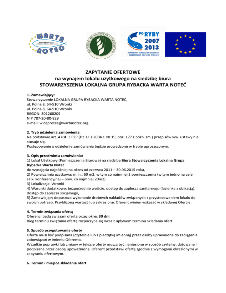 ZAPYTANIE OFERTOWE na wynajem lokalu użytkowego na siedzibę biura STOWARZYSZENIA LOKALNA GRUPA RYBACKA WARTA NOTEĆ 1. Zamawiający: Stowarzyszenie LOKALNA GRUPA RYBACKA WARTA NOTEĆ, ul. Polna 8, 64-510 Wronki ul. Polna 8, 64-510 Wronki REGON: 301268209 NIP 787-20-80-829 e-mail: [email protected] 2. Tryb udzielenia zamówienia: Na podstawie art. 4 ust. 3 PZP (Dz. U. z 2004 r. Nr 19, poz. 177 z późn. zm.) przepisów ww. ustawy nie stosuje się. Postępowanie o udzielenie zamówienia będzie prowadzone w trybie uproszczonym. 3. Opis przedmiotu zamówienia: 1) Lokal Użytkowy (Pomieszczenia Biurowe) na siedzibę Biura Stowarzyszenia Lokalna Grupa Rybacka Warta Noteć do wynajęcia najpóźniej na okres od czerwca 2011 – 30.06.2015 roku, 2) Powierzchnia użytkowa: m.in.: 60 m2, w tym co najmniej 3 pomieszczenia (w tym jedno na cele salki konferencyjnej – pow. co najmniej 20m2) 3) Lokalizacja: Wronki 4) Warunki dodatkowe: bezpośrednie wejście, dostęp do zaplecza sanitarnego (łazienka z ubikacją), dostęp do zaplecza socjalnego, 5) Zamawiający dopuszcza wykonanie drobnych nakładów związanych z przystosowaniem lokalu do swoich potrzeb. Przybliżoną wartość lub zakres prac Oferent winien wskazać w składanej Ofercie. 4. Termin związania ofertą Oferenci będą związani ofertą przez okres 30 dni. Bieg terminu związania ofertą rozpoczyna się wraz z upływem terminu składania ofert. 5. Sposób przygotowania oferty Oferta musi być podpisana (czytelnie lub z pieczątką imienną) przez osoby uprawnione do zaciągania zobowiązań w imieniu Oferenta. Wszelkie poprawki lub zmiany w tekście oferty muszą być naniesione w sposób czytelny, datowane i podpisane przez osobę upoważnioną. Oferent przedstawi ofertę zgodnie z wymogami określonymi w zapytaniu ofertowym. 6. Termin i miejsce składania ofert Oferty należy składać na adres: Stowarzyszenie LOKALNA GRUPA RYBACKA WARTA NOTEĆ, ul. Polna 8, 64-510 Wronki Osobiście lub pocztą w terminie do dnia 10.06.2011 roku do godz. 15.00 (decyduje data wpływu nie np. data stempla pocztowego) 7. Termin i miejsce wyboru oferty Wybór najkorzystniejszej oferty nastąpi po zapoznaniu się ze wszystkimi oferowanymi lokalami. Zamawiający zastrzega sobie prawo do przeprowadzenia wizji lokalnej w lokalu będącym przedmiotem oferty. 8. Sposób obliczania ceny oferty Złożona oferta winna uwzględniać cenę za m2 najmu lokalu łącznie z kosztami wody, ogrzewania, wywozu śmieci. Reszta opłat związanych z użytkowaniem lokalu ponoszona będzie wg faktycznego zużycia lub wg ceny ryczałtowej wskazanej przez Oferenta w ofercie. Cena musi być podana w PLN cyfrowo i słownie oraz być zaokrąglona do dwóch miejsc po przecinku. Cena ofertowa z podatkiem VAT. Cena musi być tylko jedna. Cena jest obowiązująca przez cały okres ważności oferty. Ofertę należy przygotować na formularzu będącym załącznikiem do niniejszego zapytania ofertowego. 9. Kryteria, które Zamawiający będzie się kierował przy wyborze oferty 1) Cena, 2) Lokalizacja, 3) Stan pomieszczeń, 4) Wysokość ewentualnych kosztów związanych z przystosowaniem lokalu. 10. Wyjaśnienie i modyfikacja zapytania ofertowego 1) Przed upływem terminu składania ofert, w szczególnie uzasadnionych przypadkach Zamawiający może zmodyfikować treść zapytania ofertowego. Dokonana modyfikacja zostanie niezwłocznie przekazana wszystkim wykonawcom, którzy otrzymali zapytanie ofertowe. Zamawiający może zamknąć postępowanie bez wybrania żadnej oferty, w przypadku, gdy żadna ze złożonych ofert nie odpowiada warunkom określonym przez Zamawiającego. 2) Zamawiający poprawi w treści oferty oczywiste omyłki pisarskie oraz omyłki rachunkowe w obliczeniu ceny, niezwłocznie zawiadamiając o tym wszystkich Wykonawców, którzy złożyli oferty. 3) Przed upływem terminu składania ofert Wykonawca może wprowadzić zmiany do złożonej oferty pod warunkiem, że Zamawiający otrzyma pisemne powiadomienie o ich wprowadzeniu. 4) Zamawiający zastrzega sobie prawo unieważnienia postępowania w każdym czasie bez podania przyczyny. 11. Informacje o formalnościach po wyborze oferty w celu realizacji dostawy Oferent, którego oferta zostanie wybrana zostanie powiadomiony pisemnym zawiadomieniem, przez Zamawiającego. Osoba uprawniona do bezpośredniego kontaktowania się z wykonawcami – Irena Wojciechowska, tel. 602755647, email: [email protected] Załącznik nr 1 do zapytania ofertowego Dane Oferenta: ........................................................... (miejscowość i data) FORMULARZ OFERTY Odpowiadając na ZAPYTANIE OFERTOWE na wynajem lokalu użytkowego na siedzibę biura STOWARZYSZENIA LOKALNA GRUPA RYBACKA WARTA NOTEĆ zgodnie z wymaganiami określonymi w zapytaniu ofertowym składamy ofertę: Położenie lokalu (adres) Charakterystyka lokalu (liczba pomieszczeń, kubatura, dostęp do zaplecza sanitarnego, socjalnego, itp.) Łączna powierzchnia użytkowa (w m2) Cena netto za m2 Wartość podatku VAT Cena brutto za m2 Miesięczna wartość czynszu (brutto) Inne opłaty związane z użytkowaniem lokalu Zakres prac koniecznych do przystosowania lokalu (jeśli dotyczy) do potrzeb Zamawiającego Oświadczamy, że zapoznaliśmy się z treścią zapytania ofertowego i nie wnosimy do niej zastrzeżeń oraz przyjmujemy warunki w niej zawarte. W przypadku przyznania nam zamówienia zobowiązujemy się do zawarcia umowy w miejscu i terminie wskazanym przez Zamawiającego. Oferta wraz z załącznikami została złożona na …… stronach. Informacje zawarte na stronach od ….. do ….. stanowią tajemnicę przedsiębiorstwa w rozumieniu ustawy o zwalczaniu nieuczciwej konkurencji i nie mogą być udostępniane przez Zamawiającego. Ponadto są zawarte w odrębnej, oznaczonej kopercie z napisem „Informacje stanowiące tajemnicę przedsiębiorstwa”. Korespondencję w sprawie przedmiotowego zamówienia proszę kierować na: osoba do kontaktu (podać adres)