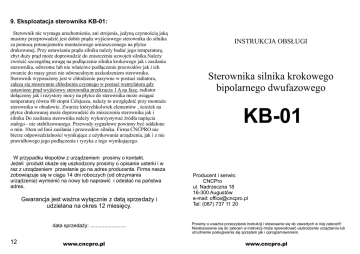 9. Eksploatacja sterownika KB-01: Sterownik nie wymaga uruchomienia, ani strojenia, jedyn czynno ci jak musimy przeprowadzi jest dobór pr du wyj ciowego sterownika do silnika za pomoc potencjometru monta owego umieszczonego na p ytce drukowanej. Przy ustawianiu pr du silnika nale y bada jego temperatur , zbyt du y pr d mo e doprowadzi do zniszczenia uzwoje silnika.Nale y zwróci szczególn uwag na pod czenie silnika krokowego jak i zasilania sterownika, odwrotne lub nie w ciwe pod czenie przewodów jak i ich zwarcie do masy grozi nie odwracalnym uszkodzeniem sterownika. Sterownik wyposa ony jest w ch odzenie pasywne w postaci radiatora, zaleca si stosowanie ch odzenia czynnego w postaci wentylatora gdy ustawiony pr d wyj ciowy sterownika przekracza 1 A na faz , radiator do czony jak i rezystory mocy na p ytce do sterownika mo e osi ga temperatur równa 80 stopni Celsjusza, nale y to uwzgl dni przy monta u sterownika w obudowie. Zwarcie którychkolwiek elementów , cie ek na ytce drukowanej mo e doprowadzi do zniszczenia sterownika jak i silnika Do zasilania sterownika nale y wykorzystywa ród a napi cia sta ego - nie stabilizowanego. Przewody sygna owe powinny by oddalone o min. 10cm od linii zasilania i przewodów silnika. Firma CNCPRO nie bierze odpowiedzialno ci wynikaj ce z u ytkowania urz dzenia, jak i z nie prawid owego jego pod czenia i ryzyka z tego wynikaj cego. W przypadku k opotów z urz dzeniem prosimy o kontakt. Je eli produkt oka e si uszkodzony prosimy o opisanie usterki i w raz z urz dzeniem przes anie go na adres producenta. Firma nasza zobowi zuje si w ci gu 14 dni roboczych (od otrzymania urz dzenia) wymieni na nowy lub naprawi i odes na pa stwa adres. Gwarancja jest wa na wy cznie z dat sprzeda y i udzielana na okres 12 miesi cy. data sprzeda y: ......................... 12 www.cncpro.pl INSTRUKCJA OBS UGI Sterownika silnika krokowego bipolarnego dwufazowego KB-01 Producent i serwis: CNCPro ul. Nadrzeczna 18 16-300 Augustów e-mail: [email protected] Tel: (087) 737 11 20 Prosimy o uwa ne przeczytanie instrukcji i stosowanie si do zawartych w niej zalece !! Niestosowanie si do zalece w instrukcji mo e spowodowa uszkodzenie urz dzenia lub utrudnienie pos ugiwania si sprz tem jak i oprogramowaniem. www.cncpro.pl 1. Opis sterownika KB-01: Prezentowany sterownik umo liwia sterowanie z pe nym lub pó -krokiem dwufazowego silnika krokowego. Umo liwia on sterowanie silnikiem bipolarnym jak i unipolarnym na trzy ro ne sposoby: cyfrowo poprzez sygna y krok/kierunek (step, dir), analogowo przez napi cie sta e z zakresu 0...5VDC, cyfrowo przez magistral RS 485 (cz sto wykorzystywan w systemach inteligentnego budynku). Zalety sterownika KB-01: - sterownik oparty o mikrokontroler RISC - sterowanie silnikami dwufazowymi bipolarnymi 4 lub 8 przewodowymi, jak i unipolarnymi 6-cio przewodowymi - zasilanie sterownika z jednego ród a napi cia - sterowanie poprzez optoizolowane sygna y kroku(CLK), kierunku (DIR) i zezwolenia(ENA) - sygnalizowanie diodami LED napi cia zasilania, i sygna ów step, dir, enable - p ynna regulacja pr du uzwojenia silnika potencjometrem - czoper pr dowy 22kHz utrzymuj cy niezmienny pr d w uzwojeniach silnika niezale nie od napi cia zasilania - brak “kulawego” pó kroku jaki wyst puje w tanich sterownikach opartych na uk adzie L297 - redukcja pr du silnika o po ow podczas postojów d szych ni 1 sekunda - sterowanie poprzez napi cie sta e z zakresu 0...5VDC umo liwia w prosty sposób za pomoc na przyk ad potencjometru sterowanie silnikiem LEWO-PRAWO z regulowan pr dko ci . - sterowanie silnikiem z wykorzystaniem magistrali RS 485, daje mo liwo ci sterowania silnikiem z komputera, sterownika PLC czy systemu inteligentnego budynku - z cza rubowe ARK u atwiaj pod czenie przewodów do sterownika - prze cznik typu DIP-switch u atwiaj cy wybór pracy sterownika 2 www.cncpro.pl - polecenie IDS001 - s y do ustawiania pr dko ci pr dko jest to liczba z zakresu 001-999 np. XS300 - sterownik X ustawiona pr dko 300, XS078sterownik X ustawiona pr dko 78. -przy wi kszych ustawionych pr dko ciach silnika by móg on je osi ga nale y zwi ksza jego obroty tzn. "rozp dzi " go do danej pr dko ci(a pod koniec wykonywanej operacji zwolni ), dlatego te dodano polecenie IDDY i IDDN, które odpowiednio w cza rozp dzanie i je wy cza (rozp dzanie i zwalnianie trwa 400 kroków silnika) np. XDY - sterownik X w czono rozp dzanie. -polecenie IDOGN, IDOGY - ustawia sterownik o danym ID by odpowiednio nie ogranicza pr du o 50% podczas postoju d szego ni 1 sekunda (IDOGN), lub by ograniczenie pr du by o aktywne (IDOGY) np. XOGY - sterownik X ograniczenie pr du w czone. -polecenie IDP0000001 i IDL0000001 s y do obracania silnika z wcze niej ustawionymi parametrami (pr dko , liczba podzia u kroków), w danym kierunku o dan liczb kroków. Analogicznie polecenie XP0004000 spowoduje e silnik wykona 4000 kroków(po kroków przy ustawionym podziale na pó krok) w danym kierunku, a polecenie XL0004000 spowoduje e silnik wykona 4000 kroków(po kroków przy ustawionym podziale na pó krok) w kierunku przeciwnym. Po ka dym dobrze wys anym poleceniu sterownik odpowie swoim numerem ID i s owem READY (gotowy), np. XREADY. ugo dlatego przy wys aniu polecenie musimy Ka de polecenie ma sta zwróci na to szczególn uwag , poniewa np. polecenie XP00409 nie zostanie zaakceptowane, w tym wypadku polecenie powinno wygl da : XP0000409. W przypadku gdy wy lemy z e polecenie sterownik "czeka" na dope nienie ilo ci znaków do danego polecenia i wykona polecenie nie poprawnie, dlatego te trzeba w takim wypadku zresetowa sterownik podaj c na lini ENA sygna 5VDC lub w czy i wy czy zasilanie na kilkana cie sekund. www.cncpro.pl 11 8. Opis sterowania przez magistral RS 485: 2. Dane techniczne: Je li wybrali my 4 sekcj prze cznika opcj sterowania magistral RS 485, po w czeniu sterownik za oguj si nast puj co: np. KB-01 www.cncpro.pl XREADY Odpowied XREADY oznacza e ID (numer indentyfikacyjny) sterownika to X. Numer indenty