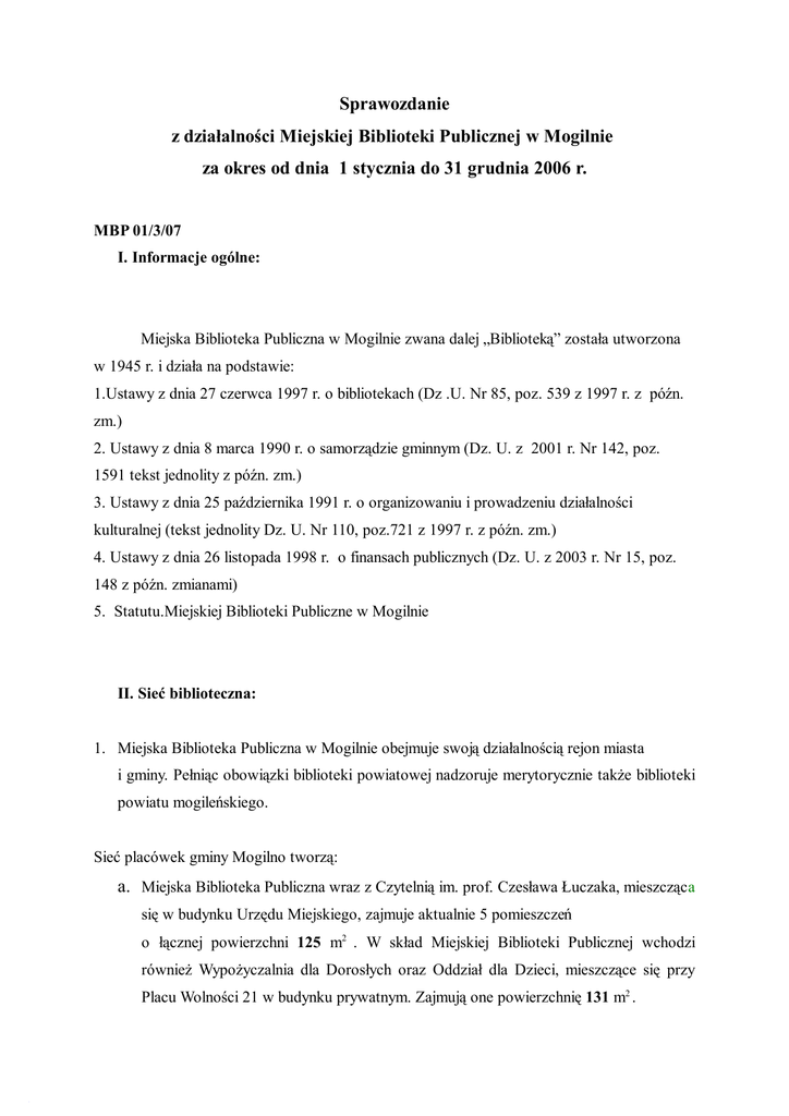 Sprawozdanie z działalności Miejskiej Biblioteki Publicznej w Mogilnie za okres od dnia 1 stycznia do 31 grudnia 2006 r. MBP 01/3/07 I. Informacje ogólne: Miejska Biblioteka Publiczna w Mogilnie zwana dalej „Biblioteką” została utworzona w 1945 r. i działa na podstawie: 1.Ustawy z dnia 27 czerwca 1997 r. o bibliotekach (Dz .U. Nr 85, poz. 539 z 1997 r. z późn. zm.) 2. Ustawy z dnia 8 marca 1990 r. o samorządzie gminnym (Dz. U. z 2001 r. Nr 142, poz. 1591 tekst jednolity z późn. zm.) 3. Ustawy z dnia 25 października 1991 r. o organizowaniu i prowadzeniu działalności kulturalnej (tekst jednolity Dz. U. Nr 110, poz.721 z 1997 r. z późn. zm.) 4. Ustawy z dnia 26 listopada 1998 r. o finansach publicznych (Dz. U. z 2003 r. Nr 15, poz. 148 z późn. zmianami) 5. Statutu.Miejskiej Biblioteki Publiczne w Mogilnie II. Sieć biblioteczna: 1. Miejska Biblioteka Publiczna w Mogilnie obejmuje swoją działalnością rejon miasta i gminy. Pełniąc obowiązki biblioteki powiatowej nadzoruje merytorycznie także biblioteki powiatu mogileńskiego. Sieć placówek gminy Mogilno tworzą: a. Miejska Biblioteka Publiczna wraz z Czytelnią im. prof. Czesława Łuczaka, mieszcząca się w budynku Urzędu Miejskiego, zajmuje aktualnie 5 pomieszczeń o łącznej powierzchni 125 m2 . W skład Miejskiej Biblioteki Publicznej wchodzi również Wypożyczalnia dla Dorosłych oraz Oddział dla Dzieci, mieszczące się przy Placu Wolności 21 w budynku prywatnym. Zajmują one powierzchnię 131 m2 . 2 b. Filia MBP w Gębicach zajmuje pomieszczenie w budynku gminnym o całkowitej powierzchni 60 m2. W 2004 r. wykonano tam wewnętrzną instalację centralnego ogrzewania, toaletę, położono płytki ceramiczne na korytarzu i w pomieszczeniu gdzie znajduje się piec c.o., przebudowano komin. c. Filia MBP w Wylatowie od dnia 1 stycznia 2004 r. zajmuje wspólnie z biblioteką szkolną lokal jednoizbowy (nasza placówka użytkuje 25 m2). Pomieszczenie mieści się w budynku szkolnym ogrzewane jest piecem kaflowo – węglowym.W związku z tym, że biblioteka mieści się w jednym pomieszczeniu z biblioteką szkolną nie widzimy możliwości wyposażenia placówki w komputer. Praca filii ogranicza się do wypożyczania książek czytelnikom i przeprowadzania zajęć dla dzieci ale ze względu na małą liczbę miejsc ( 4) liczba uczestników jest ograniczona. Na wykonywanie funkcji i zadań biblioteki powiatowej Miejska Biblioteka Publiczna w Mogilnie otrzymuje 15.000,- zł . Kwotę tę przeznaczono na zakup kserokopiarki do Miejskiej Biblioteki Publicznej w Mogilnie, zestawu komputerowego dla filii w Gębicach i za pozostałą sumę zakupiono nowości książkowe. Kserokopiarka będzie służyć mieszkańcom gminy i powiatu . Zestaw komputerowy w Gębicach umożliwi czytelnikom tej filii dostęp do bazy danych Miejskiej Biblioteki Publicznej. Nadzór nad bibliotekami powiatu polega na merytorycznej opiece oraz organizowaniu szkoleń. Miejska Biblioteka Publiczna w Mogilnie opracowuje też bibliografię zawierającą spis artykułów, dotyczących powiatu, zamieszczonych na łamach Gazety Pomorskiej i tygodnika Pałuki i Ziemia Mogileńska. Miejska Biblioteka Publiczna w Mogilnie przygotowuje także zestawienia liczbowe i sprawozdania opisowe kwartalne i roczne. Z uwagi na niewielką kwotę przekazaną z budżetu powiatu, nie zatrudniono samodzielnego instruktora wyłącznie do zadań powiatowych – ich realizacja odbywa się w ramach aktualnego stanu zatrudnienia. 2. Warunki lokalowe placówek bibliotecznych gminy Mogilno są bardzo trudne, zarówno siedziba główna jak i filie borykają się z problemem małej powierzchni i narastającą ciasnotą, w sytuacji stałego przyrostu księgozbioru. W związku z tym biblioteki mają ograniczoną możliwość prowadzenia działalności kulturalnej – w postaci spotkań autorskich czy większych wystaw.W roku 2006 biblioteka korzystała z sali Urzędu Stanu 3 Cywilnego Urzędu Miejskiego, podczas spotkań w których uczestniczyło więcej niż 30 osób. Jedynym sposobem na uzyskanie miejsca jest systematyczna selekcja księgozbioru. Księgozbiór placówek bibliotecznych gminy Mogilno jest bardzo bogaty i corocznie przybywa sporo nowych tytułów wydawniczych. Należy podkreślić, że nasza placówka plasuje się w czołówce bibliotek województwa kujawsko – pomorskiego pod względem dokonywanych zakupów książek i nowości wydawniczych. Na zakup książek oprócz środków otrzymanych od organizatora biblioteka otrzymała dotację Ministra Kultury i Dziedzictwa Narodowego w wysokości 31.610,-. Wysokość dotacji uzależniona była od wysokości środków przeznaczonych przez organizatora – im większy udział władz samorządowych tym wyższa dotacja. Najlepszym rozwiązaniem dla mogileńskiej biblioteki byłby nowy samodzielny lokal o odpowiedniej powierzchni, położony w centrum miasta i przystosowany także dla osób niepełnosprawnych. Powinien on pomieścić w całości zbiory biblioteki głównej oraz Wypożyczalni dla Dorosłych i Oddziału dla Dzieci. Obecnie wygląd placówek, mimo trudnych warunków lokalowych jest dobry. Otrzymywane środki finansowe pozwalają przeprowadzać coroczne drobne remonty, które mają wpływ na estetykę lokali. Istniejące braki w wyposażeniu placówek to brak telefonu w filii Wylatowie. Filia w Gębicach posiada 4 komputery w ramach Centrum Komunikacji Społecznej służące użytkownikom do korzystania z Internetu. Biblioteka posiada też jeden komputer na własne potrzeby z możliwością korzystania z bazy danych Miejskiej Biblioteki Publicznej. Dotąd nie rozpoczęto tworzenia bazy danych księgozbioru filii w Gębicach i Wylatowie W okresie sprawozdawczym Miejska Biblioteka Publiczna w Mogilnie zakupiła m.in. zestaw komputerowy dla Oddziału dla Dzieci oraz dla filii w Gębicach, kserokopiarkę dla Miejskiej Biblioteki Publicznej w Mogilnie, drukarkę laserową, stół i krzesła dla Wypożyczali dla Do