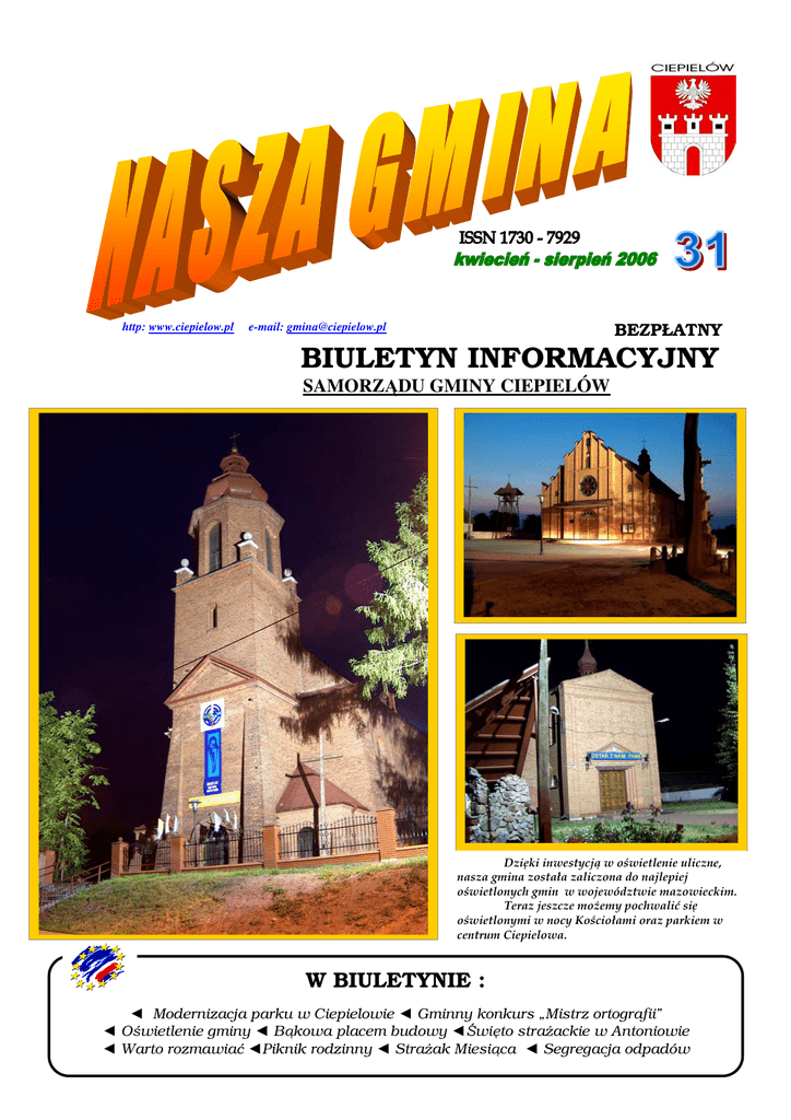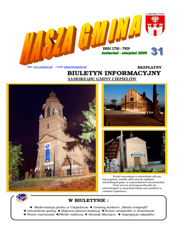 http: www.ciepielow.pl e-mail: [email protected] BEZPŁATNY BIULETYN INFORMACYJNY SAMORZĄDU GMINY CIEPIELÓW Dzięki inwestycją w oświetlenie uliczne, nasza gmina została zaliczona do najlepiej oświetlonych gmin w województwie mazowieckim. Teraz jeszcze możemy pochwalić się oświetlonymi w nocy Kościołami oraz parkiem w centrum Ciepielowa. W BIULETYNIE : ◄ Modernizacja parku w Ciepielowie ◄ Gminny konkurs „Mistrz ortografii” ◄ Oświetlenie gminy ◄ Bąkowa placem budowy ◄Święto strażackie w Antoniowie ◄ Warto rozmawiać ◄Piknik rodzinny ◄ Strażak Miesiąca ◄ Segregacja odpadów Szanowni Państwo! Już dzsiaj 2006 rok zapowiada się pod względem inwestycyjnym na przełomowy. Założenia inwestycyjne, a przede wszystkim fundusze pozyskane na ich realizację stanowią gwarancję zrównoważonego rozwoju naszej gminy. Oczywiście, nie da się w ciągu jednego roku zrobić wszystkiego. Opóźnienia infrastrukturalne są bardzo duże. Staramy się jednak zrobić najwięcej w jak najkrótszym czasie. Jeśli przeanalizuje się lata poprzednie, widać, jak duży jest postęp w zakresie rozwoju gminnej infrastruktury. Rozpoczęliśmy już budowę priorytetowego dla całej społeczności lokalnej wodociągu. Ta inwestycja jest jeszcze ważniejsza dla nas wszystkich, w obliczu kolejny raz nawiedzającej nas suszy. Daje jendak namacalny dowód, że jeżeli się chce, to można zrobić w krótkim okresie wiele dobrego. A przecież gdyby zabrakło odwagi i wiary w możliwość realizacji tak dużych przedsięwzięć, to o budowie takiego wodociągu moglibyśmy tylko pomażyć. Wcześniej taka budowa mogłaby spokojnie trwać przez całą czteroletnią kadencję. W innych gminach wykonuje się jednorazowo 8-9 km wodociągu rocznie i uważa się to za spore osiągnięcie. My tymczasem uderzamy mocno, bowiem nasz wodociąg ma mieć długość przekraczającą 40 km.To wszystko wykonujemy w ciągu jednego roku. Tylko bowiem dzięki takim zdecydowanym działaniom możemy dogonić Europę. Budując wodociąg, nie zapominamy o następnych latach.Już teraz przystępujemy do projektowania kolejnych, równie długich odcinków nowego wodociągu na rok 2007. Chcemy i budujemy kilka kilometrów dróg rocznie. Podpisaliśmy już trzy umowy na budowę nowych dróg: Stary Cie-pielów, Pcin - Kroczów, Wielgie. Czekamy na rozstrzygnięcie przetargów na drogi Kochanów - Bąkowa oraz drogi powiatowej w kierunku Podolan. Z inwestycji oświatowych zaplanowaliśmy wybudowanie dwóch podjazdów dla osób niepełnosprawnych przy szkołach w Bąkowej i Ciepielowie. Do szkół tych uczęszczają dzieci na wózkach, więc nikogo nie trzeba przekonywać do słuszności podjętych decyzji.Wybudujemy także pierwszy kompleks boisk sportowych, składający się z boiska do piłki nożnej, wielofunkcyjnego boiska do siatkówki i koszykówki oraz z kortu do tenisa ziemnego. Kontynuujemy budowę oświetlenia ulicznego, tym samym pretendując do najlepiej oświetlonej gminy wiejskiej. Oświetliliśmy dodatkowo wszystkie nasze kościoły i park w Ciepielowie - by podnieść i podkreślić prestiż tych najważniejszych miejsc w gminie. Z innych inwestycji obecnie realizowanych na uwagę zasługuje przede wszystkim park w Ciepielowie i Dom Ludowy w Wielgiem. Nie są to być może najważniejsze zadania gminy, ale cieszą, bo przecież tak długo wyczekiwali ich mieszkańcy. Pod koniec sierpnia wprowadzamy na terenie całej gminy bezpłatną segregację odpadów. Ta nowa forma zagospodarowania śmieci, polegać będzie na ich odbiorze z każdego gospodarstwa. Odbierzemy śmieci wysegregowane (plastik, szkło, makulatura) i zwykłe odpady. Wszystko to w całości dla mieszkańców gminy za darmo. Zastosowaliśmy system workowego odbioru śmieci, który już w najbliższym czasie wpełni zastąpi nieefektywny i nieekonomiczny system odbioru śmieci za pośrednictwem kontenerów. W ten sposób dostosujemy naszą gospodarkę odpadami do obowiązujących standardów, chroniąc tym samym nasze środowisko przed zanieczyszczeniem. Równie ważne co inwestycje są tematy społeczne. Przygotowujemy się do złożenia wniosków w ramach uchwalonej przez radnych Gminnej Strategii Rozwiązywania Problemów Społecznych. W tym numerze biuletynu przeczytają Państwo o zmianach w funkcjonowaniu policji. Do bezpieczeństwa naszych mieszkańców przywiązuję bardzo dużą wagę, stąd też poczynione przez samorząd kroki, by wprowadzić nowe standardy działania służb odpowiedzialnych za nasze bezpieczeństwo. Powróćmy jednak do najważniejszego tematu, czyli inwestycji. Czytając biuletyn, zwrócą Państwo z pewnością uwagę na wysokość funduszy pozyskanych na tegoroczne inwestycje. Pytanie, skąd się nagle wzięły. Odpowiedź jest prosta. Przyjęliśmy zasadę, żeby opracowywać i składać wnioski na wszystkie z możliwych programów. Na wszystko, co tylko może przynieść gminie dotacje. Stąd z roku na rok coraz lepsze wyniki w pozyskiwaniu środków. Codziennie bowiem są nowe wyzwania, nowe szansę. Na to przecież czekają wszyscy mieszkańcy. A prawdziwe możliwości dla naszej gminy otworzą się dopiero w roku 2007, kiedy Unia Europejska rozpocznie kolejny okres wydatkowania środków na poprawę infrastruktury Wiedząc o tym, już teraz przygotowujemy kolejne wnioski, by były gotowe na czas ogłoszenia naborów na nowe unijne programy. Musimy wykorzystać wszystkie możliwości, wszystkie szansę, aby nasza gmina, rozwijała się szybciej i lepiej, wtedy i Państwa zadowolenie będzie większe, a o to nam wszystkim przecież chodzi. Artur Szewczyk wójt gminy Ciepielów 2 Od lewej: zastępca Komendanta Powiatowego Policji nadkom. Jarosław Binięda, Komendant Powiatowy mł. insp. Janusz Koziarski, Wójt Gminy Ciepielów Artur Szewczyk Zgłosiliśmy klęskę suszy Najlepszy rok inwestycyjny w historii Gminy Takiego roku pod względem inwestycyjny jak obecny nie mieliśmy do tej pory w ca