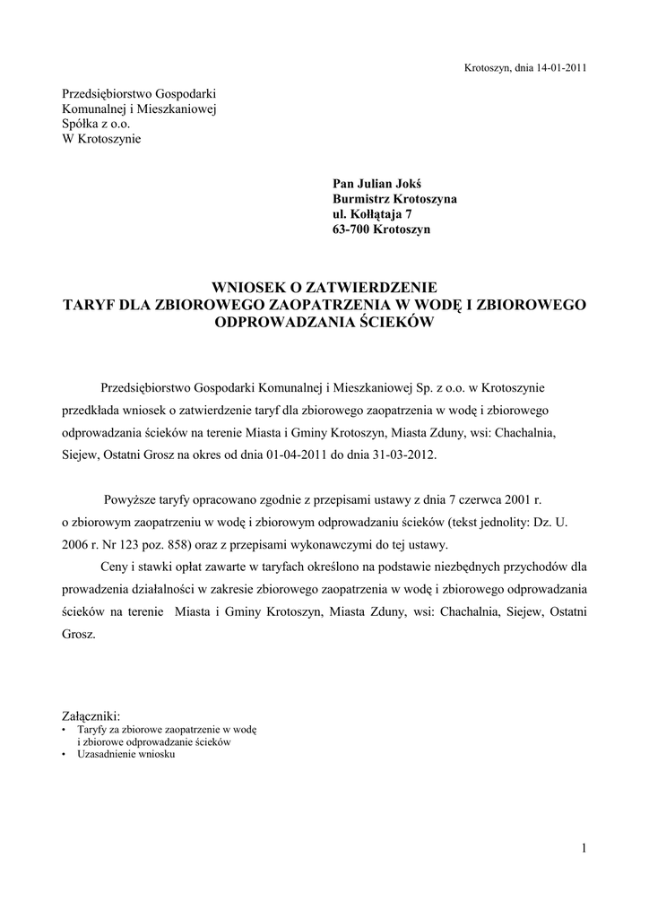 Krotoszyn, dnia 14-01-2011 Przedsiębiorstwo Gospodarki Komunalnej i Mieszkaniowej Spółka z o.o. W Krotoszynie Pan Julian Jokś Burmistrz Krotoszyna ul. Kołłątaja 7 63-700 Krotoszyn WNIOSEK O ZATWIERDZENIE TARYF DLA ZBIOROWEGO ZAOPATRZENIA W WODĘ I ZBIOROWEGO ODPROWADZANIA ŚCIEKÓW Przedsiębiorstwo Gospodarki Komunalnej i Mieszkaniowej Sp. z o.o. w Krotoszynie przedkłada wniosek o zatwierdzenie taryf dla zbiorowego zaopatrzenia w wodę i zbiorowego odprowadzania ścieków na terenie Miasta i Gminy Krotoszyn, Miasta Zduny, wsi: Chachalnia, Siejew, Ostatni Grosz na okres od dnia 01-04-2011 do dnia 31-03-2012. Powyższe taryfy opracowano zgodnie z przepisami ustawy z dnia 7 czerwca 2001 r. o zbiorowym zaopatrzeniu w wodę i zbiorowym odprowadzaniu ścieków (tekst jednolity: Dz. U. 2006 r. Nr 123 poz. 858) oraz z przepisami wykonawczymi do tej ustawy. Ceny i stawki opłat zawarte w taryfach określono na podstawie niezbędnych przychodów dla prowadzenia działalności w zakresie zbiorowego zaopatrzenia w wodę i zbiorowego odprowadzania ścieków na terenie Miasta i Gminy Krotoszyn, Miasta Zduny, wsi: Chachalnia, Siejew, Ostatni Grosz. Załączniki: • • Taryfy za zbiorowe zaopatrzenie w wodę i zbiorowe odprowadzanie ścieków Uzasadnienie wniosku 1 Załącznik nr l do wniosku o zatwierdzenie taryf dla zbiorowego zaopatrzenia w wodę i zbiorowego odprowadzania ścieków z dnia 14.01.2011r TARYFY DLA ZBIOROWEGO ZAOPATRZENIA W WODĘ I ZBIOROWEGO ODPROWADZANIA ŚCIEKÓW zatwierdzone uchwałą........................................................... Nr........................................ z dnia .......................................... Taryfy obowiązują od dnia 1 kwietnia 2011 roku Ceny i stawki opłat zostały opublikowane w prasie lokalnej. Treść taryfy dostępna jest w internecie na stronach Biuletynu Informacji Publicznej Przedsiębiorstwa Gospodarki Komunalnej i Mieszkaniowej Sp. z o.o. w Krotoszynie oraz Urzędu Miejskiego w Krotoszynie. Z dniem wejścia w życie niniejszej taryfy przestają obowiązywać postanowienia poprzedniej taryfy. 2 Spis treści: 1. Informacje ogólne 2. Rodzaj prowadzonej działalności 3. Taryfowe grupy odbiorców usług 4. Rodzaje i wysokość cen i stawek opłat 4.1. Wysokość cen i stawek opłat za dostarczoną wodę 4.2. Wysokość cen i stawek opłat za odebrane ścieki 5. Warunki rozliczeń z uwzględnieniem wyposażenia nieruchomości w przyrządy i urządzenia pomiarowe 6. Warunki stosowania cen i stawek opłat 6.1. Zakres świadczonych usług dla poszczególnych taryfowych grup odbiorców 6.1.1. Zaopatrzenie w wodę 6.1.2. Odprowadzanie ścieków 6.2.Standardy jakościowe obsługi usług 3 1. Informacje ogólne Niniejsze taryfy stanowią zestawienie cen i stawek opłat za zbiorowe zaopatrzenie w wodę i zbiorowe odprowadzanie ścieków oraz określają warunki ich stosowania obowiązujące na terenie: • Miasta i Gminy Krotoszyn w zakresie zbiorowego zaopatrzenia w wodę i zbiorowego odprowadzania ścieków, • Miasta Zduny, wsi: Chachalnia, Siejew, Ostatni Grosz w zakresie zbiorowego zaopatrzenia w wodę, na okres 12 miesięcy : od dnia 1 kwietnia 2011r. do dnia 31 marca 2012r. Taryfy zostały opracowane na podstawie przepisów ustawy z dnia 7 czerwca 2001 r. o zbiorowym zaopatrzeniu w wodę i zbiorowym odprowadzaniu ścieków (t.jedn. Dz. U. z 2006 r. Nr 123, póz. 858), zwanej dalej Ustawą oraz Rozporządzeniem Ministra Budownictwa w sprawie określenia taryf, wzoru wniosku o zatwierdzenie taryf oraz warunków rozliczeń za zbiorowe zaopatrzenie w wodę i zbiorowe odprowadzanie ścieków (Dz. U. Nr 127 poz. 886 z 2006 r.),, zwanego dalej Rozporządzeniem. Taryfowe ceny i stawki opłat dotyczą wszystkich odbiorców usług w zakresie dostawy wody i odbioru ścieków świadczonych przez przedsiębiorstwo wodociągowo-kanalizacyjne, z wyłączeniem odbiorców i dostawców hurtowych, usług świadczonych przy użyciu wozów asenizacyjnych. Zgodnie z art. 22 ustawy, taryfy obejmują także cenę za zużytą do zasilania publicznych fontann i na cele przeciwpożarowe oraz do zraszania publicznych ulic i terenów zielonych. 2. Rodzaj prowadzonej działalności Przedsiębiorstwo wodociągowo-kanalizacyjne prowadzi działalność w zakresie zbiorowego zaopatrzenia w wodę i zbiorowego odprowadzania ścieków na na podstawie zezwolenia wydanego Decyzją burmistrza Krotoszyna Nr GI-K-7010/2/02 z dnia11 grudnia 2002 roku oraz porozumienia międzygminnego zawartego pomiędzy Miastem i Gminą Krotoszyn a Gminą i Miastem Zduny w dniu 17 maja 2004 roku. Zgodnie z zezwoleniem przedmiot działalności przedsiębiorstwa stanowi: • w zakresie zbiorowego zaopatrzenia w wodę: ujmowanie, uzdatnianie i dostarczanie wody usługobiorcom, z którymi zawarto umowę, za pomocą urządzeń wodociągowych, • w zakresie zbiorowego odprowadzania ścieków: oczyszczanie i odprowadzanie ścieków dostarczonych przez usługobiorców, z którymi zawarto umowy, za pomocą urządzeń kanalizacyjnych. 4 3. Taryfowe grupy odbiorców usług Taryfowa grupa odbiorców usług obejmuje odbiorców wyodrębnionych na podstawie charakterystyki zużycia wody lub odprowadzanych ścieków, warunków zbiorowego zaopatrzenia w wodę i zbiorowego odprowadzania ścieków, a także na podstawie sposobu rozliczeń za świadczone usługi. Uwzględniając zróżnicowanie kosztów zaopatrzenia w wodę i odprowadzania ścieków oraz sposób korzystania z urządzeń wodociągowych i kanalizacyjnych, dokonano podziału odbiorców usług na następujące taryfowe grupy odbiorców usług: Lp. Taryfowa grupa Charakterystyka taryfowej grupy odbiorców usług odbiorców usług 1. Zaopatrzenie w wodę 1. Grupa 1 Właściciele i zarządcy oraz posiadający inny tytuł prawny do nieruchomości, rozliczani za ilość dostarczonej wody ustaloną w oparciu o wskazania wodomierza głównego. Odbiorcy wody przeznaczonej do spożycia lub na cele socjalno-bytowe np. gospodarstwa domowe, placó