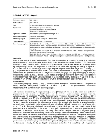 Centralna Baza Orzeczeń Sądów Administracyjnych Str 1 / 10 II SA/Łd 1075/15 - Wyrok Data orzeczenia 2016-03-04 Data wpływu 2015-12-16 Sąd Wojewódzki Sąd Administracyjny w Łodzi Sędziowie Anna Stępień /przewodniczący/ Arkadiusz Blewązka /sprawozdawca/ Sławomir Wojciechowski Symbol z opisem 6139 Inne o symbolu podstawowym 613 Hasła tematyczne Ochrona środowiska Skarżony organ Samorządowe Kolegium Odwoławcze Treść wyniku Uchylono decyzję I i II instancji Powołane przepisy Dz.U. 2013 nr 0 poz 1235; art. 59 ust.1 pkt 2, art. 63 ust.1 i 2, art. 82, art. 84; Ustawa z dnia 3 października 2008 r. o udostępnianiu informacji o środowisku i jego ochronie, udziale społeczeństwa w ochronie środowiska oraz o ocenach oddziaływania na środowisko - tekst jednolity. Dz.U. 2016 nr 0 poz 23; art. 107; Ustawa z dnia 14 czerwca 1960 r. Kodeks postępowania administracyjnego - tekst jednolity Dz.U. 2012 nr 0 poz 270; art. 145 par. 1 pkt 1 a i c w zw. z art. 135, art. 151; Ustawa z dnia 30 sierpnia 2002 r. Prawo o postępowaniu przed sądami administracyjnymi - tekst jednolity. Sentencja Dnia 4 marca 2016 roku Wojewódzki Sąd Administracyjny w Łodzi – Wydział II w składzie następującym: Przewodnicząca Sędzia NSA Anna Stępień Sędziowie Sędzia WSA Arkadiusz Blewązka (spr.) Sędzia WSA Sławomir Wojciechowski Protokolant sekretarz sądowy Anna Łyżwa po rozpoznaniu na rozprawie w dniu 4 marca 2016 roku sprawy ze skargi A Spółka z o.o. z siedzibą w W. na decyzję Samorządowego Kolegium Odwoławczego w Ł. z dnia [...] nr [...] w przedmiocie stwierdzenia braku potrzeby przeprowadzenia oceny oddziaływania na środowisko dla przedsięwzięcia 1. uchyla zaskarżoną decyzję oraz poprzedzającą ją decyzję Prezydenta Miasta Ł. nr [...] z dnia [...]; 2. oddala skargę w pozostałym zakresie; 3. zasądza od Samorządowego Kolegium Odwoławczego w Ł. na rzecz strony skarżącej A Spółka z o.o. z siedzibą w W. kwotę 500 (pięćset) złotych tytułem zwrotu kosztów postępowania. LS Uzasadnienie Zaskarżoną decyzją z dnia [...] nr [...] Samorządowe Kolegium Odwoławcze w Ł. utrzymało w mocy decyzję Prezydenta Miasta Ł. z dnia [...] nr [...] w przedmiocie określenia środowiskowych uwarunkowań przedsięwzięcia. Jak wynika z akt sprawy, decyzją z dnia [...] nr [...] Prezydent Miasta Ł. stwierdził brak potrzeby przeprowadzenia oceny oddziaływania na środowisko planowanego przedsięwzięcia, polegającego na realizacji "Punktu Przetwarzania Tworzyw Sztucznych" na działce 63/13 obręb [...] przy ul A nr 17 w Ł. oraz określił środowiskowe uwarunkowania dla przedmiotowego przedsięwzięcia. W punkcie II decyzji organ określił rodzaj i charakterystykę przedsięwzięcia. W tym zakresie wskazał, że planowana inwestycja wiązać się będzie z przeniesieniem prowadzonej działalności z nieruchomości przy ulicy B nr 147 w Ł. na nieruchomość przy ulicy A nr 17 w Ł. Zmiana lokalizacji prowadzonej działalności ma na celu zwiększenie ilości przetwarzanych odpadów z tworzyw sztucznych, sprawniejsze i szybsze przetwarzanie odpadów z tworzyw sztucznych, poprawę warunków bezpieczeństwa i higieny pracy, warunków socjalno-bytowych załogi, ułatwienie obsługi parku maszynowego oraz podniesienie wizerunku firmy. W ramach planowanej inwestycji przewiduje się remont i adaptację istniejącej hali produkcyjno-magazynowej w zakresie niezbędnym do instalacji maszyn i urządzeń, wykonanie przyłączy elektroenergetycznych do podłączenia maszyn i urządzeń, remont pomieszczenia biurowego i pomieszczeń socjalnych dla pracowników. Dalej organ wskazał, że dostarczane odpady będą podlegały procesowi odzysku R-3 recykling lub regeneracji 2016-04-27 09:08 Centralna Baza Orzeczeń Sądów Administracyjnych Str 2 / 10 substancji organicznych. W wyniku przetwarzania odpadów będą powstawały produkty, które będą spełniały wymagania odbiorców oraz odpady z procesu segregacji, które będą przekazywane uprawnionym odbiorcom odpadów do odzysku. W punkcie III decyzji Prezydent Miasta Ł. określił warunki wykorzystania terenu w fazie realizacji i eksploatacji ze szczególnym uwzględnieniem konieczności ochrony cennych wartości przyrodniczych, zasobów naturalnych i zabytków oraz ograniczenia uciążliwości dla terenów sąsiednich. Organ wskazał następnie, że realizacja przedsięwzięcia przed uzyskaniem pozwolenia na wytwarzanie odpadów nie wymaga przeprowadzenia ponownej oceny oddziaływania na środowisko ani postępowania w sprawie transgranicznego oddziaływania na środowisko (pkt IV decyzji). Poza tym Prezydent Miasta określił, że realizacja przedsięwzięcia wymaga zastosowania materiałów z atestem (pkt V decyzji). W motywach rozstrzygnięcia Prezydent Miasta wyjaśnił, że postępowanie w sprawie wydania decyzji o środowiskowych uwarunkowaniach realizacji przedmiotowego przedsięwzięcia wszczęto na wniosek złożony w dniu 2 czerwca 2015r. przez A.K. i M. N. Wskazał, że planowane przedsięwzięcie na podstawie § 3 ust. 1 pkt 80 rozporządzenia z dnia 9 listopada 2010r. w sprawie przedsięwzięć mogących znacząco oddziaływać na środowisko (Dz. U. z 2016r. poz. 71), dalej powoływanego jako "rozporządzenie", jako instalacje związane z odzyskiem lub unieszkodliwianiem odpadów, zaliczone jest do przedsięwzięć mogących potencjalnie znacząco oddziaływać na środowisko. Realizacja ww. zamierzenia wymaga uzyskania decyzji o środowiskowych uwarunkowaniach ze względu treść art. 71 ust. 2 pkt 2 ustawy z dnia 3 października 2008r. o udostępnianiu informacji o środowisku i jego ochronie, udziale społeczeństwa w ochronie środowiska oraz o ocenach oddziaływania na środowisko (Dz.U. z 2013r. poz.1235), dalej powoływanej jako "ustawa". Następnie organ orzekający wyjaśnił, że [...] Dyrektor Ochrony Środowiska w Ł. opinią z dnia [...]. znak: [...] nie stwierdził konieczności przeprowadzenia o