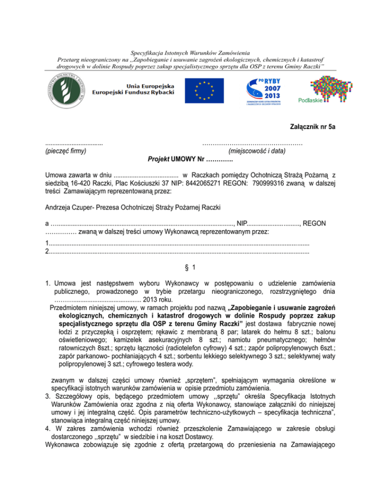Specyfikacja Istotnych Warunków Zamówienia Przetarg nieograniczony na ,,Zapobieganie i usuwanie zagrożeń ekologicznych, chemicznych i katastrof drogowych w dolinie Rospudy poprzez zakup specjalistycznego sprzętu dla OSP z terenu Gminy Raczki” Załącznik nr 5a ................................. (pieczęć firmy) ………………………………………… (miejscowość i data) Projekt UMOWY Nr …………. Umowa zawarta w dniu ..................................... w Raczkach pomiędzy Ochotniczą Strażą Pożarną z siedzibą 16-420 Raczki, Plac Kościuszki 37 NIP: 8442065271 REGON: 790999316 zwaną w dalszej treści Zamawiającym reprezentowaną przez: Andrzeja Czuper- Prezesa Ochotniczej Straży Pożarnej Raczki a …....................................................................................................., NIP.............................., REGON …………… zwaną w dalszej treści umowy Wykonawcą reprezentowanym przez: 1..................................................................................................................................................... 2..................................................................................................................................................... § 1 1. Umowa jest następstwem wyboru Wykonawcy w postępowaniu o udzielenie zamówienia publicznego, prowadzonego w trybie przetargu nieograniczonego, rozstrzygniętego dnia ………....................................... 2013 roku. Przedmiotem niniejszej umowy, w ramach projektu pod nazwą „Zapobieganie i usuwanie zagrożeń ekologicznych, chemicznych i katastrof drogowych w dolinie Rospudy poprzez zakup specjalistycznego sprzętu dla OSP z terenu Gminy Raczki” jest dostawa fabrycznie nowej łodzi z przyczepką i osprzętem; rękawic z membraną 8 par; latarek do hełmu 8 szt.; balonu oświetleniowego; kamizelek asekuracyjnych 8 szt.; namiotu pneumatycznego; hełmów ratowniczych 8szt.; sprzętu łączności (radiotelefon cyfrowy) 4 szt.; zapór polipropylenowych 6szt.; zapór parkanowo- pochłaniających 4 szt.; sorbentu lekkiego selektywnego 3 szt.; selektywnej waty polipropylenowej 3 szt.; cyfrowego testera wody. zwanym w dalszej części umowy również „sprzętem”, spełniającym wymagania określone w specyfikacji istotnych warunków zamówienia w opisie przedmiotu zamówienia. 3. Szczegółowy opis, będącego przedmiotem umowy ,,sprzętu” określa Specyfikacja Istotnych Warunków Zamówienia oraz zgodna z nią oferta Wykonawcy, stanowiące załączniki do niniejszej umowy i jej integralną część. Opis parametrów techniczno-użytkowych – specyfikacja techniczna”, stanowiąca integralną część niniejszej umowy. 4. W zakres zamówienia wchodzi również przeszkolenie Zamawiającego w zakresie obsługi dostarczonego ,,sprzętu” w siedzibie i na koszt Dostawcy. Wykonawca zobowiązuje się zgodnie z ofertą przetargową do przeniesienia na Zamawiającego własności ,,sprzętu” oraz do wydania go Zamawiającemu, a Zamawiający zobowiązuje się do odebrania przedmiotu zamówienia i zapłaty Wykonawcy ceny wskazanej w § 3, po sprawdzeniu zgodności z wymaganiami Zamawiającego i sprawdzeniu stanu technicznego ,,sprzętu”. 5. Wykonawca oświadcza, że ,,sprzęt” stanowi jego własność i jest wolny od wad prawnych i fizycznych oraz nie ciążą na nim prawa osób trzecich oraz że nie toczy się żadne postępowanie, którego przedmiotem jest ten ,,sprzęt”. 6. Wykonawca zobowiązany będzie dołączyć do ,,sprzętu” komplet dokumentów: kartę pojazdu, kartę gwarancyjną, instrukcje obsługi w języku polskim oraz inne wymagane prawem dokumenty. 7. Zamówienie jest realizowane w ramach Osi Priorytetowej 4 - ,,Zrównoważony rozwój sektora rybołówstwa i nadbrzeżnych obszarów rybackich 2007-2013” w ramach Środka 4.1. „Rozwój obszarów zależnych od rybactwa z wyłączeniem realizacji operacji polegających na funkcjonowaniu lokalnej grupy rybackiej (LGR) oraz nabywaniu umiejętności o aktywizacji lokalnych społeczności. §2 1. Przedmiot dostawy z wymaganymi dokumentami Wykonawca dostarczy do siedziby Zamawiającego w terminie do dnia 05.09.2013 r. Za datę wykonania zamówienia uważa się datę podpisania przez przedstawicieli Zamawiającego i Wykonawcy protokołu odbioru bez zastrzeżeń. 2. W ramach odbioru Zamawiający zastrzega sobie prawo przeprowadzenia prób technicznych ,,sprzętu”, których wyniki zostaną uwzględnione w protokole odbioru. W przypadku stwierdzenia przy odbiorze wad i usterek w protokole wyznaczy się sposób i termin ich usunięcia. §3 1. Za wykonanie przedmiotu umowy strony ustalają wynagrodzenie całkowite ryczałtowe zgodne ze złożoną przez Wykonawcę ofertą przetargową, w kwocie: ……………….. zł brutto: (słownie: ………………..……...........……………..............zł), obejmującą cenę netto …………………….. zł oraz podatek wg VAT ……%, w kwocie …………….. zł . 2. Wynagrodzenie ryczałtowe, o którym mowa w ust 1 umowy, obejmuje wszystkie koszty niezbędne do całkowitego i efektywnego wykonania przedmiotu umowy. 3. Niedoszacowanie, pominięcie oraz brak rozpoznania zakresu przedmiotu umowy przez Wykonawcę nie może być podstawą do żądania zmiany wynagrodzenia ryczałtowego określonego w ust. 1 niniejszego paragrafu. 4. Płatność za zrealizowanie przedmiotu umowy będzie dokonana przelewem na wskazany przez Wykonawcę rachunek bankowy w terminie 14 dni od daty otrzymania przez Zamawiającego poprawienie wystawionej faktury/rachunku. 5. Podstawę wystawienia faktury/rachunku stanowi podpisany przez obie strony protokół odbioru ,,sprzętu” wraz z wyposażeniem oraz dokumentacji. §4 1. Odbiór przedmiotu umowy odbędzie się w siedzibie Zamawiającego. 2. Wykonawca poinformuje Zamawiającego z 3 dniowym wyprzedzeniem o planowanym terminie dostawy. 3. Odbiór przedmiotu umowy stwierdzony będ