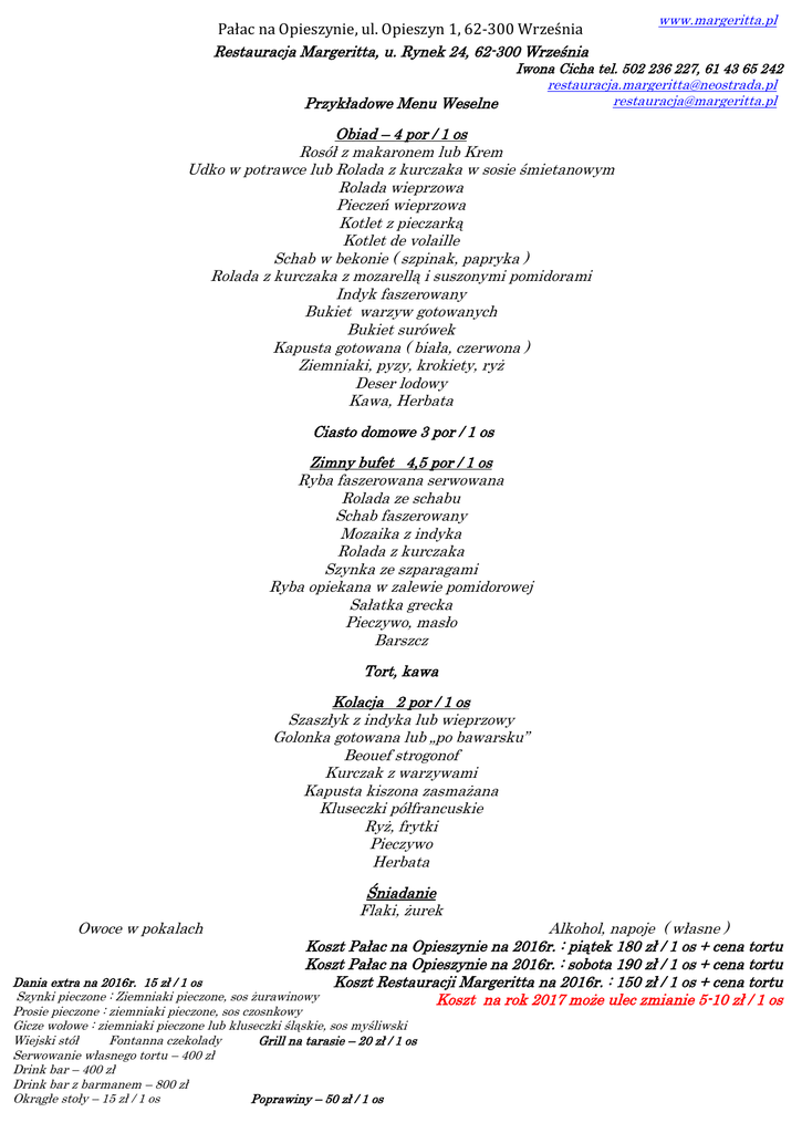 Pałac na Opieszynie, ul. Opieszyn 1, 62-300 Września Restauracja Margeritta, u. Rynek 24, 62-300 Września Przykładowe Menu Weselne www.margeritta.pl Iwona Cicha tel. 502 236 227, 61 43 65 242 [email protected] [email protected] Obiad – 4 por / 1 os Rosół z makaronem lub Krem Udko w potrawce lub Rolada z kurczaka w sosie śmietanowym Rolada wieprzowa Pieczeń wieprzowa Kotlet z pieczarką Kotlet de volaille Schab w bekonie ( szpinak, papryka ) Rolada z kurczaka z mozarellą i suszonymi pomidorami Indyk faszerowany Bukiet warzyw gotowanych Bukiet surówek Kapusta gotowana ( biała, czerwona ) Ziemniaki, pyzy, krokiety, ryż Deser lodowy Kawa, Herbata Ciasto domowe 3 por / 1 os Zimny bufet 4,5 por / 1 os Ryba faszerowana serwowana Rolada ze schabu Schab faszerowany Mozaika z indyka Rolada z kurczaka Szynka ze szparagami Ryba opiekana w zalewie pomidorowej Sałatka grecka Pieczywo, masło Barszcz Tort, kawa Kolacja 2 por / 1 os Szaszłyk z indyka lub wieprzowy Golonka gotowana lub „po bawarsku” Beouef strogonof Kurczak z warzywami Kapusta kiszona zasmażana Kluseczki półfrancuskie Ryż, frytki Pieczywo Herbata Owoce w pokalach Śniadanie Flaki, żurek Alkohol, napoje ( własne ) Koszt Pałac na Opieszynie na 2016r. : piątek 180 zł / 1 os + cena tortu Koszt Pałac na Opieszynie na 2016r. : sobota 190 zł / 1 os + cena tortu Dania extra na 2016r. 15 zł / 1 os Koszt Restauracji Margeritta na 2016r. : 150 zł / 1 os + cena tortu Szynki pieczone : Ziemniaki pieczone, sos żurawinowy Koszt na rok 2017 może ulec zmianie 5-10 zł / 1 os Prosie pieczone : ziemniaki pieczone, sos czosnkowy Gicze wołowe : ziemniaki pieczone lub kluseczki śląskie, sos myśliwski Wiejski stół Fontanna czekolady Grill na tarasie – 20 zł / 1 os Serwowanie własnego tortu – 400 zł Drink bar – 400 zł Drink bar z barmanem – 800 zł Okrągłe stoły – 15 zł / 1 os Poprawiny – 50 zł / 1 os