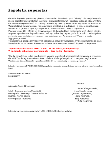 Zapolska superstar Gabrielę Zapolską pamiętamy głównie jako autorkę „Moralności pani Dulskiej”, ale swoją biografią, ilością pozostawionych tekstów, talentem i skalą zainteresowań – mogłaby obdzielić kilku artystów. Chcemy o niej opowiedzieć, bo czujemy, że wiele jej zawdzięczamy, może więcej niż Mickiewiczom, Wyspiańskim i Sienkiewiczom. Nie opowiadała o historii, a o historiach – o tym, co wspólne nam wszystkim, o prostych, życiowych sprawach, śmiesznostkach, małych tragediach. Przełom wieku XIX i XX nie był łatwym czasem dla kobiety, która postanowiła mieć własne zdanie. Artystka wyśmiewana, bagatelizowana, walcząc z chorobą i nędzą, parła do przodu. Swoim życiem postawiła nam niesłabnące wyzwanie – nie poddawać się. Awanturować. Walczyć o swoje. Wygrywać porażki. Transmitowała głos pokrzywdzonych. Piętnowała krzywdy wyrządzone wykluczonym swojego czasu. Nie oglądała się na resztę. Traktowała wolność jako najwyższą wartość. Zapolska – Superstar. Zapraszamy 4 listopada 2016r. o godz. 19.00. Bilety już w sprzedaży. W spektaklu zobaczymy piotrkowiankę – Sarę Celler – Jezierską. "Kto by pomyślał, że jedna z najlepszych ostatnio teatralnych niespodzianek powstanie z życiorysu Gabrieli Zapolskiej. Aneta Groszyńska zrobiła w Wałbrzychu spektakl o niespełnionej karierze. Wariacja na temat biografii z przełomu XIX i XX w. okazała się sceniczną petardą.” http://wyborcza.pl/1,75410,19204039,zapolska-superstar-niespelniona-kariera-pisarki-jako-teatralna. html Spektakl trwa 90 minut bez przerwy obsada reżyseria: Aneta Groszyńska tekst i dramaturgia: Jan Czapliński scenografia i kostiumy: Tomasz Walesiak muzyka: Marcin Liweń choreografia: Katarzyna https://www.youtube.com/watch?v=J5k-bXlZ54k&feature=youtu.be Sara Celler-Jezierska, Irena Sierakowska, Joanna Łaganowska, Rafał Kosowski, Filip Perkowski Piotr Mokrzycki
