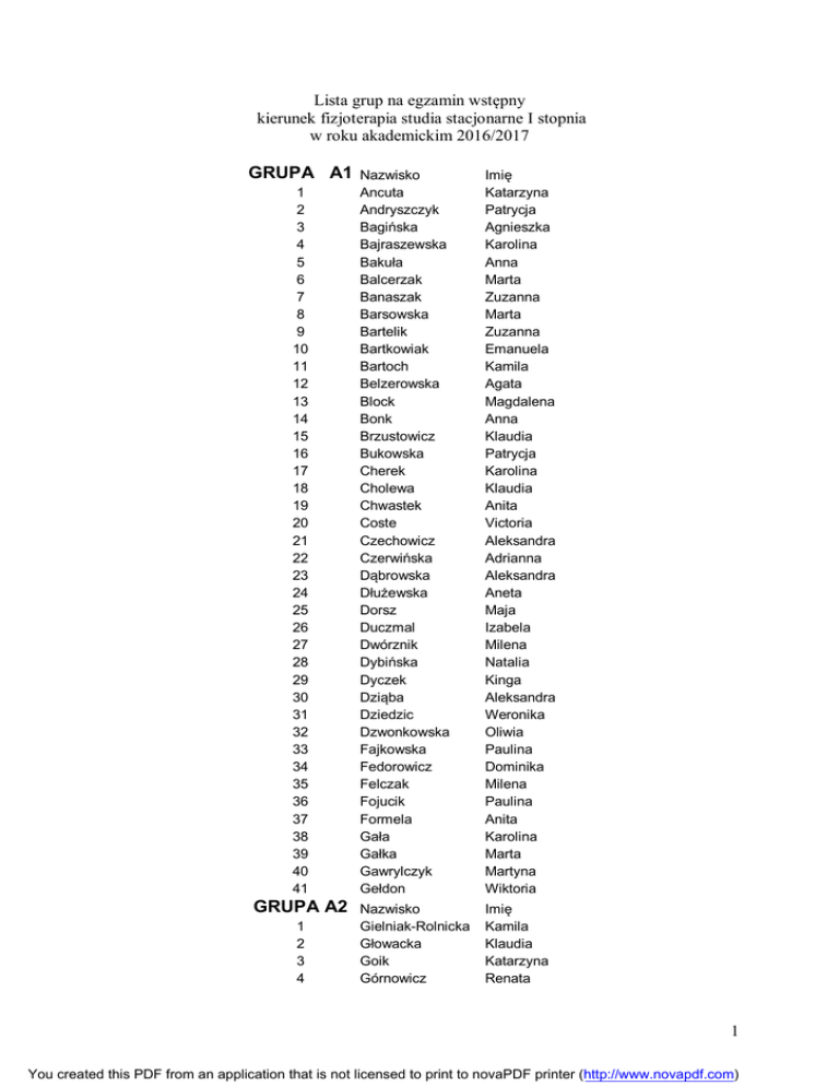 lista grup na egzamin wstępny kierunek fizjoterapia studia I stopnie